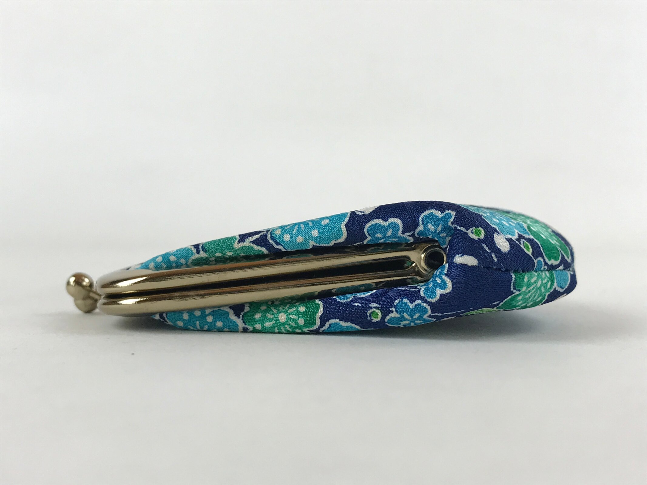 This is a small Japanese coin purse with a “gamaguchi” kiss-lock clasp. It is made of textured silk with a blue and green floral pattern. It is too small for cards, however perfect for coins and folded cash bills. Original box is included.