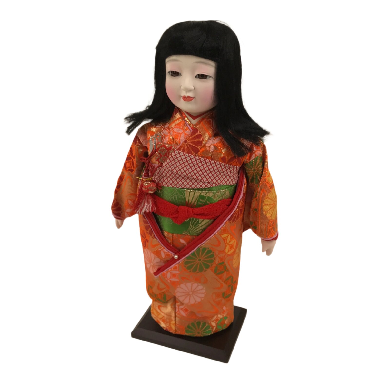 This is a vintage Japanese Ichimatsu ningyo. This decorative doll represents a girl with long black hair wearing a beautiful long-sleeved kimono, Furisode. The silk fabric kimono is orange with a chrysanthemum and stream design. The doll wears a green Obi and a red Obijime, and has a wallet and a Kanzashi on her chest. It is housed in an original paper box.
