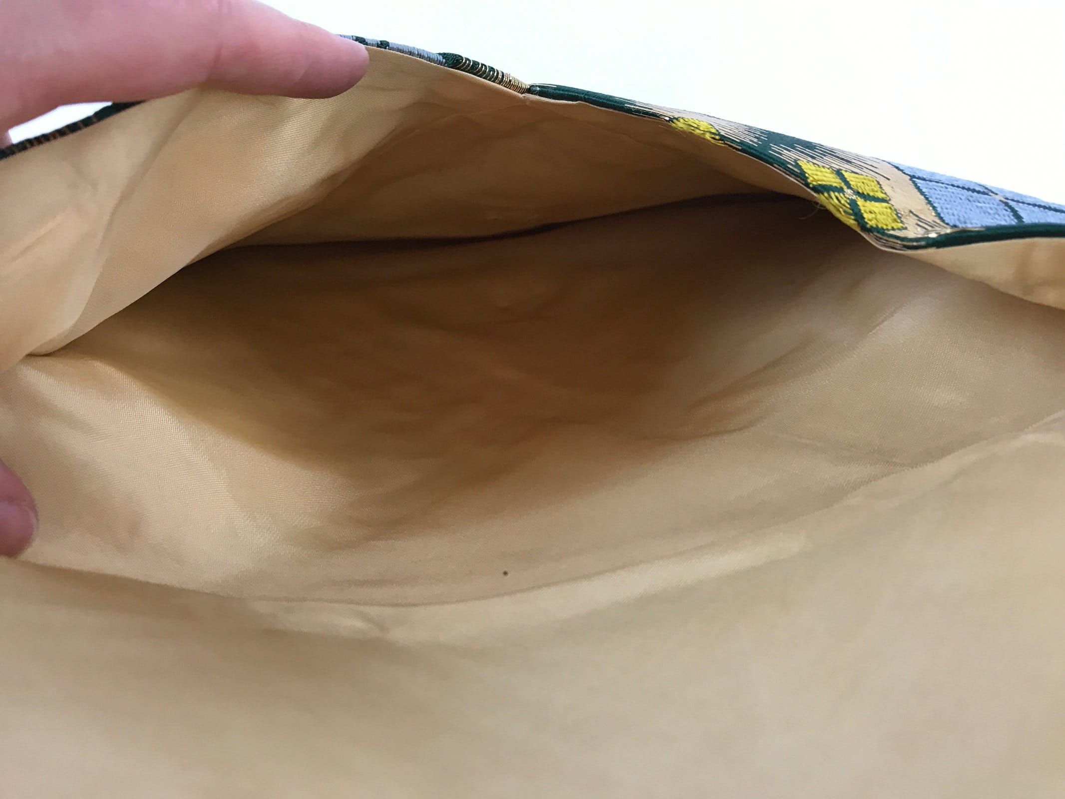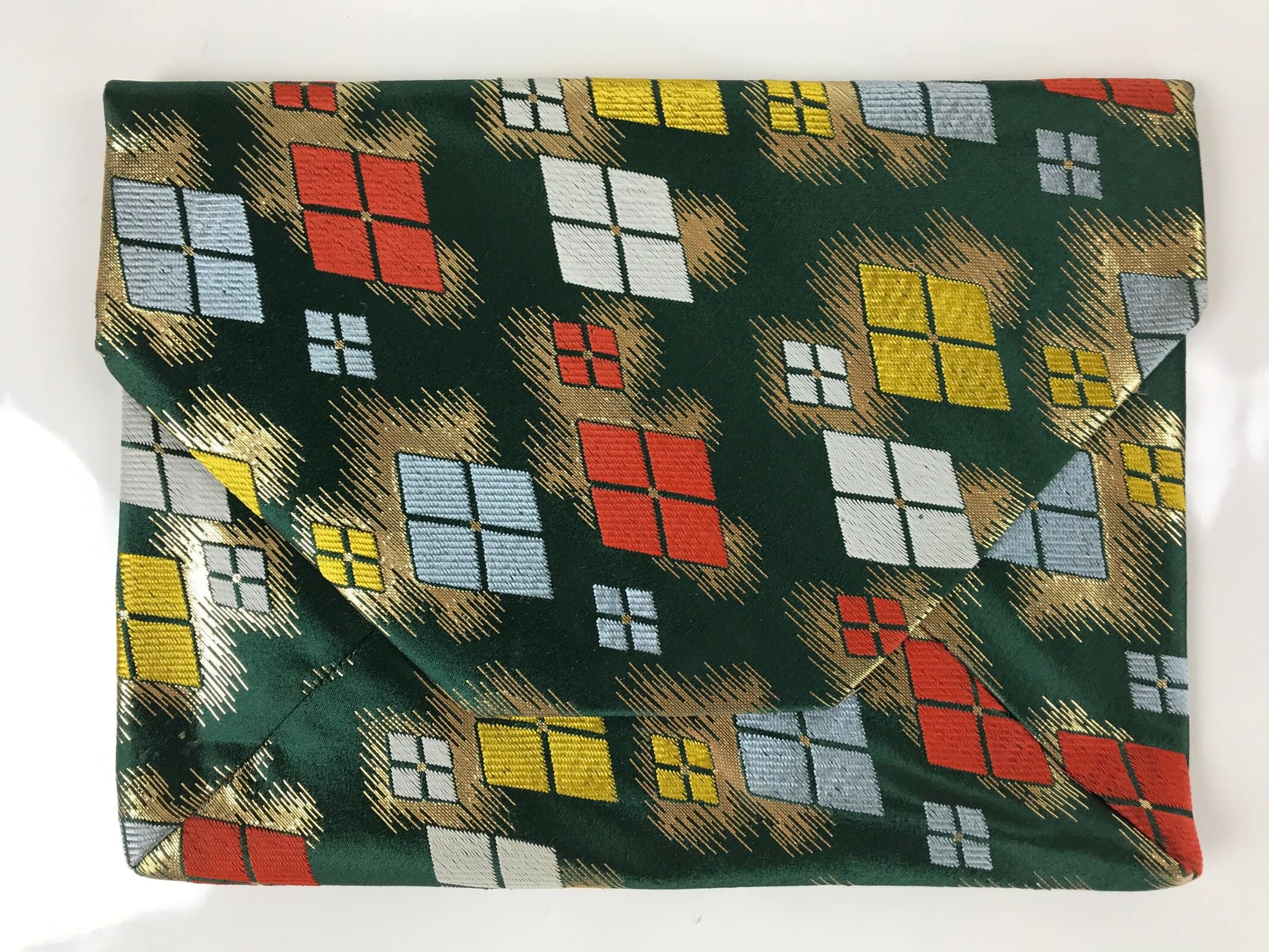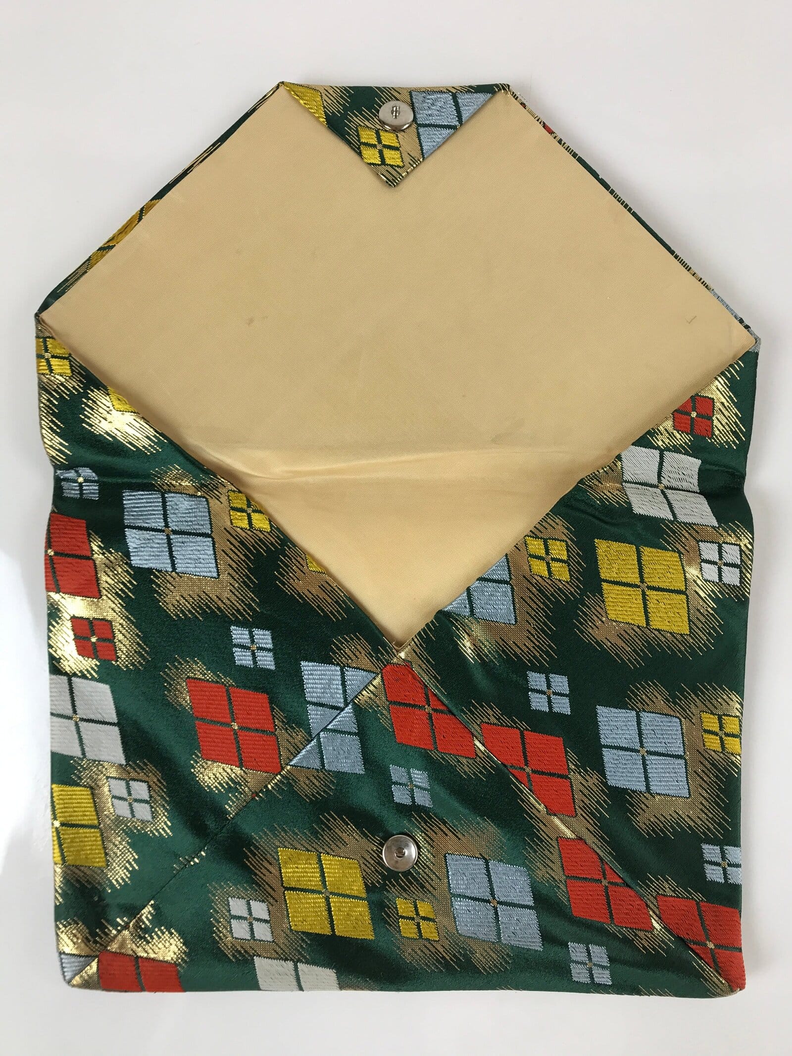 This is a vintage Japanese pouch made to store and carry tea ceremony utensils, or sukiyabukuro. This flat, lightweight silk fabric bag has a shining dark green, orange, gold, and white geometric floral design, a light gold fabric lined inside, and a metal button clasp. Some items often found in this type of bag include: kashikiri and youji (small flat dull knife-like item used to eat sweets during tea ceremony and toothpicks), fukusa (typically red or purple cloth, chakin (white cloth used for wiping tea bowls), etc.