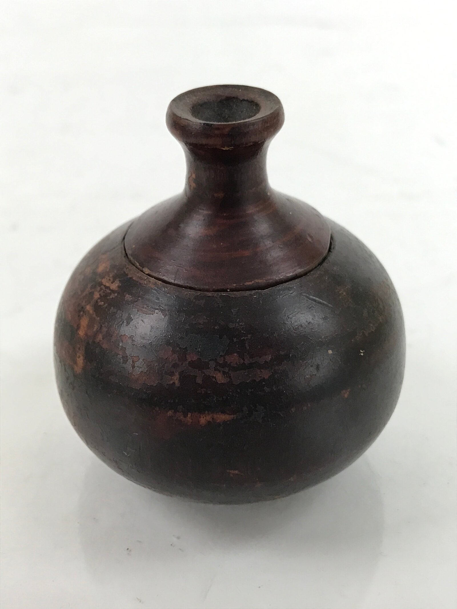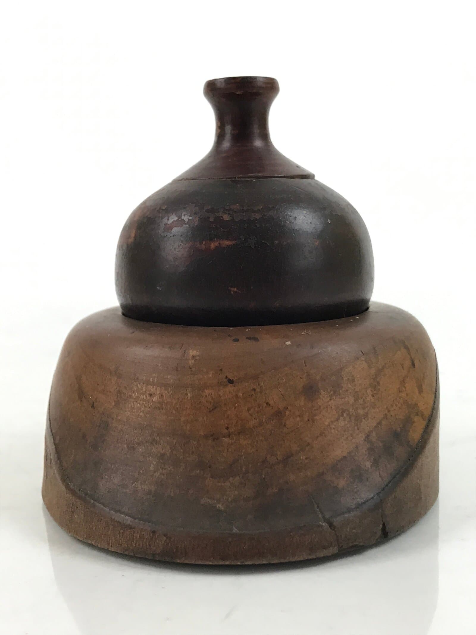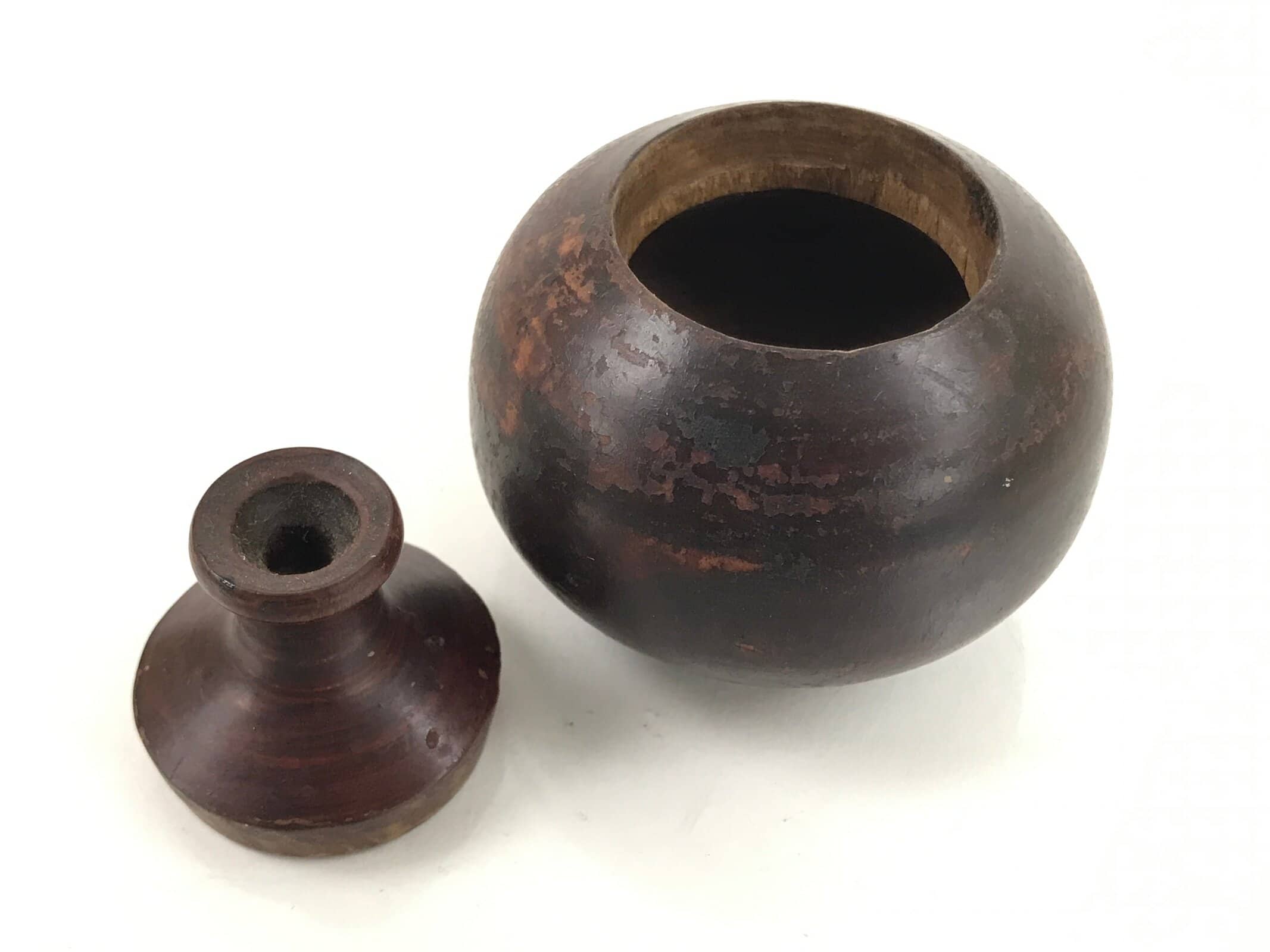 This vintage Japanese small storage wooden box and its stand are made from wood and have a dark brown color. The tiny container is round and has a lid with a ventilation hole at the center. It has a flat bottom so it can be both placed on a flat surface or displayed on the stand. This item is likely used to store tobacco leaves for kiseru pipes.