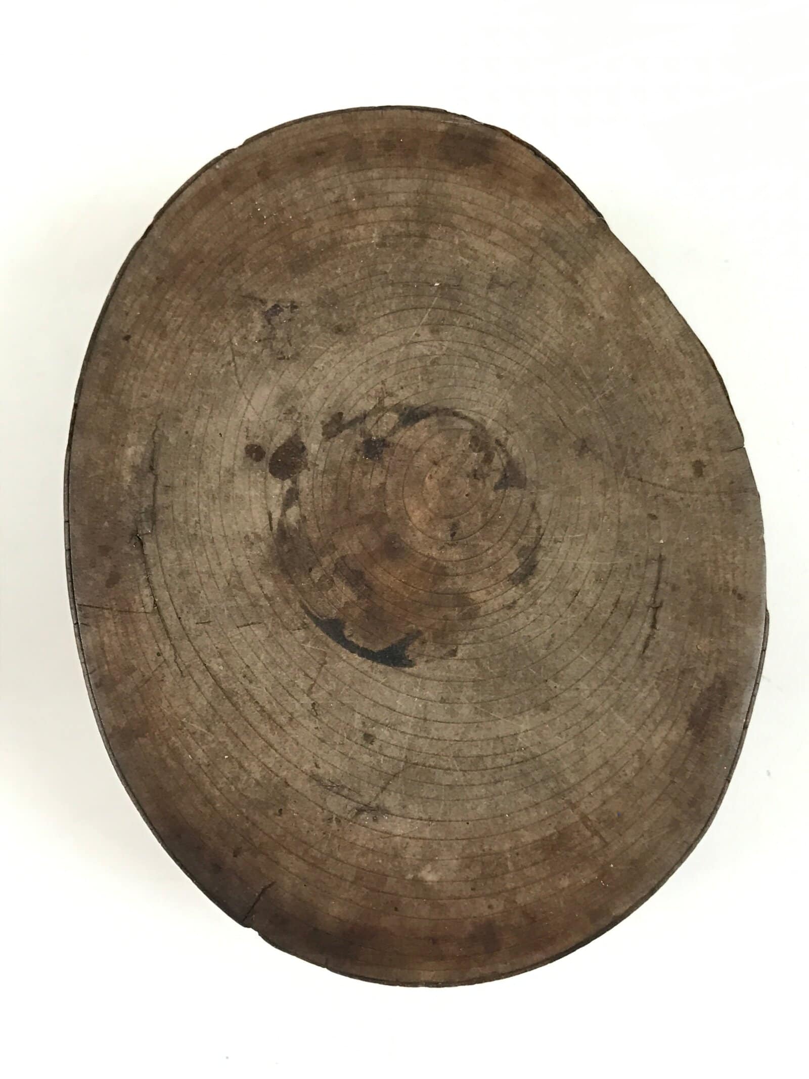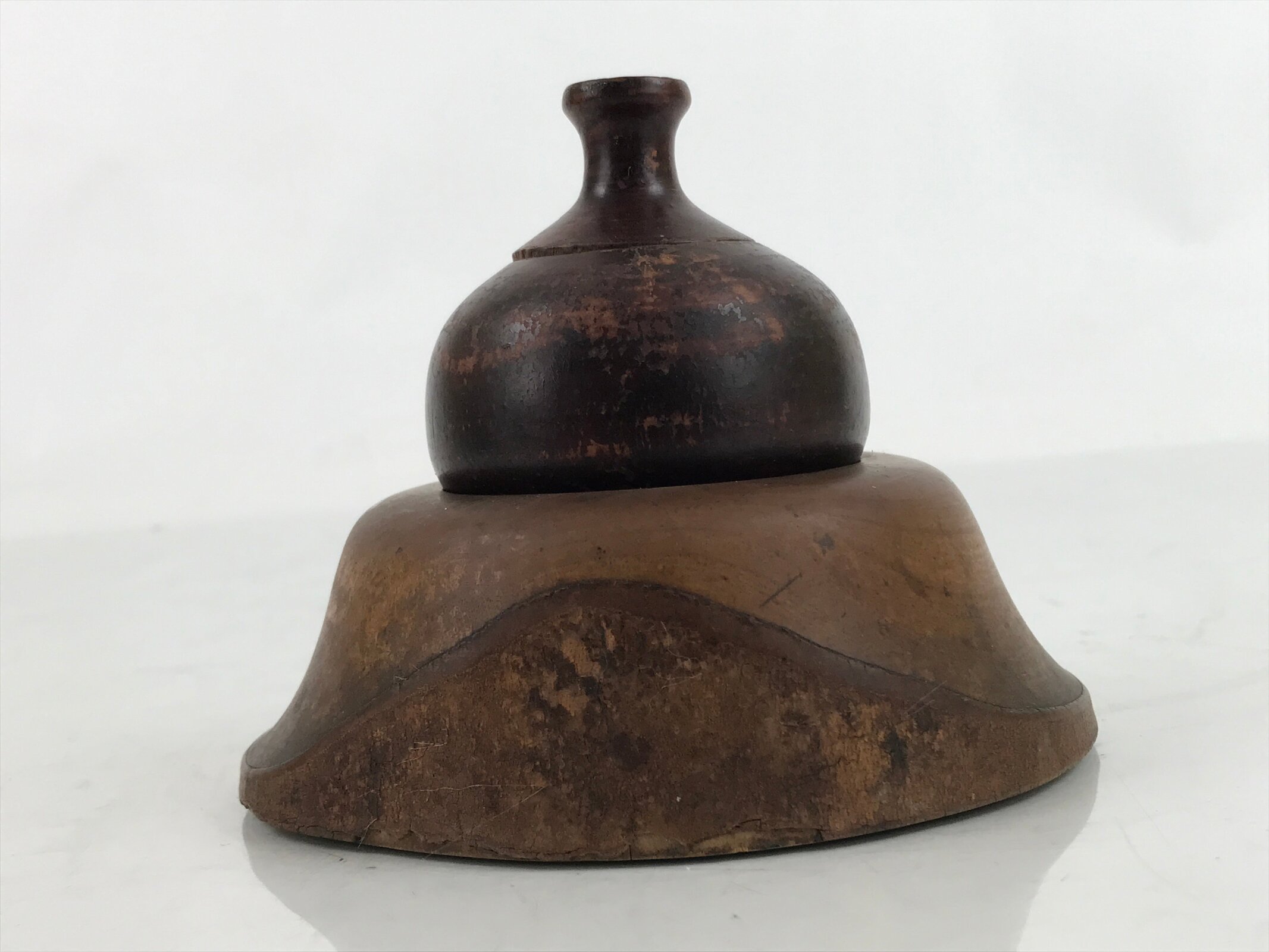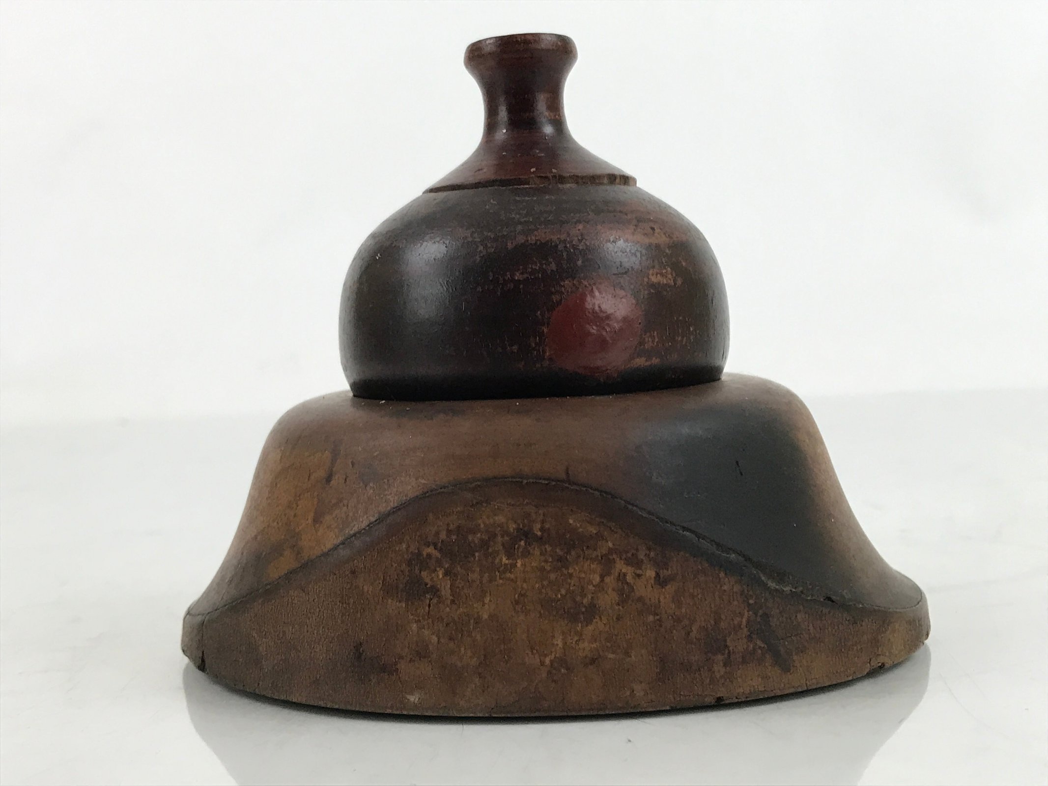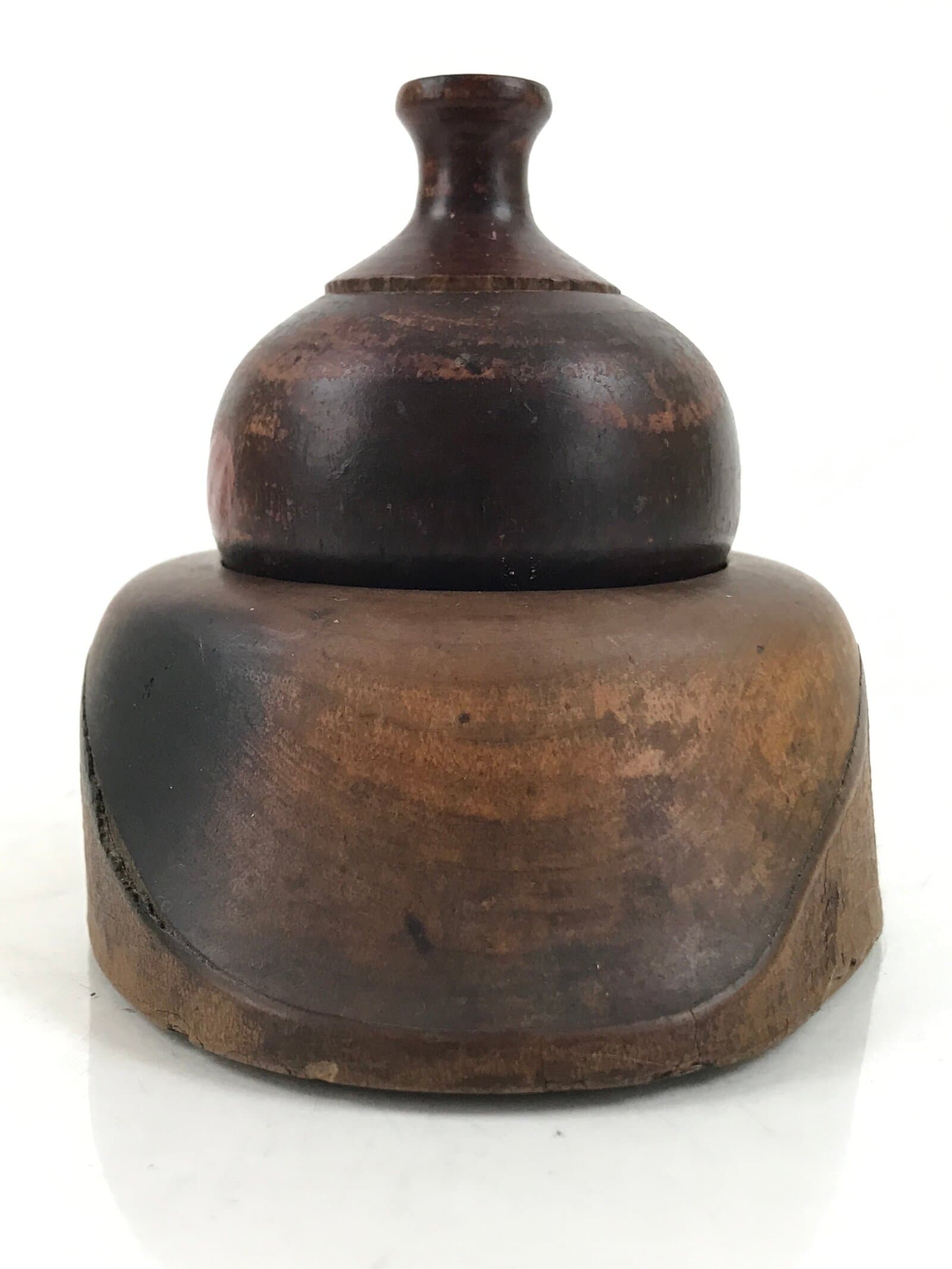 This vintage Japanese small storage wooden box and its stand are made from wood and have a dark brown color. The tiny container is round and has a lid with a ventilation hole at the center. It has a flat bottom so it can be both placed on a flat surface or displayed on the stand. This item is likely used to store tobacco leaves for kiseru pipes.