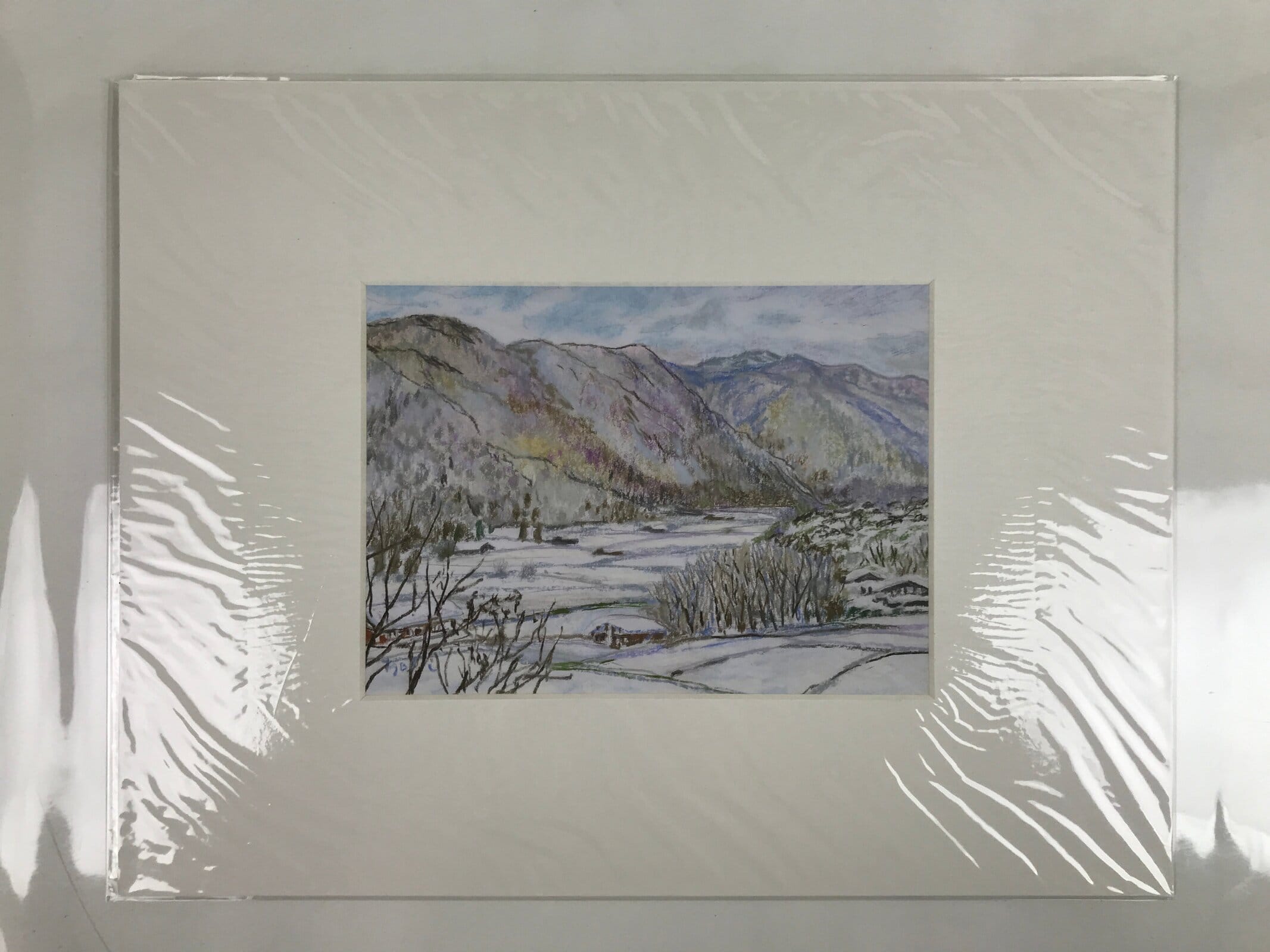 This original pastel drawing on cardstock paper features a landscape of a snowy mountain scene with a tiny snow-covered village below. Pastel is a gorgeous, often overlooked, art medium that blends colors together beautifully and this piece is no exception. It is adhered to a plain white matboard, ready for easy framing and stored in a plastic sleeve. This work is signed by the Japanese artist Yoshihiro Hagino.