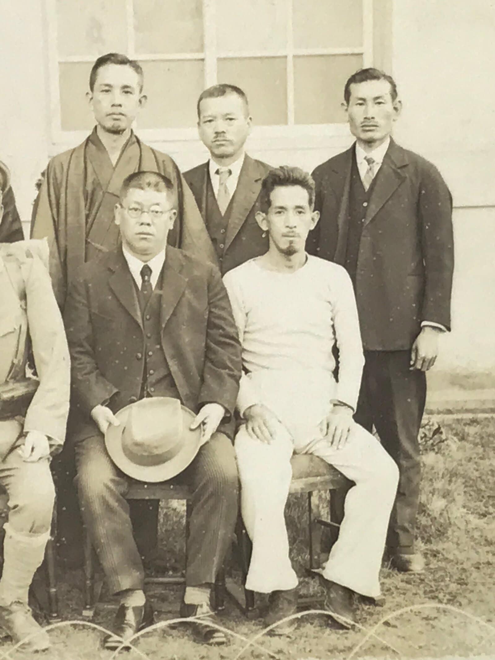 This is an original vintage Showa sepia tone photograph of a group of men, one being an older man in a military uniform. The others appear to be of similar age and wear a combination of kimono with haori, suits, and plain clothes.