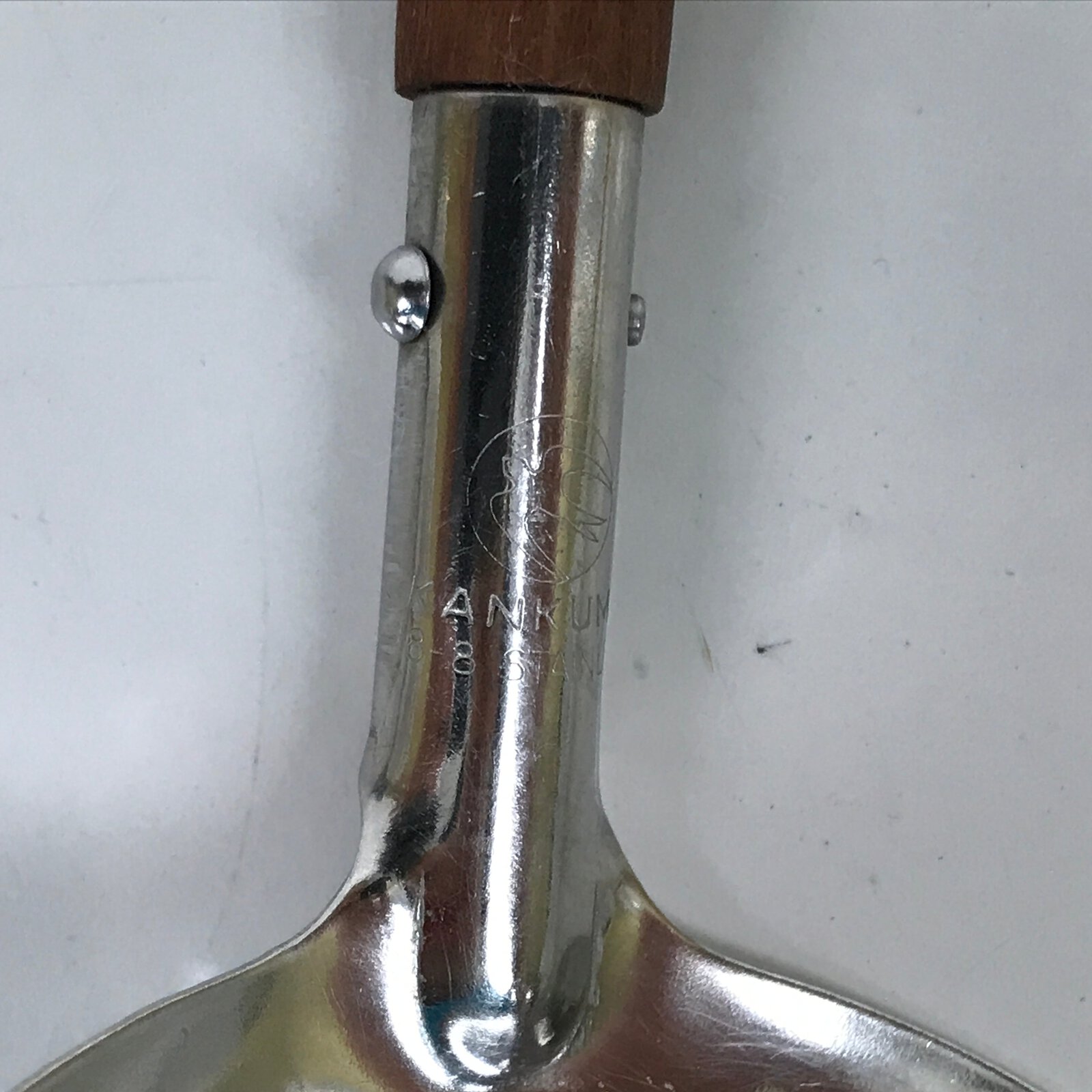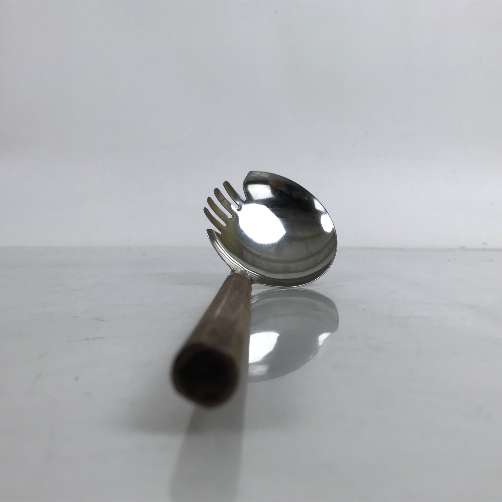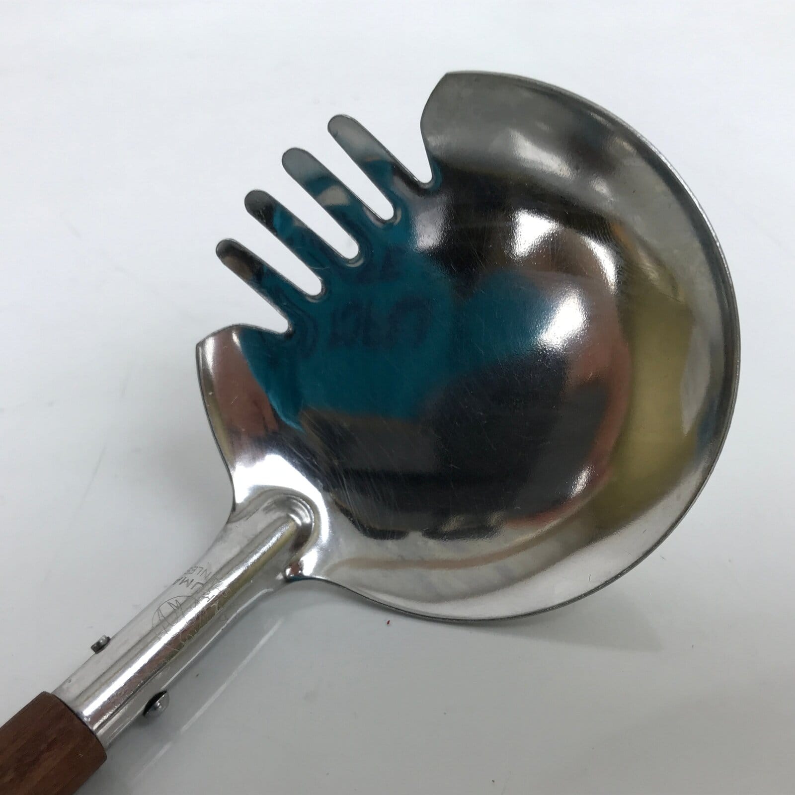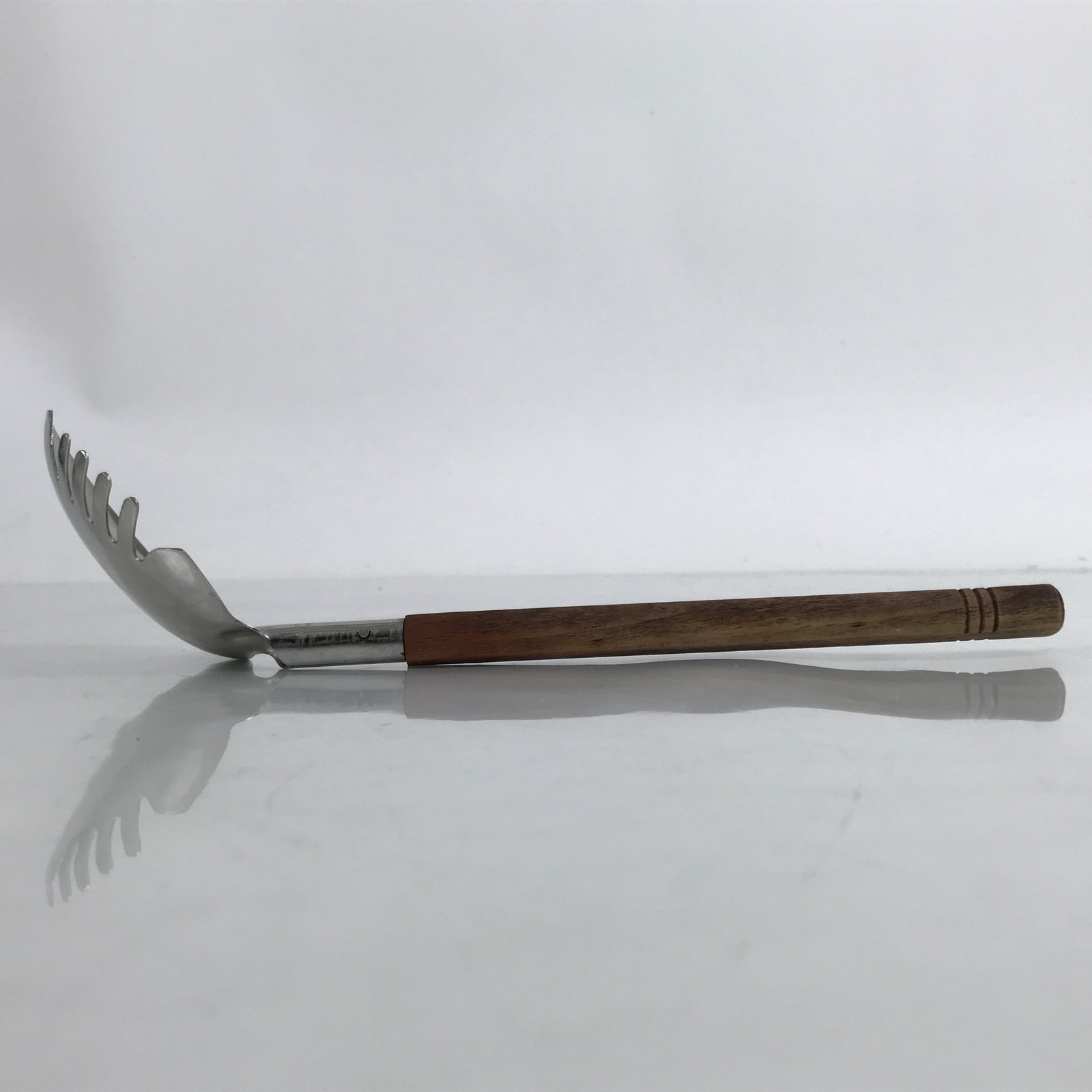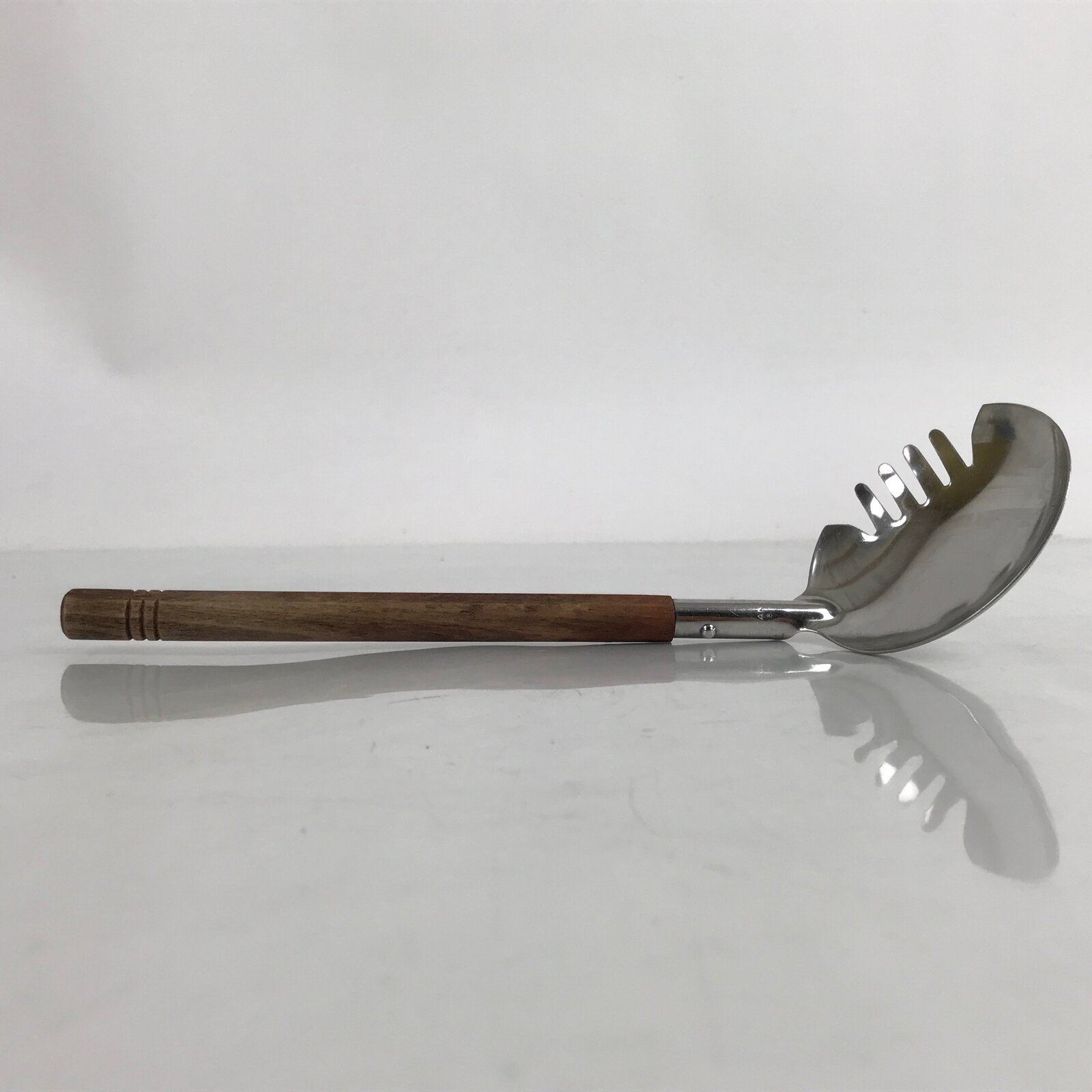 This is a vintage Japanese stainless steel serving ladle or spoon used for simple salads, but also for scooping noodles and other solid items from a nabe hotpot. It has an open slotted side on the metal piece used for straining solids from liquids and gripping things like noodles and bean sprouts. The handle is simple and wooden with carved lines at the end. This piece makes it easy to remove food items such as vegetables, meats, and noodles from the pot without filling your personal bowl with excess liquid. It can also be used for general salads.