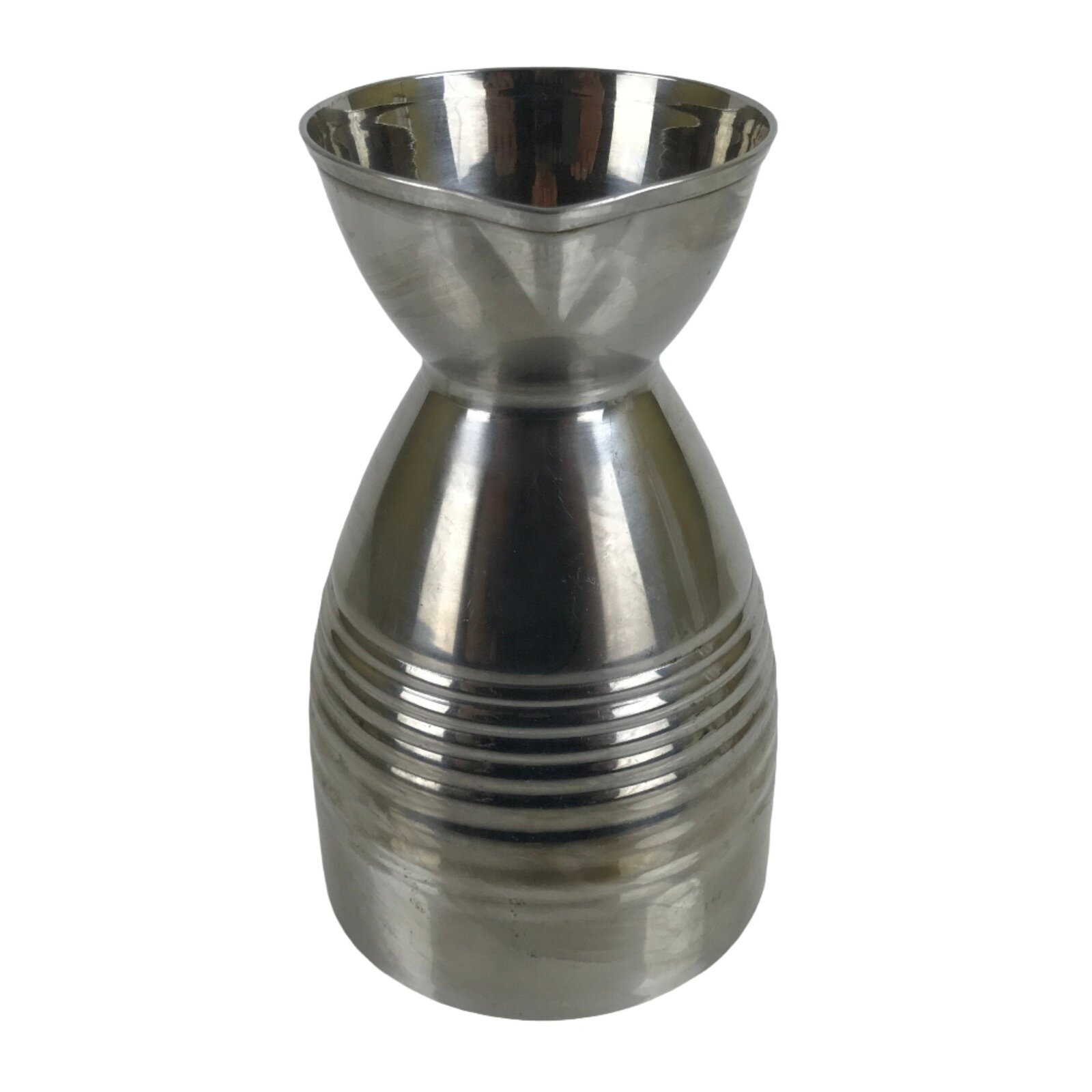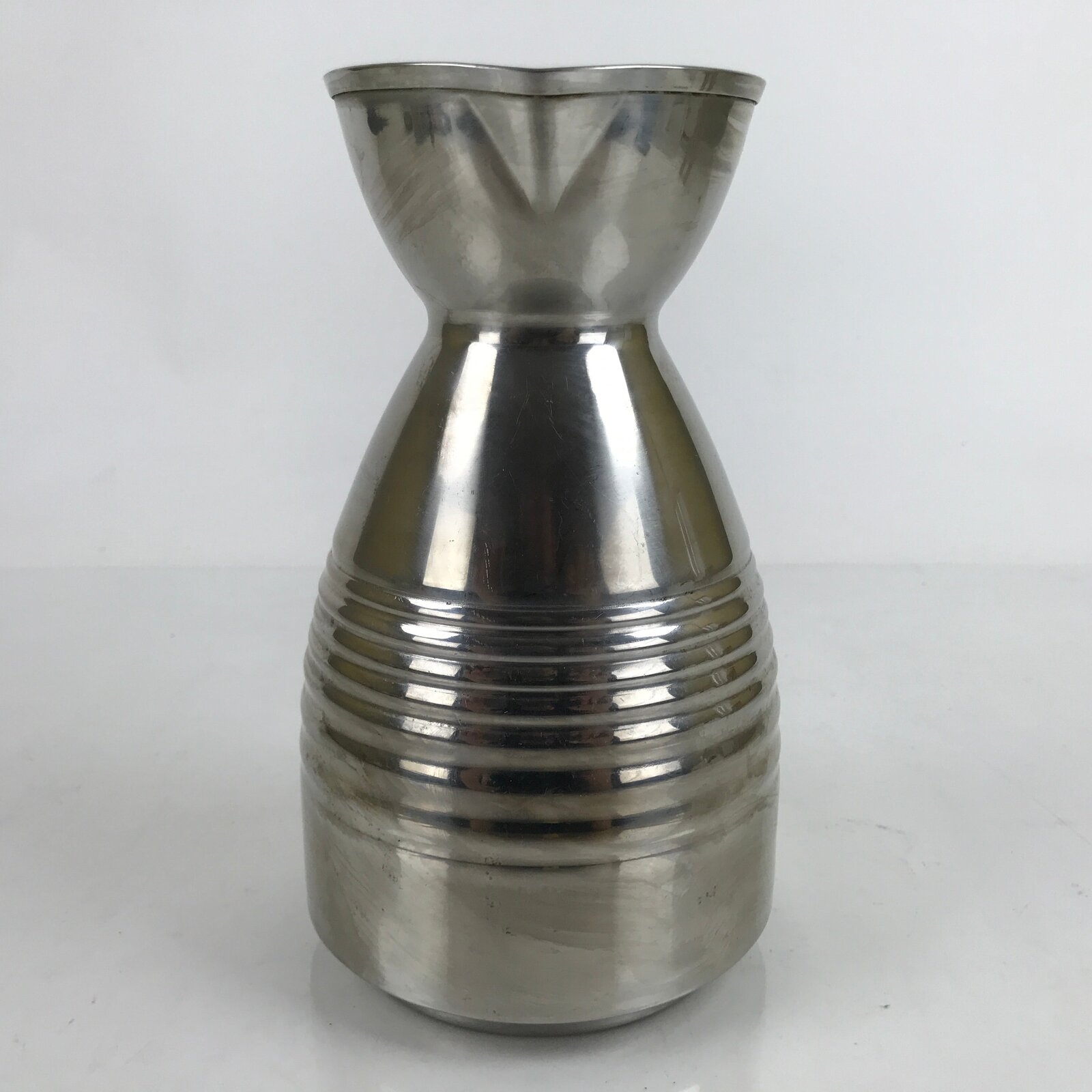 This is a vintage Japanese dashi container. It is made of stainless steel and has a small spout at the top edge to facilitate easy pouring. This is an item that would be used in a restaurant to store and serve dashi or other soup bases likely for meals such as nabe hot pot or shabu shabu. It has a simple lined design on the bottom half. It was made in Japan.
