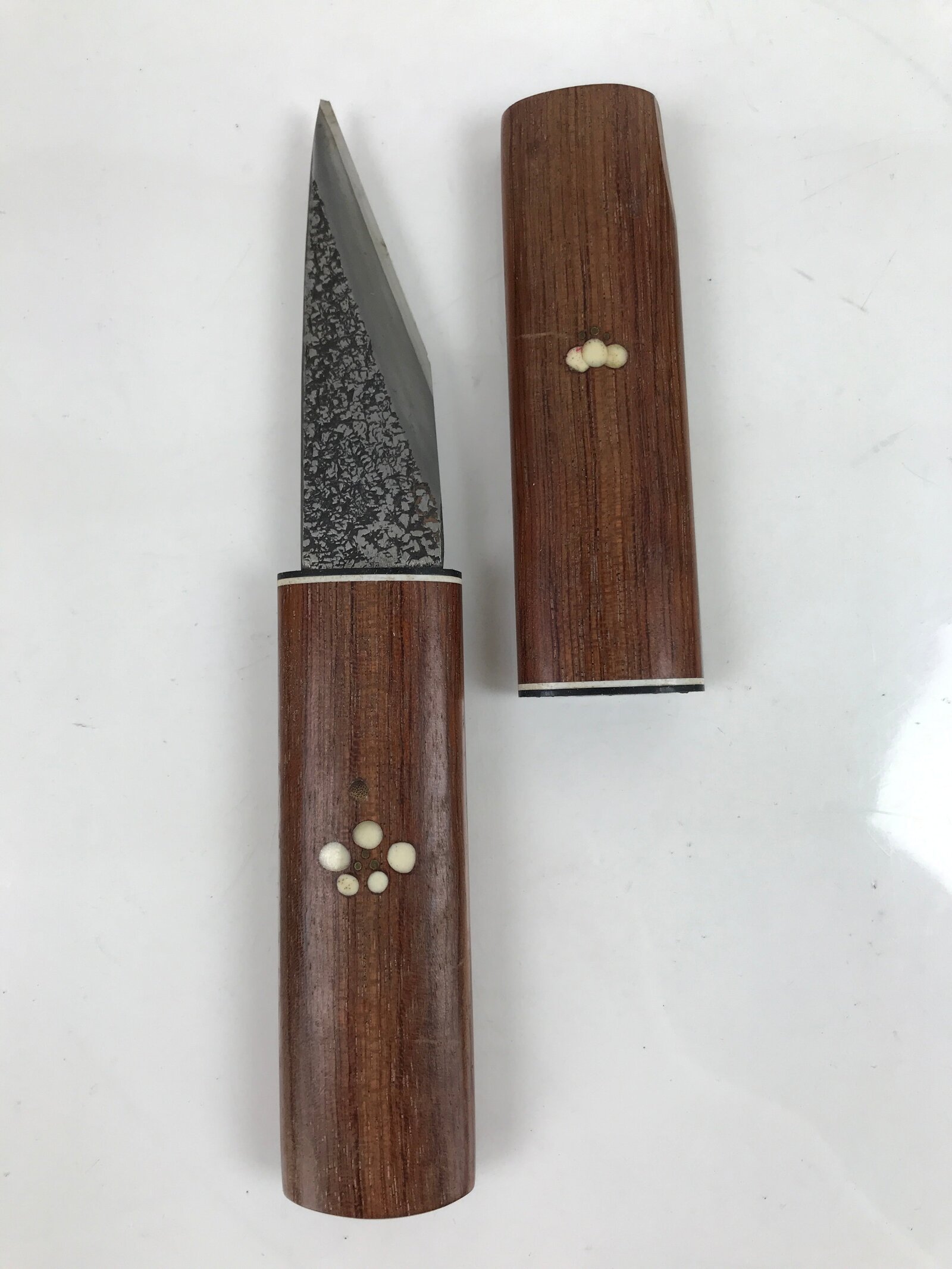 This vintage Japanese woodworking craft knife has a steel blade, a wooden handle with a decorative floral resin accent and a matching sheath. This knife is single-edged and has some inscriptions on the blade. The blade has a decorative texture on one side. This knife comes in a paper box.
