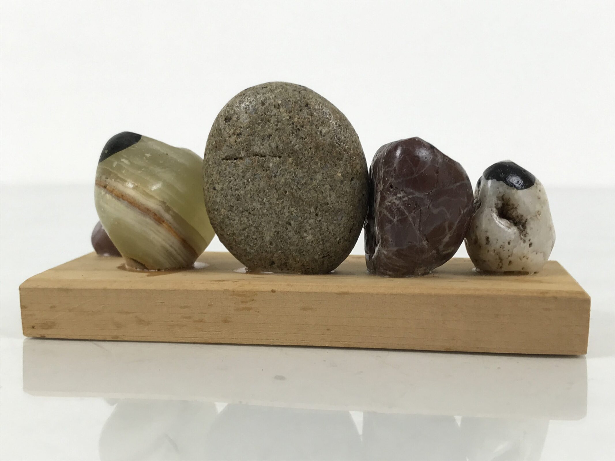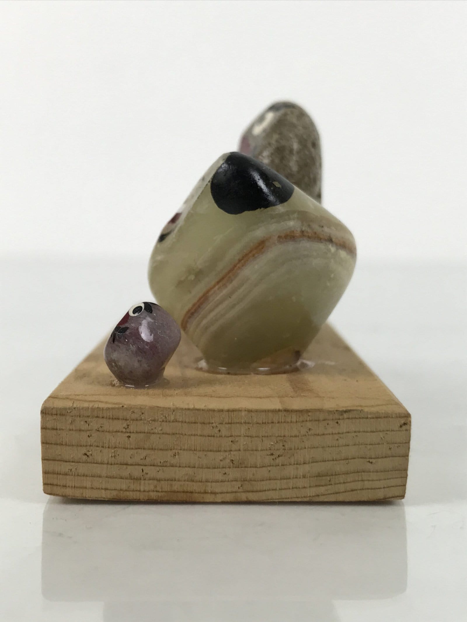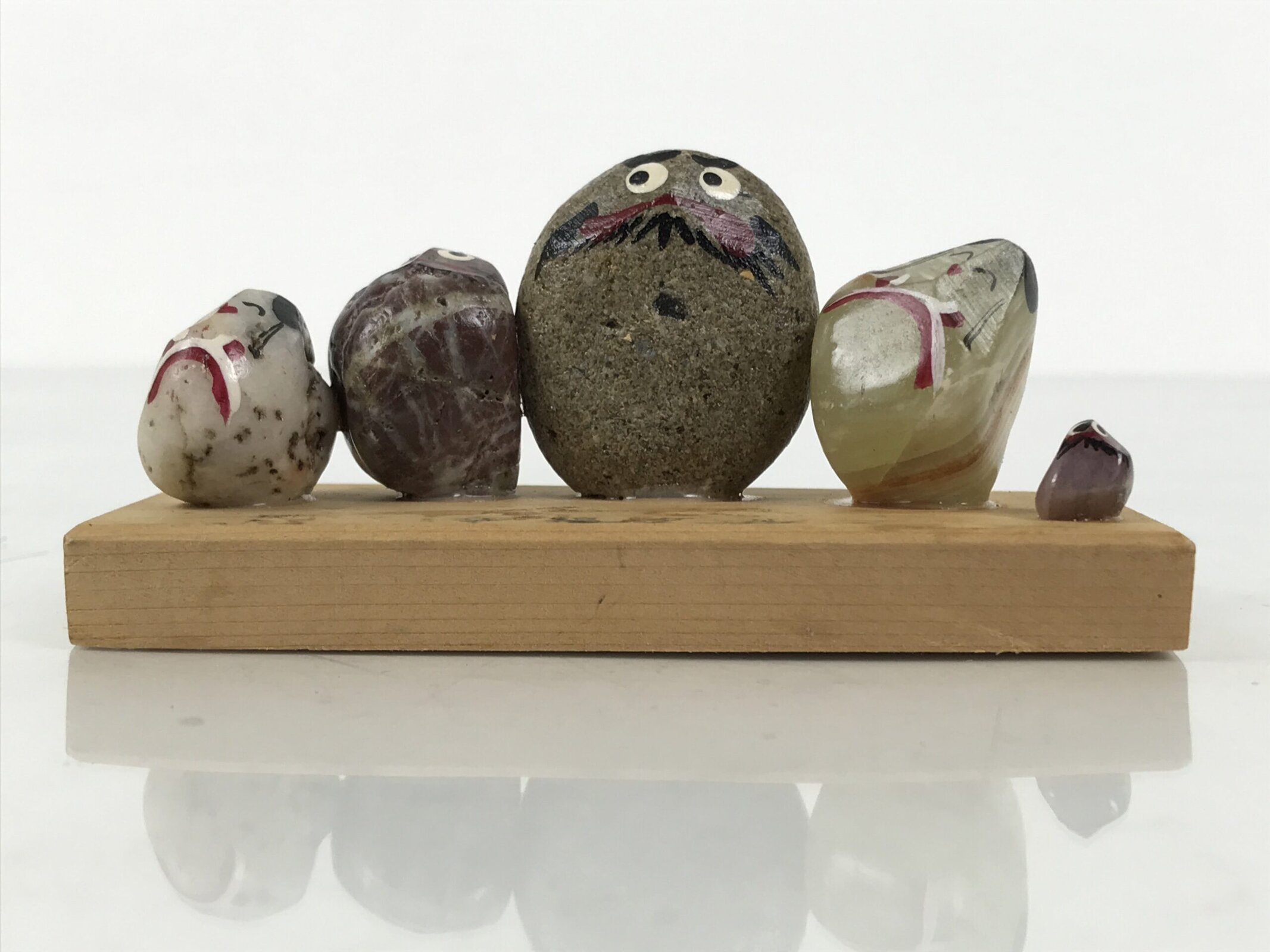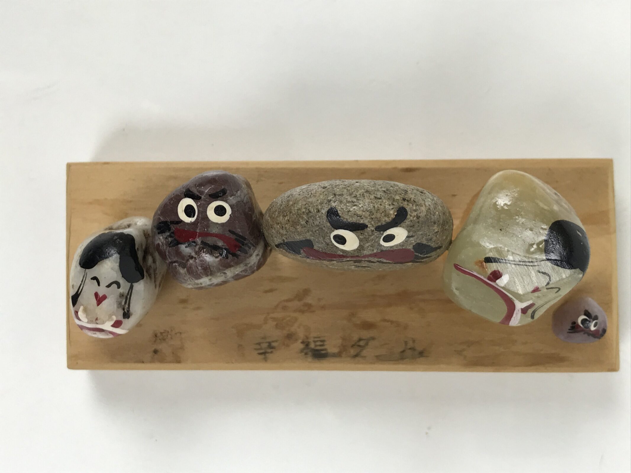 This is a vintage Japanese stone kokeshi figurine. Five types of stones are glued and painted to have their own expressions. Three of them have wide-open eyes and set-firmly mouth, look like Daruma. The other two are smiling, with black hair, and wearing a kimono. There is an inscription on the stand.