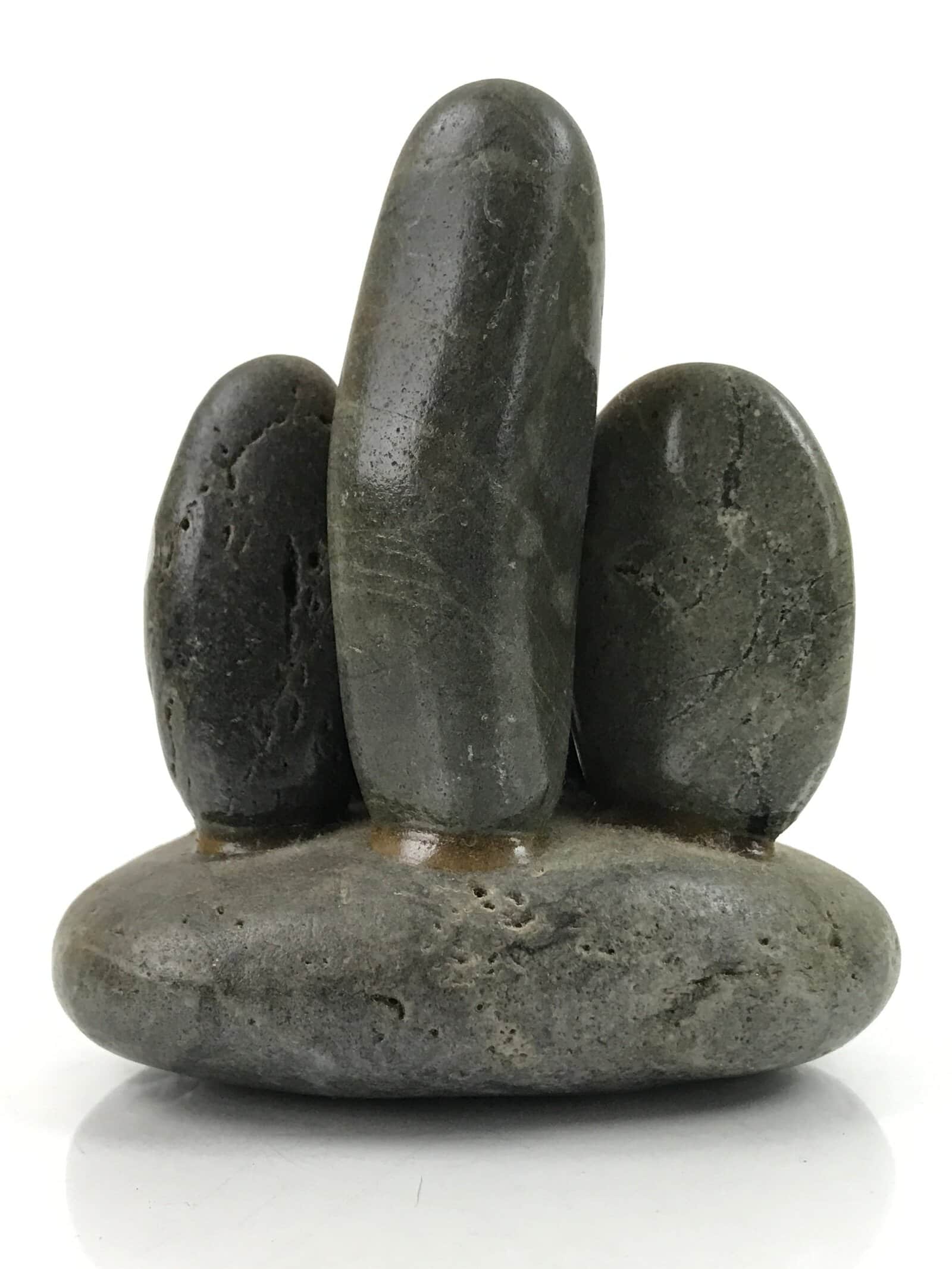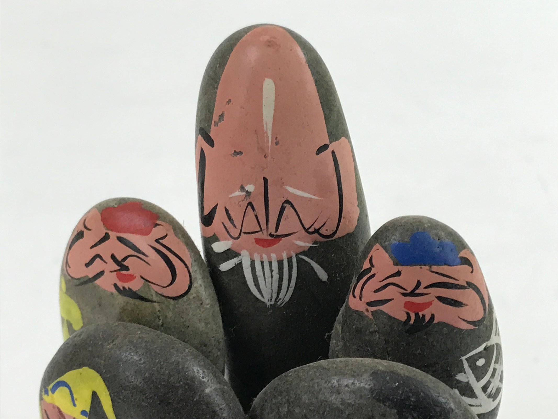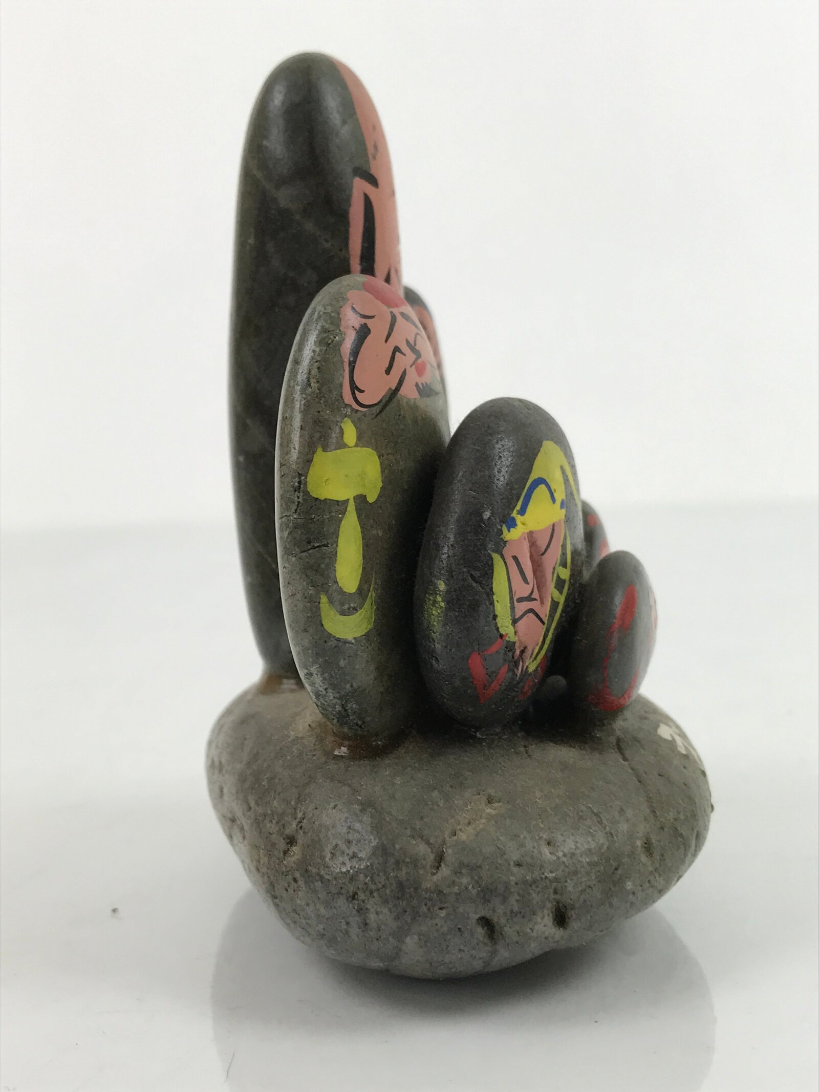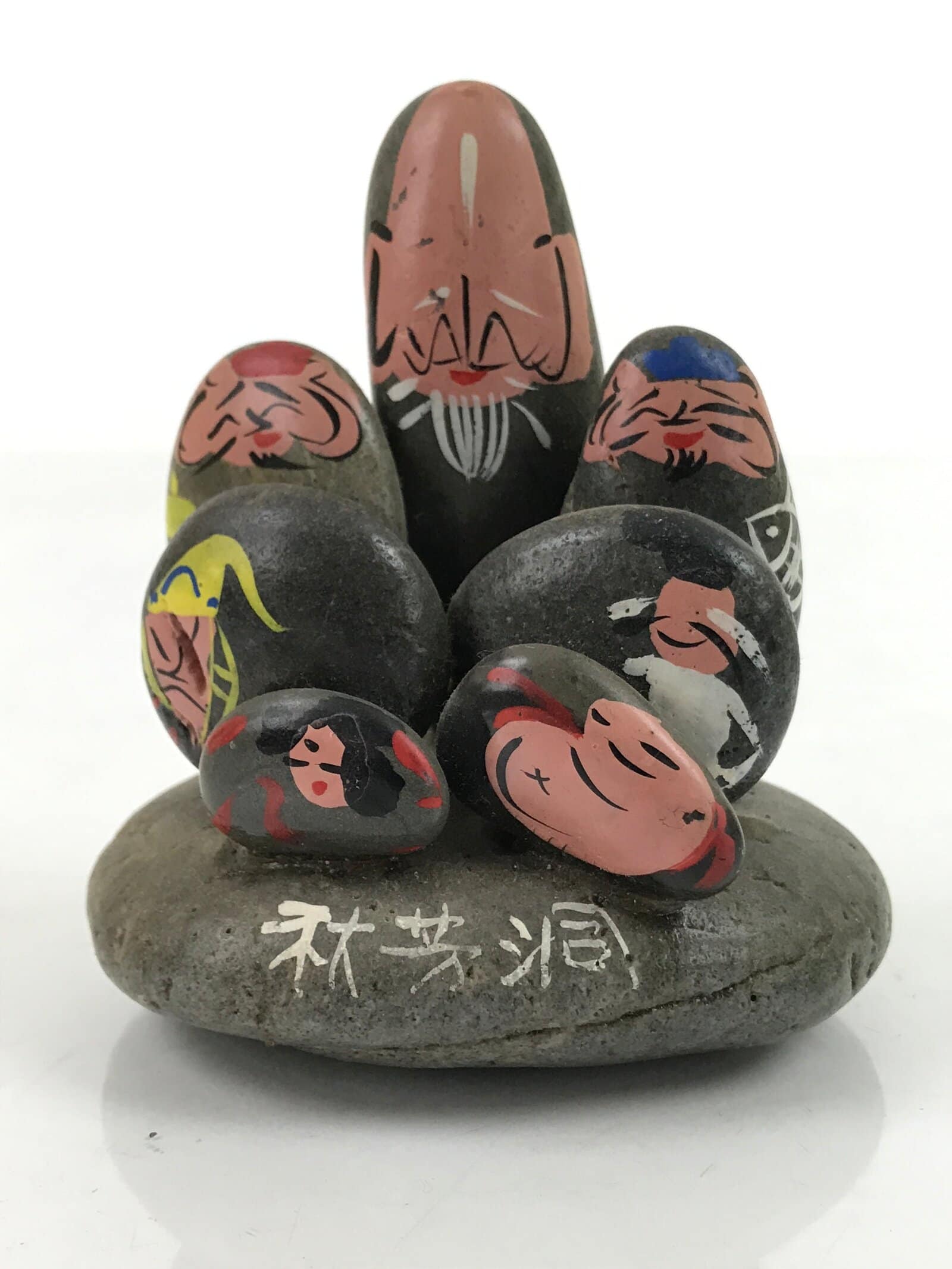 This is a vintage Japanese statue of the Seven Lucky Gods (shichifukujin). This statue is unique and crafted from only smooth stones. It has the faces of the seven gods handpainted onto them, each with defining characteristics.