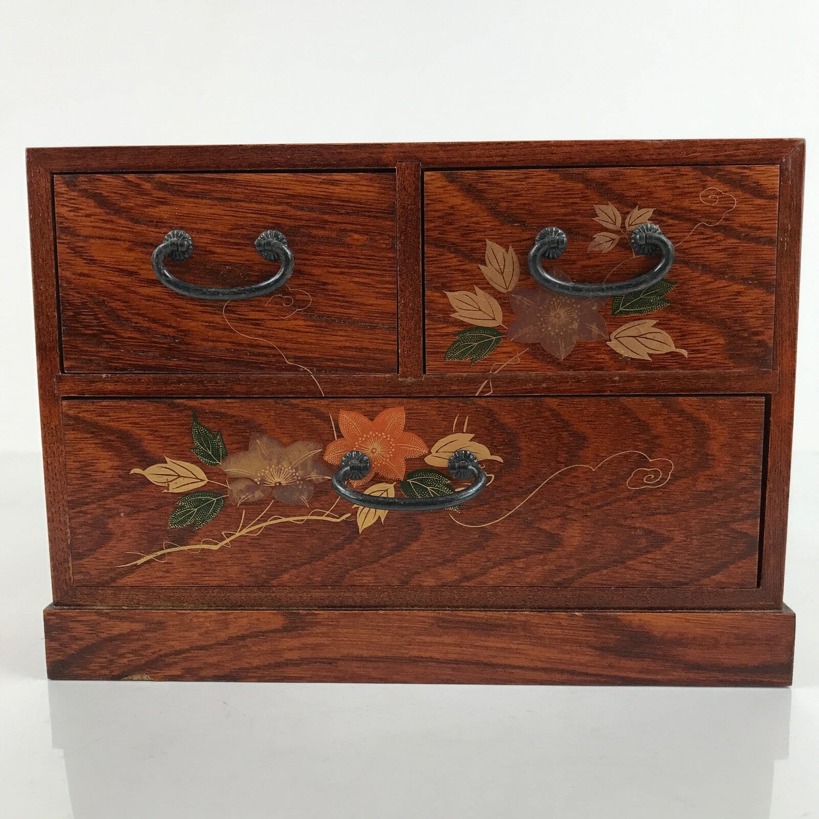 This is a Japanese storage chest, also called tansu. A rich brown color with a clear brushed lacquer coat, this small chest has two half-sized drawers and one full-sized drawer with metal handles and a beautiful makie picture of flowers and foliage. The insides of the drawers are unlined. This beautiful tansu chest can be used for storing sewing supplies, jewelry, or other trinkets.
