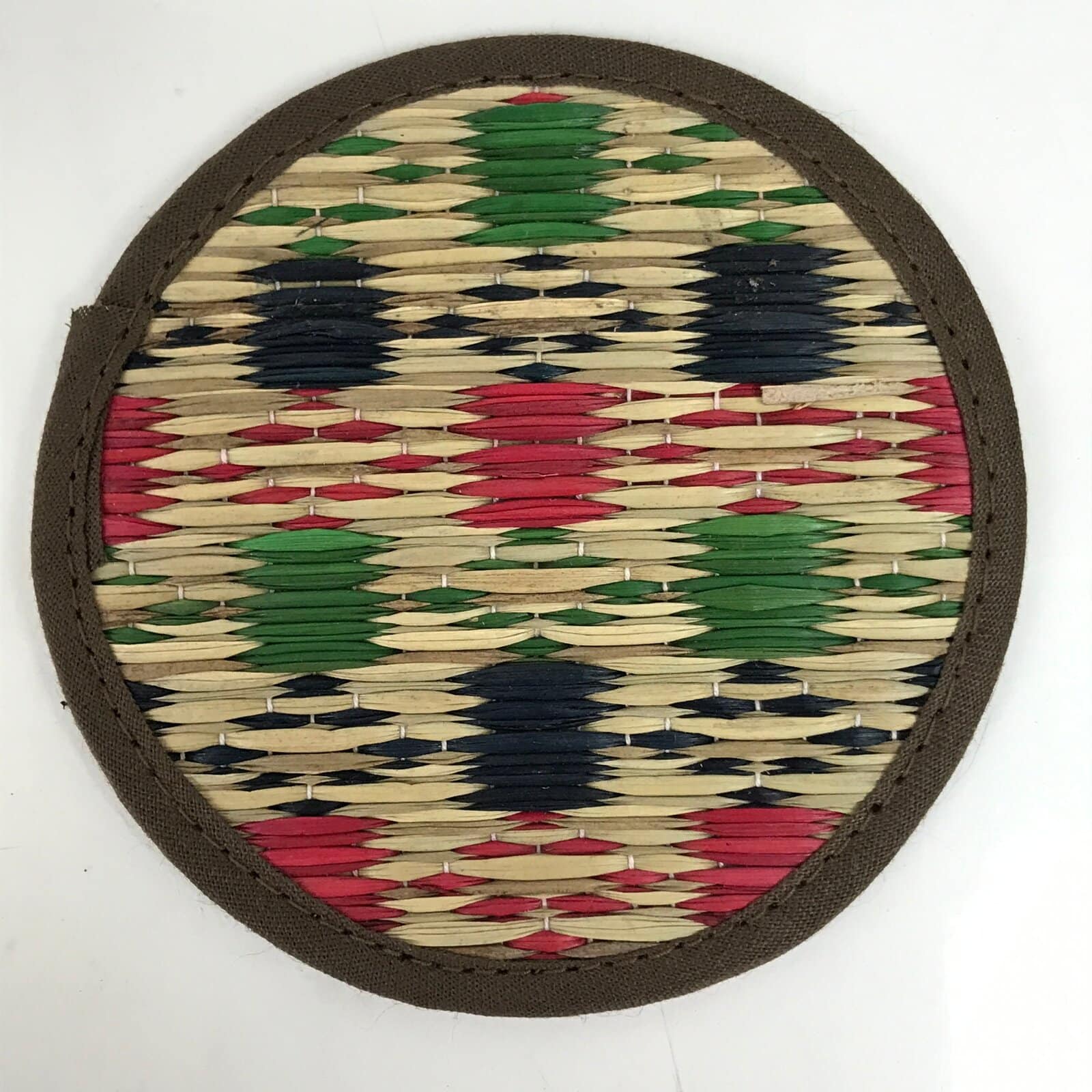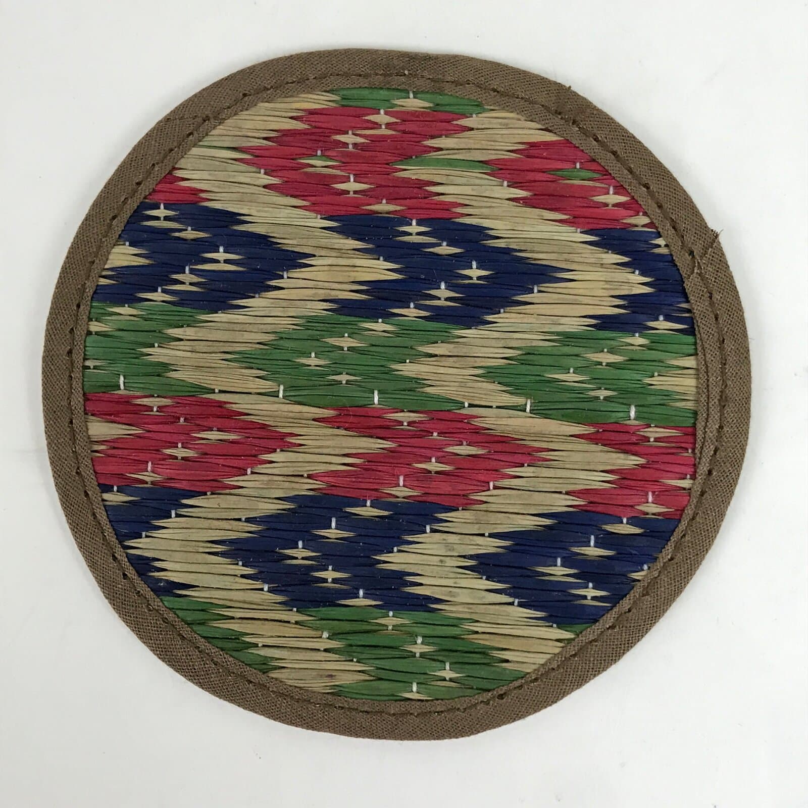 This is a five-piece set of vintage Japanese handwoven straw tatami drink saucers/coasters, or chataku. Handwoven straw mimicking the traditional tatami mats found in many Japanese homes, temples, etc, this set of folk art coasters each have their own pattern in red, green, and blue. The edges are finished with sewn on brown fabric. They are lightweight and do not take up much space.
