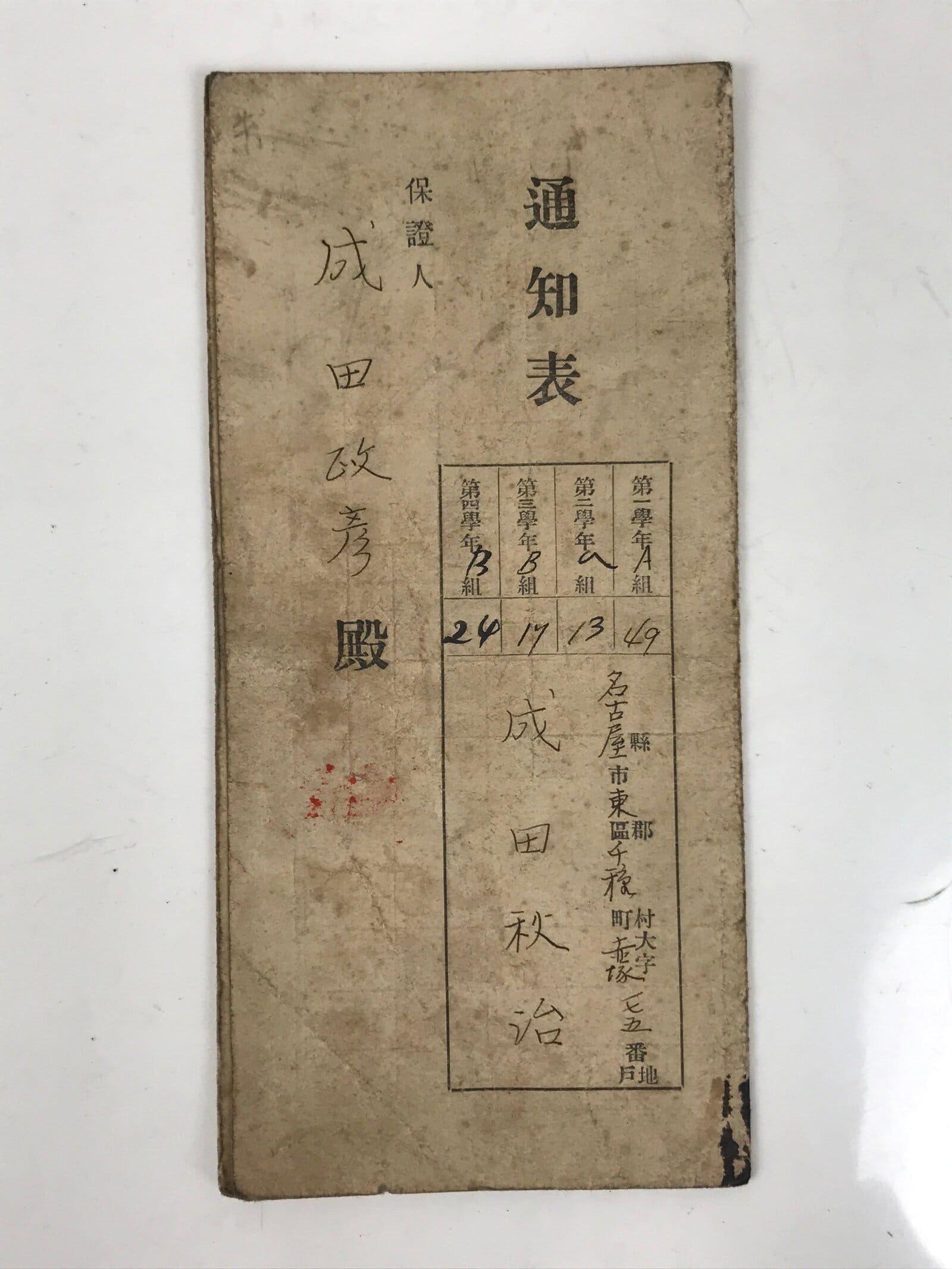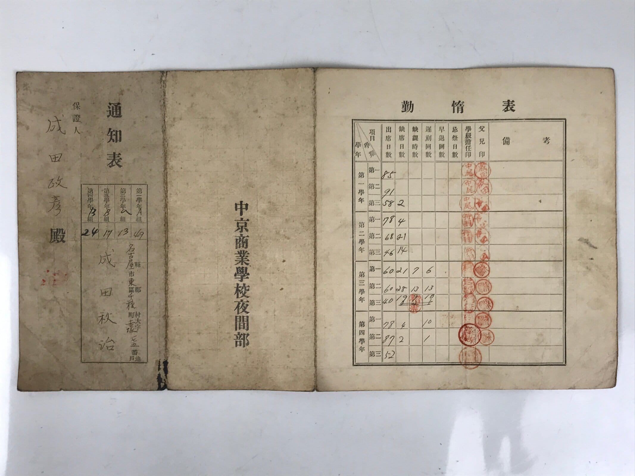 This vintage Japanese student record report card features grades, attendance records, and a health tracker. It is dated Showa 7 (1932) to Showa 9 (1934) and belonged to a high school student attending a school in Nagoya. The card has the owner’s name and red seals from the parents and the school.
