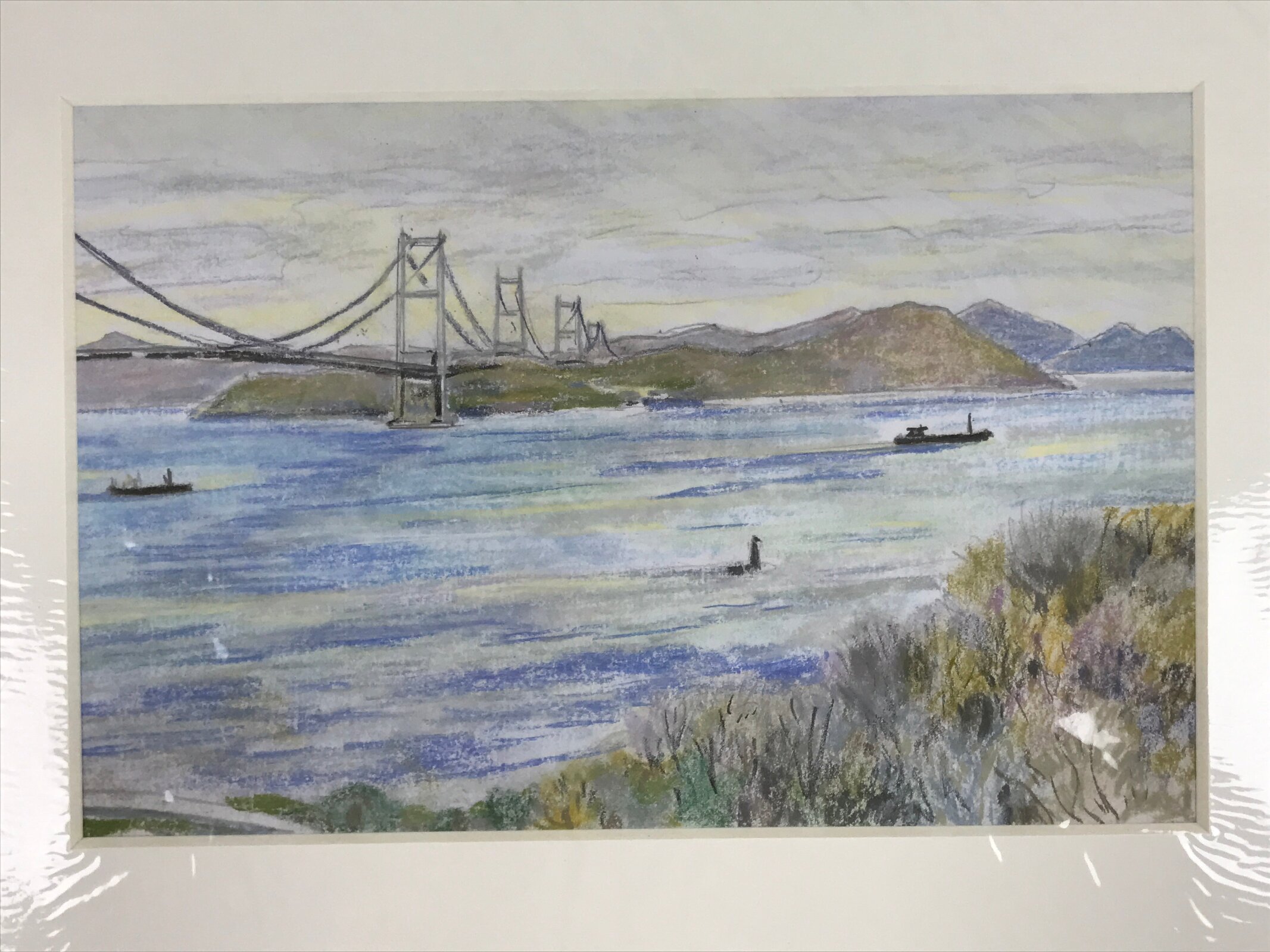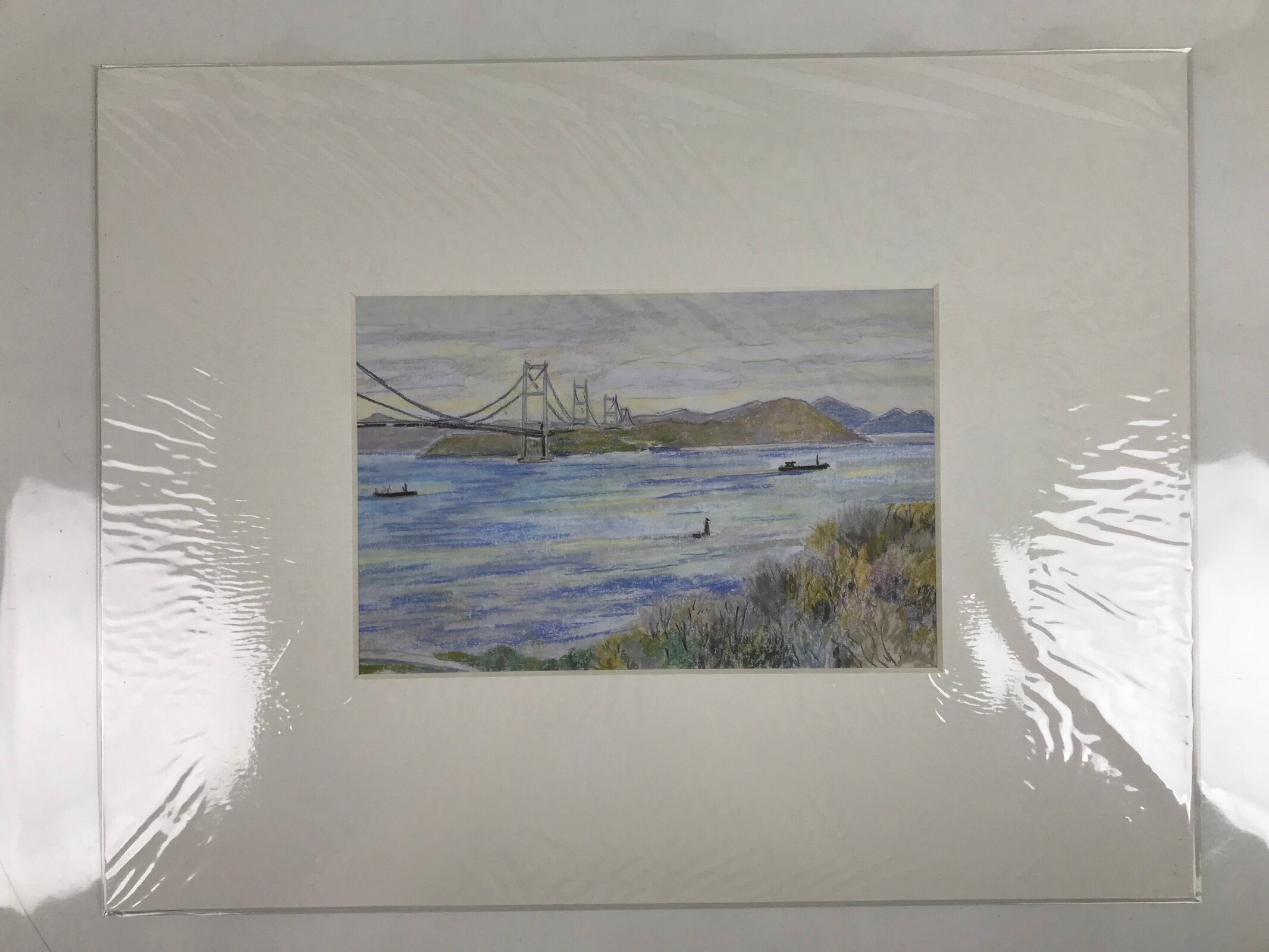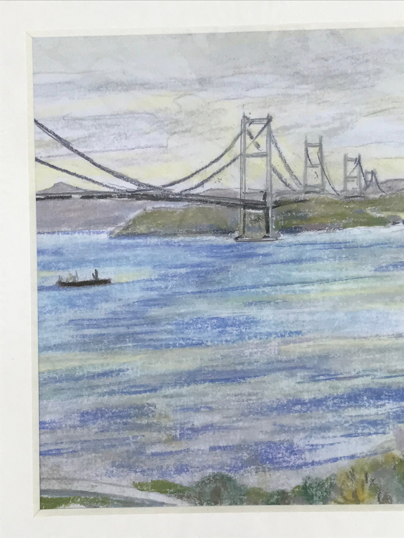This original pastel drawing on cardstock paper features a side view of a suspension bridge over a river. Pastel is a gorgeous, often overlooked, art medium that blends colors together beautifully and this piece is no exception. It is adhered to a plain white matboard, ready for easy framing and has been stored in a plastic sleeve. This work is unsigned, but was among a collection of other similar drawings by the Japanese artist Yoshihiro Hagino.