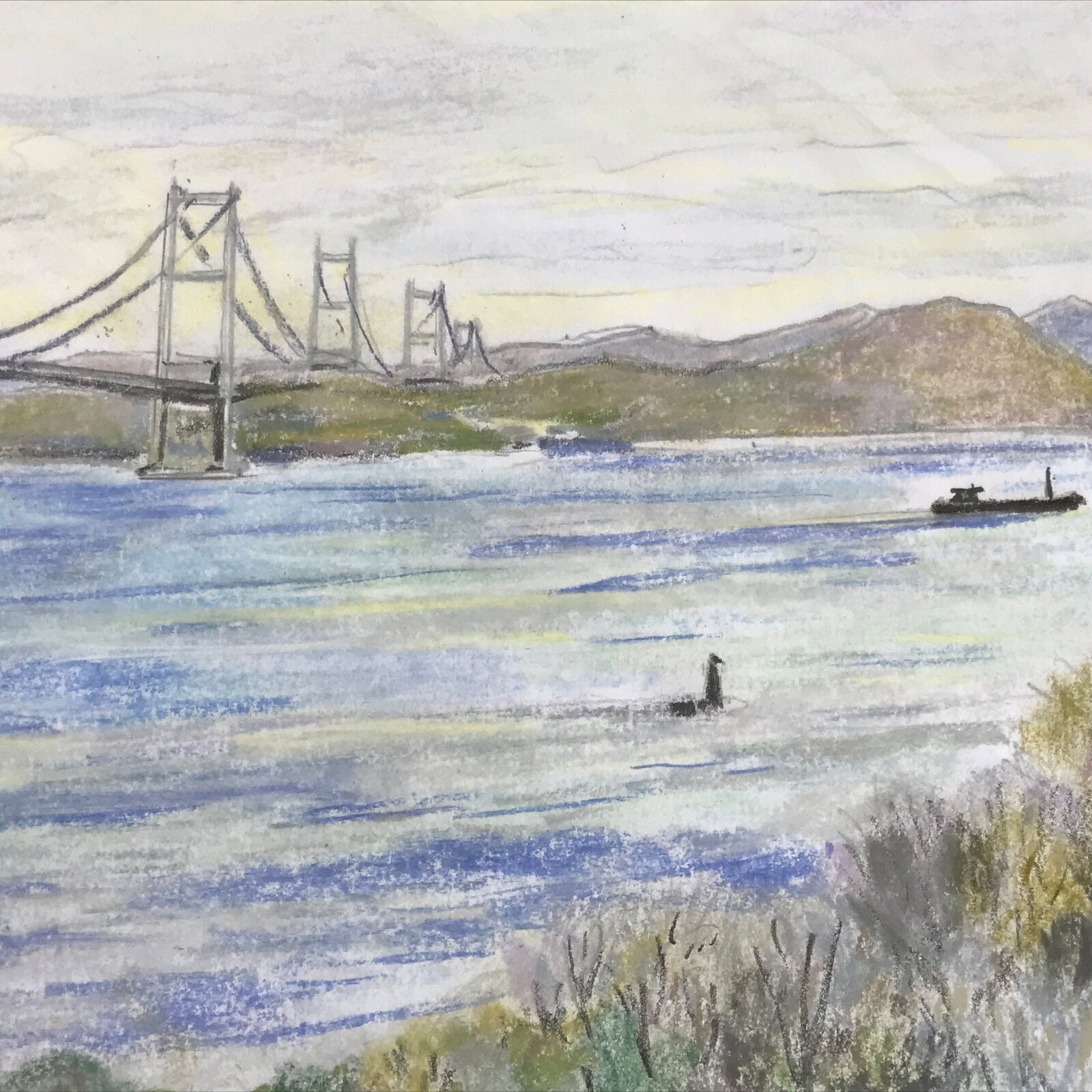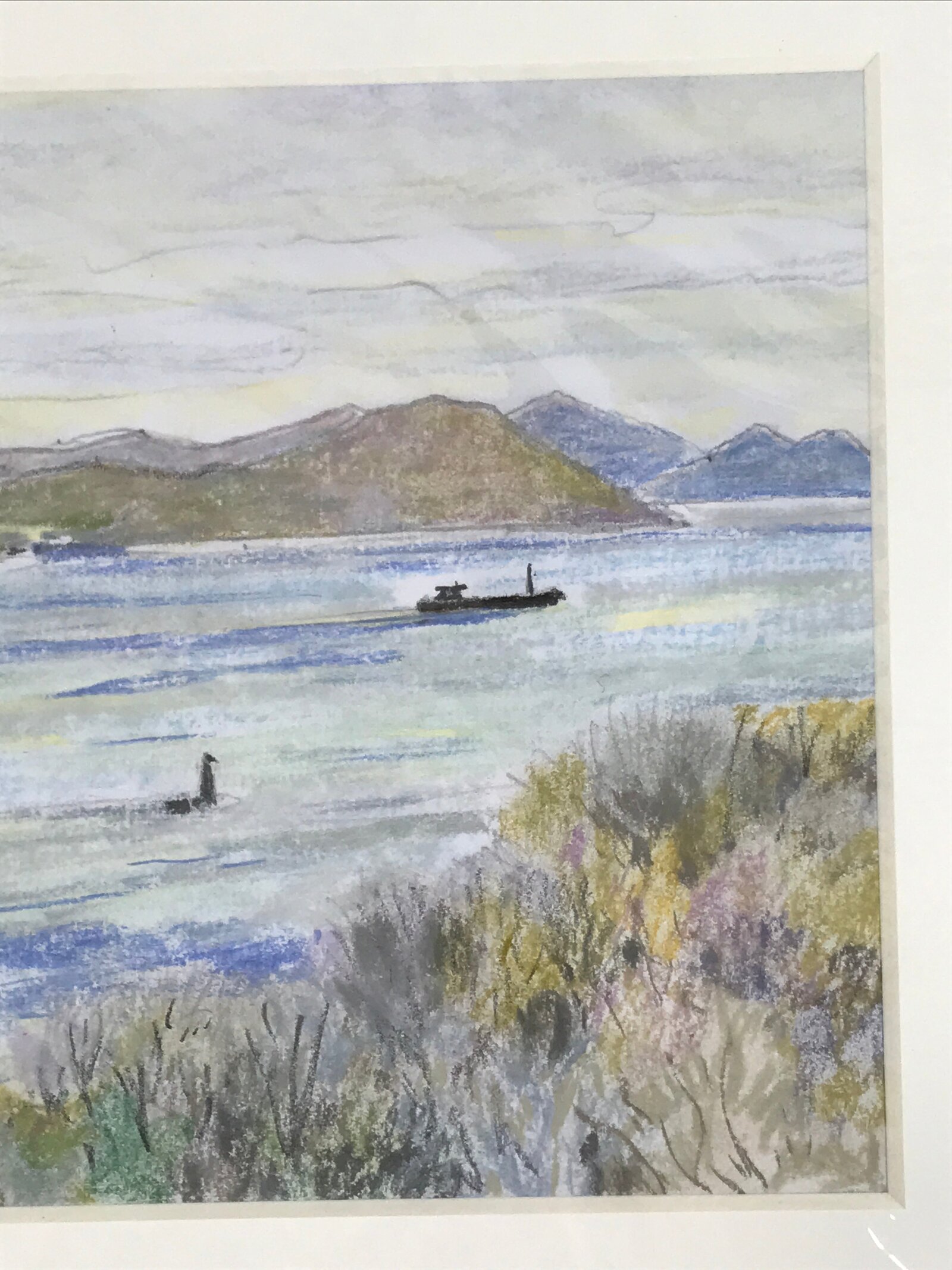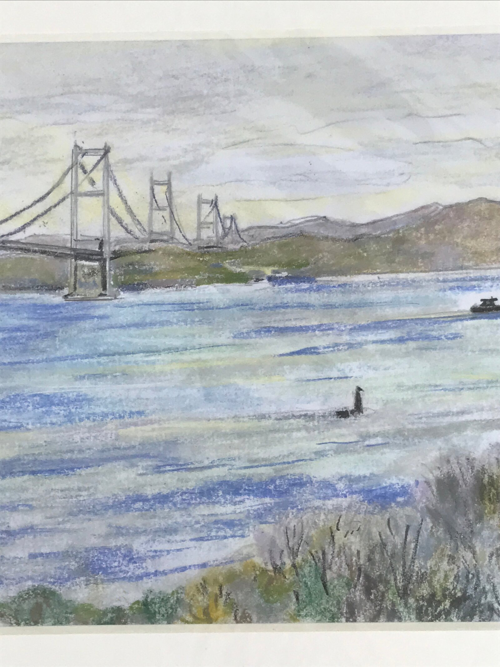 This original pastel drawing on cardstock paper features a side view of a suspension bridge over a river. Pastel is a gorgeous, often overlooked, art medium that blends colors together beautifully and this piece is no exception. It is adhered to a plain white matboard, ready for easy framing and has been stored in a plastic sleeve. This work is unsigned, but was among a collection of other similar drawings by the Japanese artist Yoshihiro Hagino.