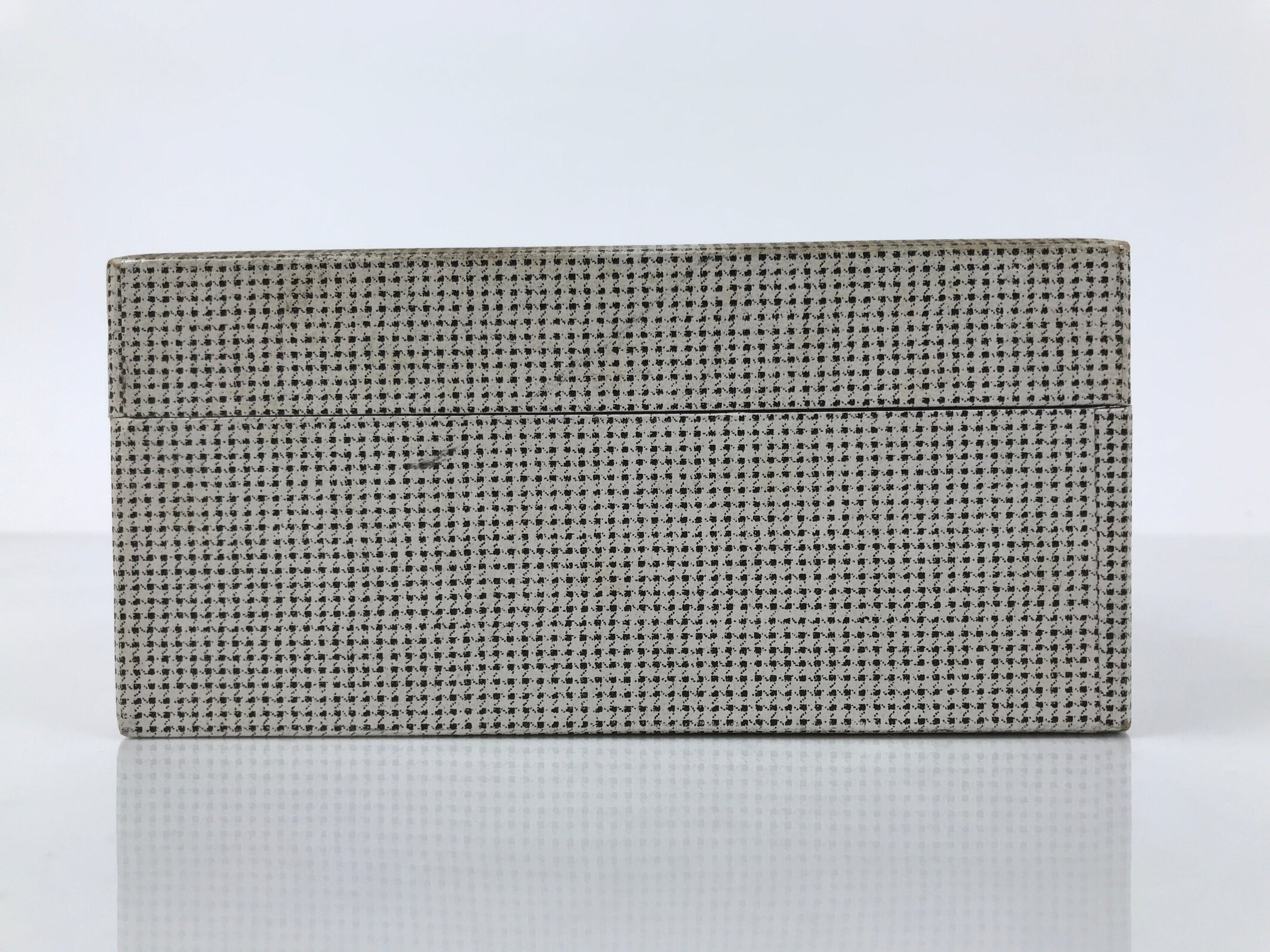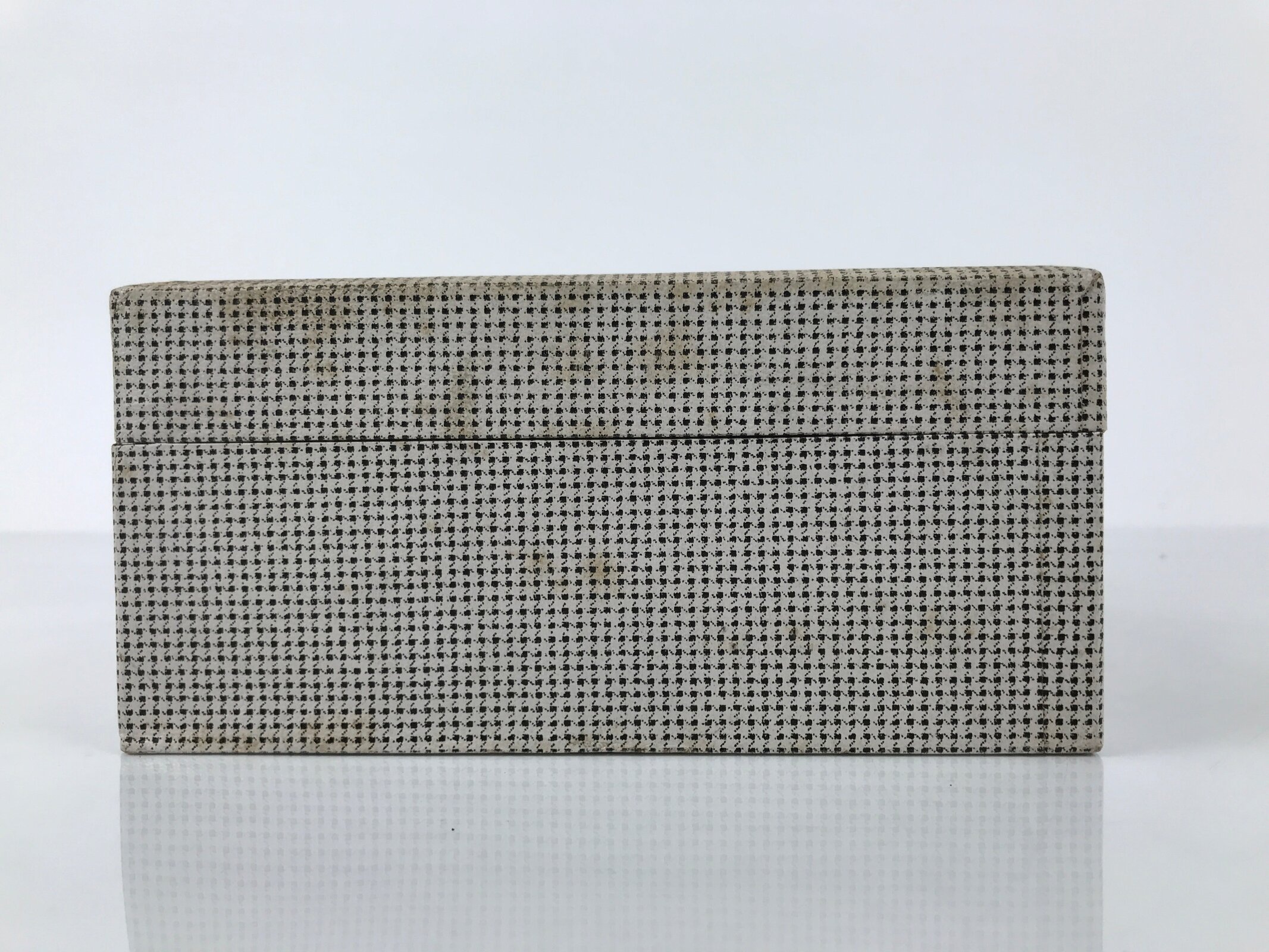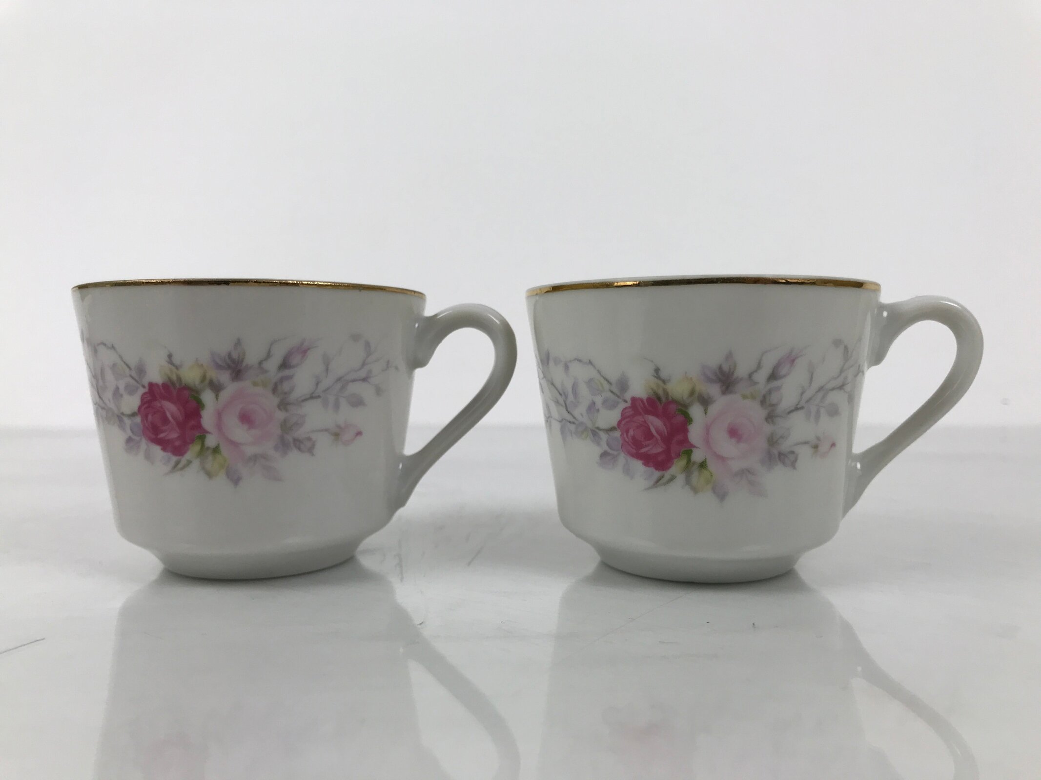 This is a vintage Japanese tea set cased in a wooden box. The box has a metal catch, a woven fabric-like paper surface, and a red lining. This set contains two white porcelain teacups, metal saucers, and metal spoons. Cups and saucers feature a red-and-pink rose design.