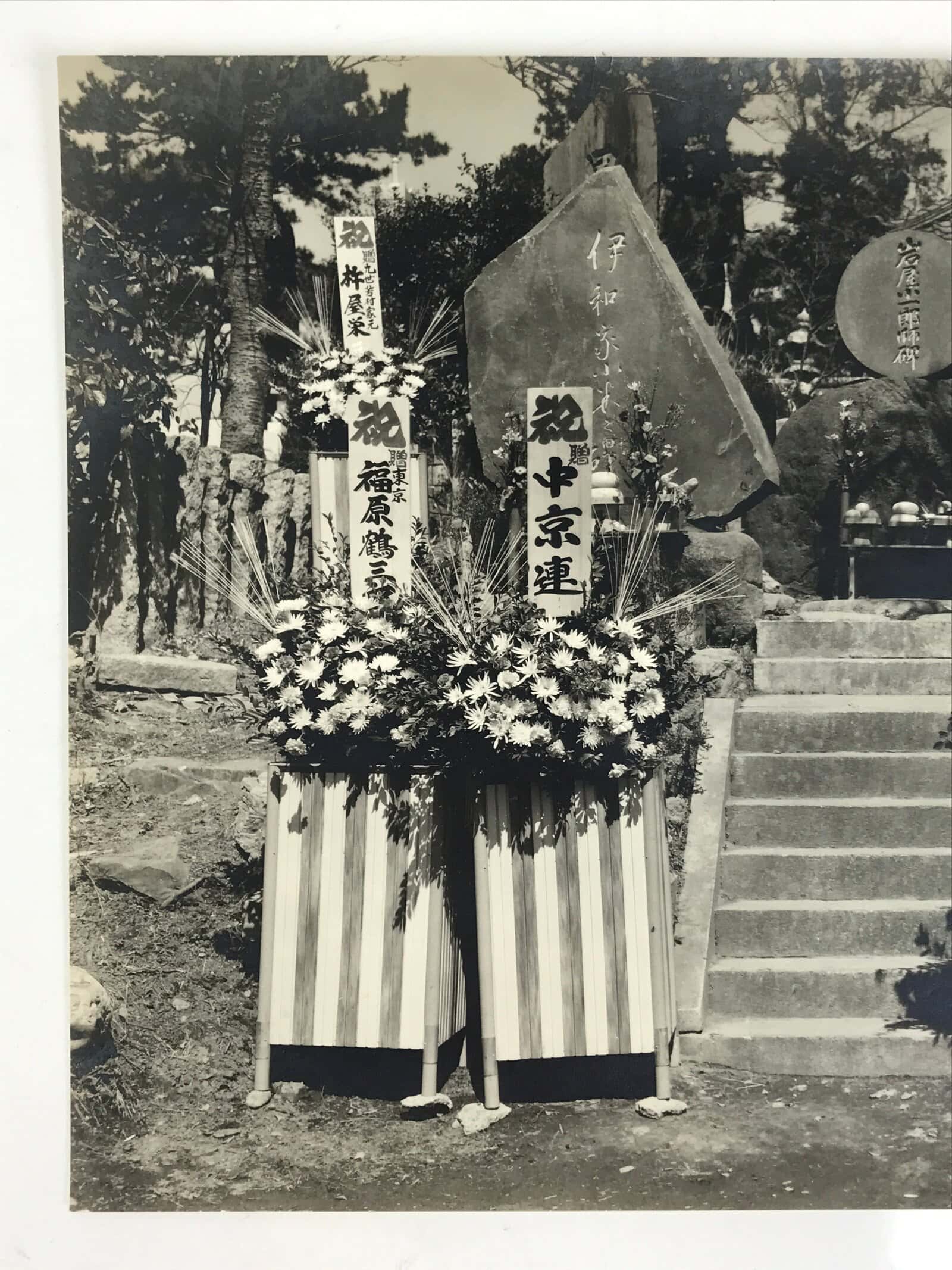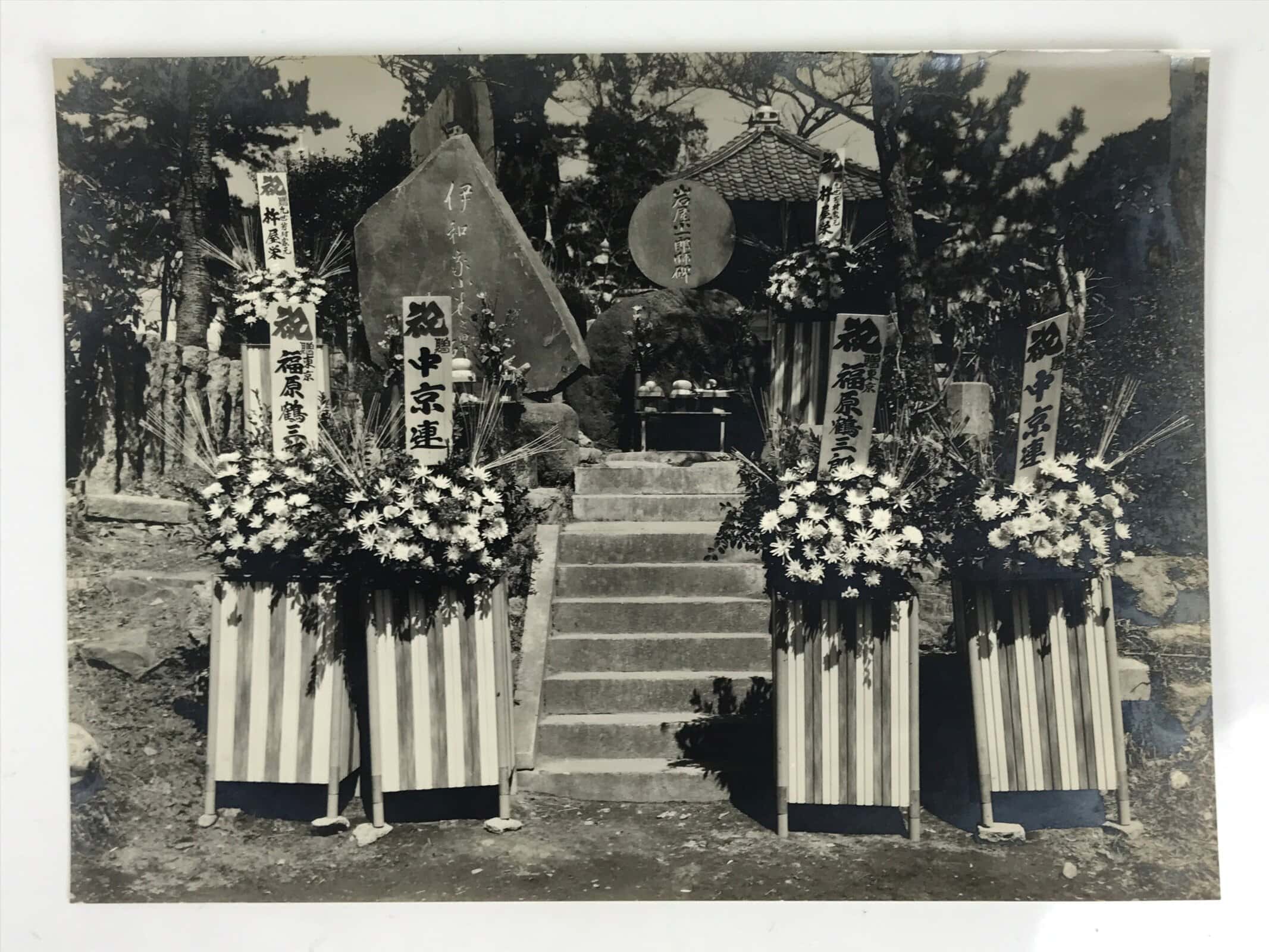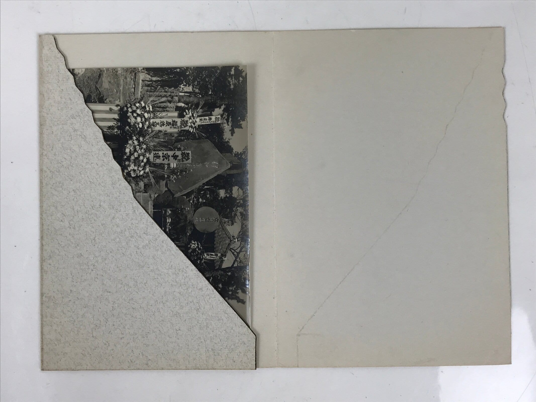 This is a vintage black and white commemorative photograph of a new stone monument erected at a temple. It has floral gift donation stands from people/businesses (which is a standard practice, even when opening businesses in Japan). The stone says Iwaya, but as there are numerous Iwaya temples/sacred locales in the Aichi/Gifu region, it is difficult to pinpoint which exactly. This photo comes stored in a gray paper folding cover.