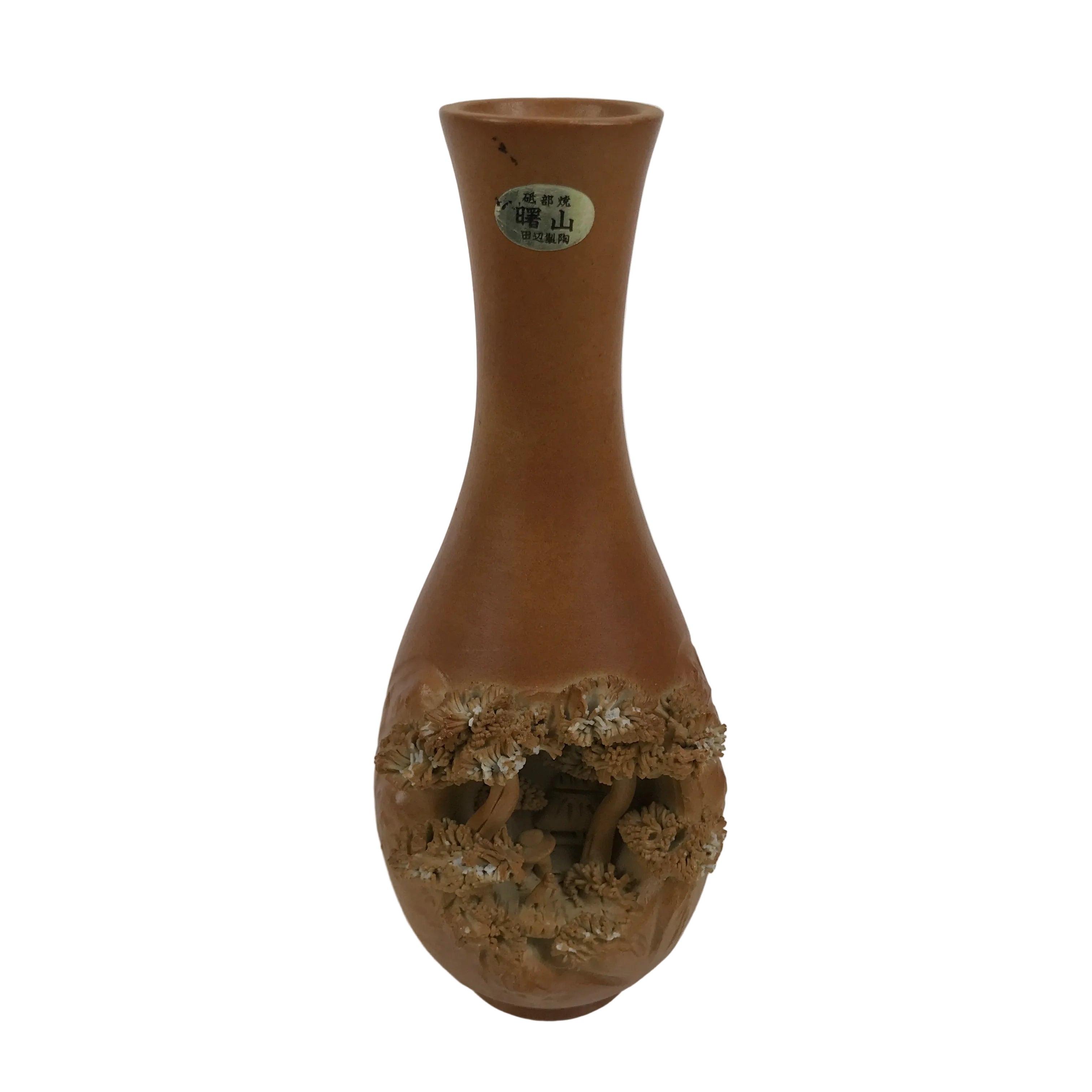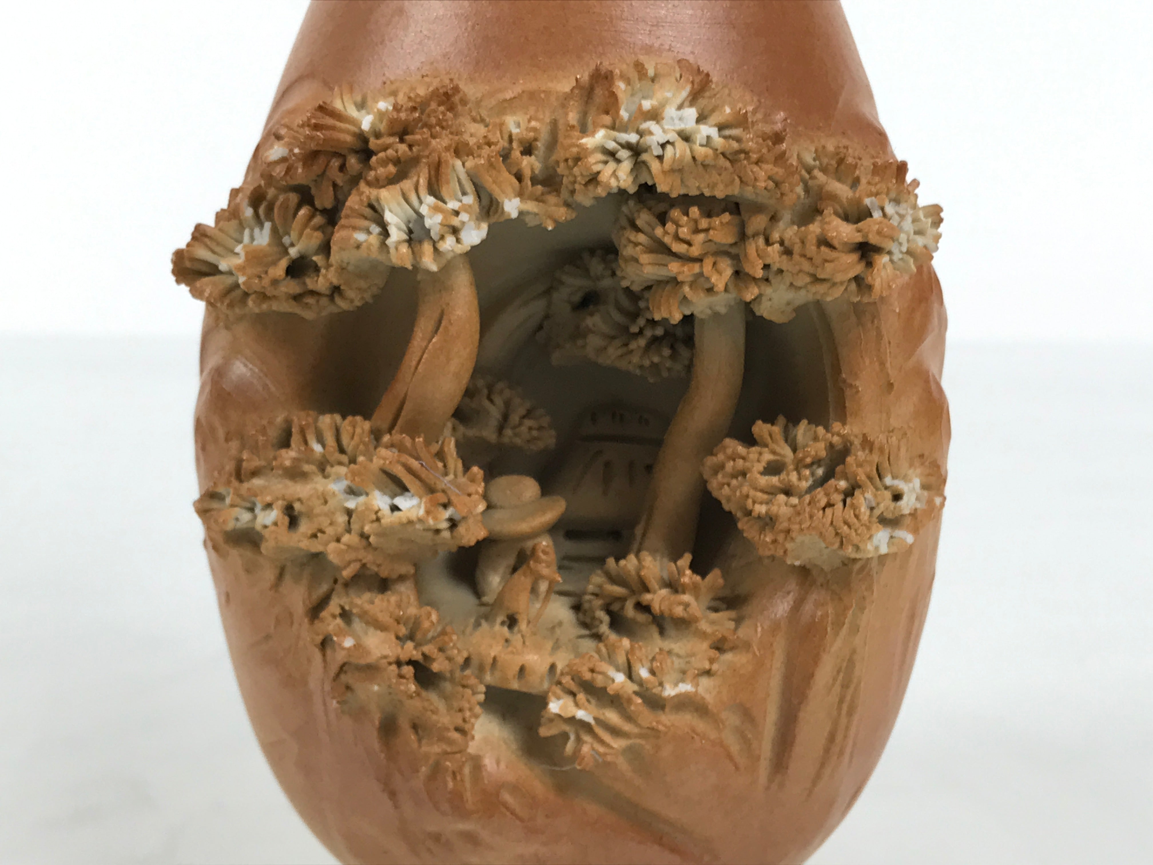 This is a vintage Japanese Tobe ware flower vase, or kabin. This brown ceramic vase has a round body and a long-narrow neck, a crane neck. It features an intricate carving on the body, depicting a small house and a standing lantern in a forest. There is a sticker on the top. It can be used for all types of flower arrangements, both ikebana and casual.