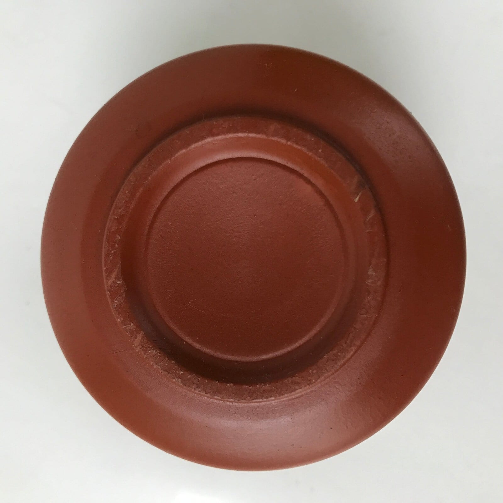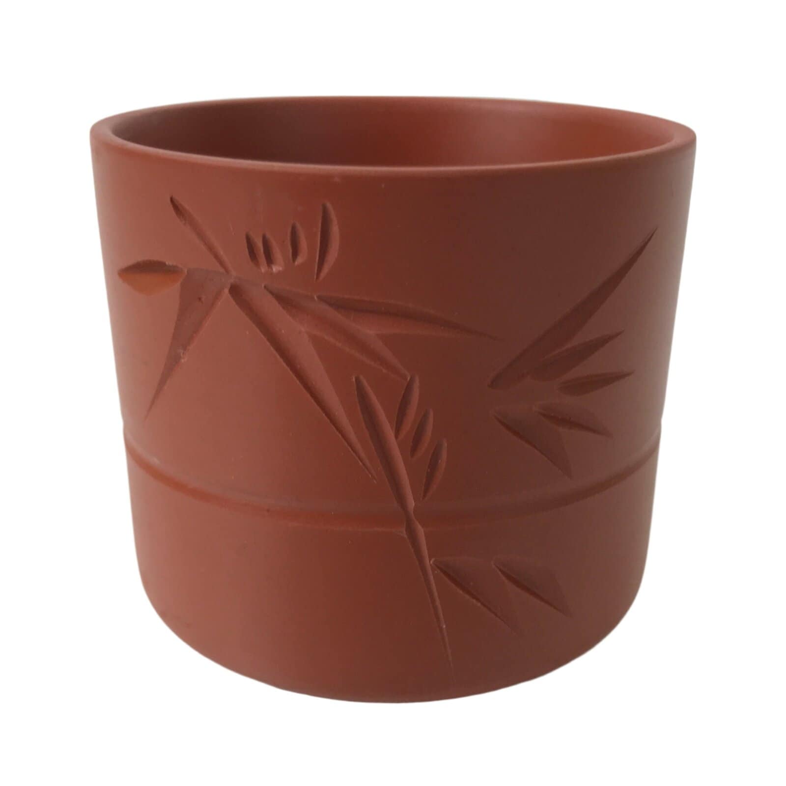 This is a vintage Japanese ceramic Tokoname ware teacup. Made of simple red clay, this pottery features a carved design of a bamboo stalk with leaves and a band around the middle. It is used for drinking sencha loose-leaf tea.