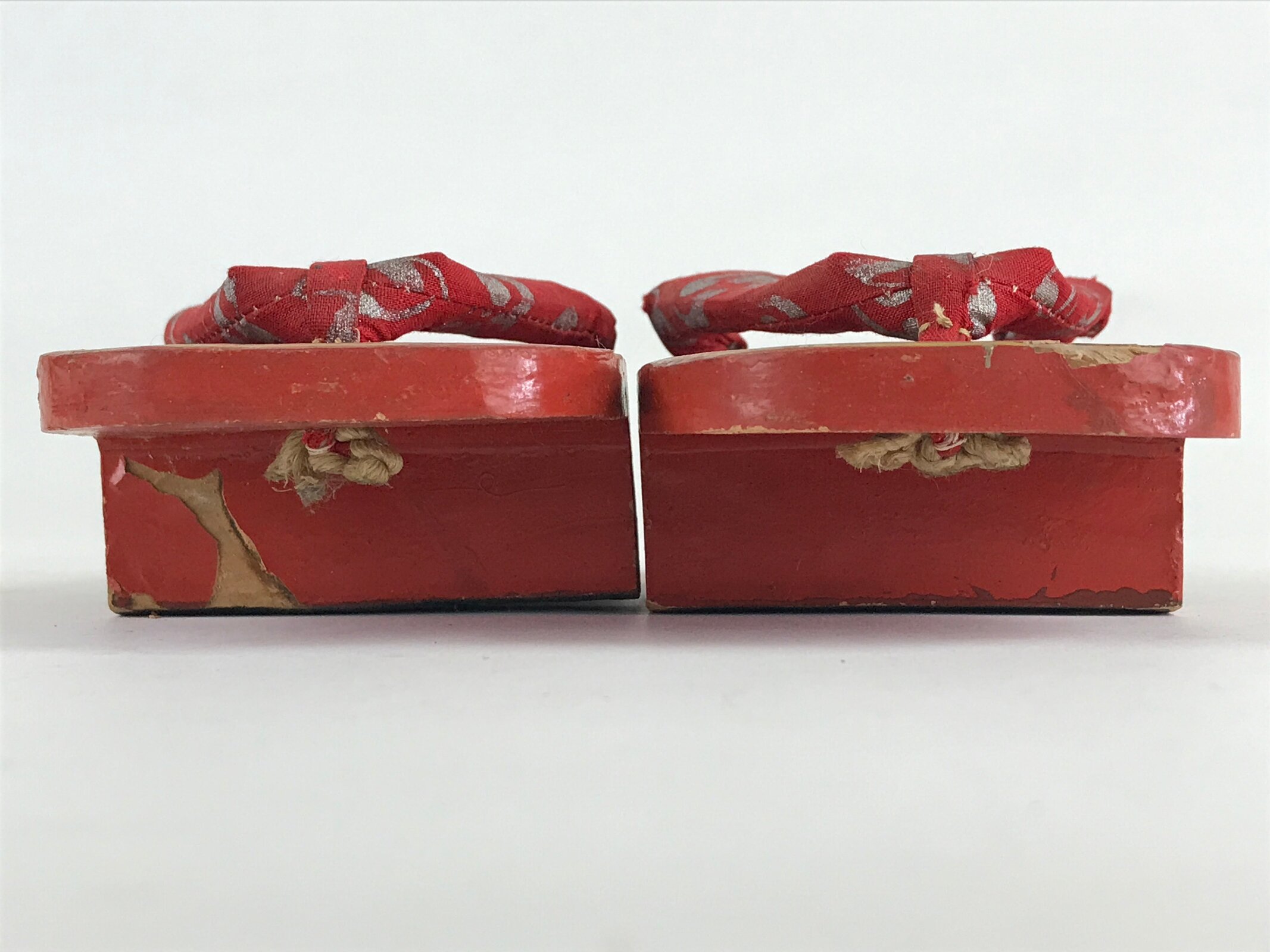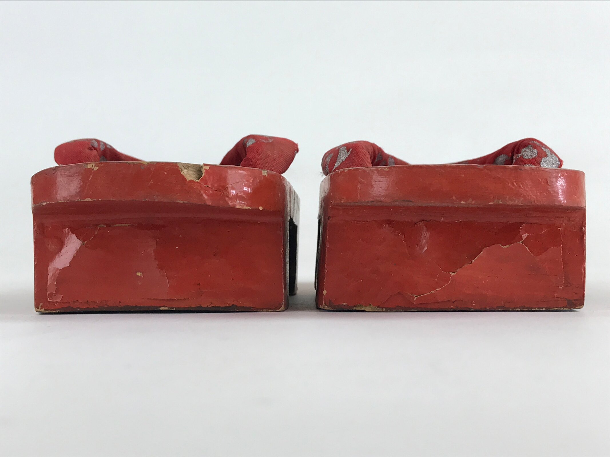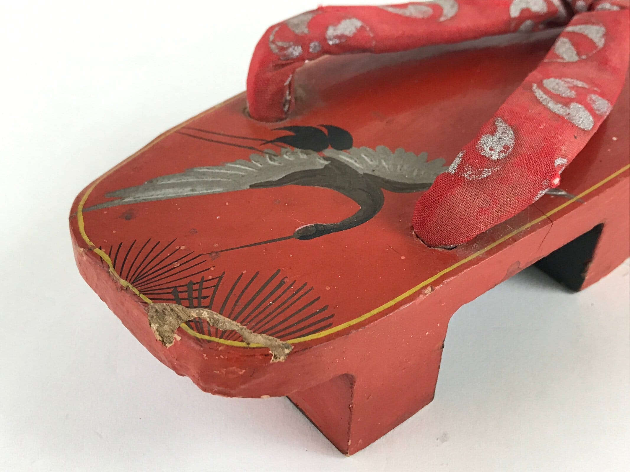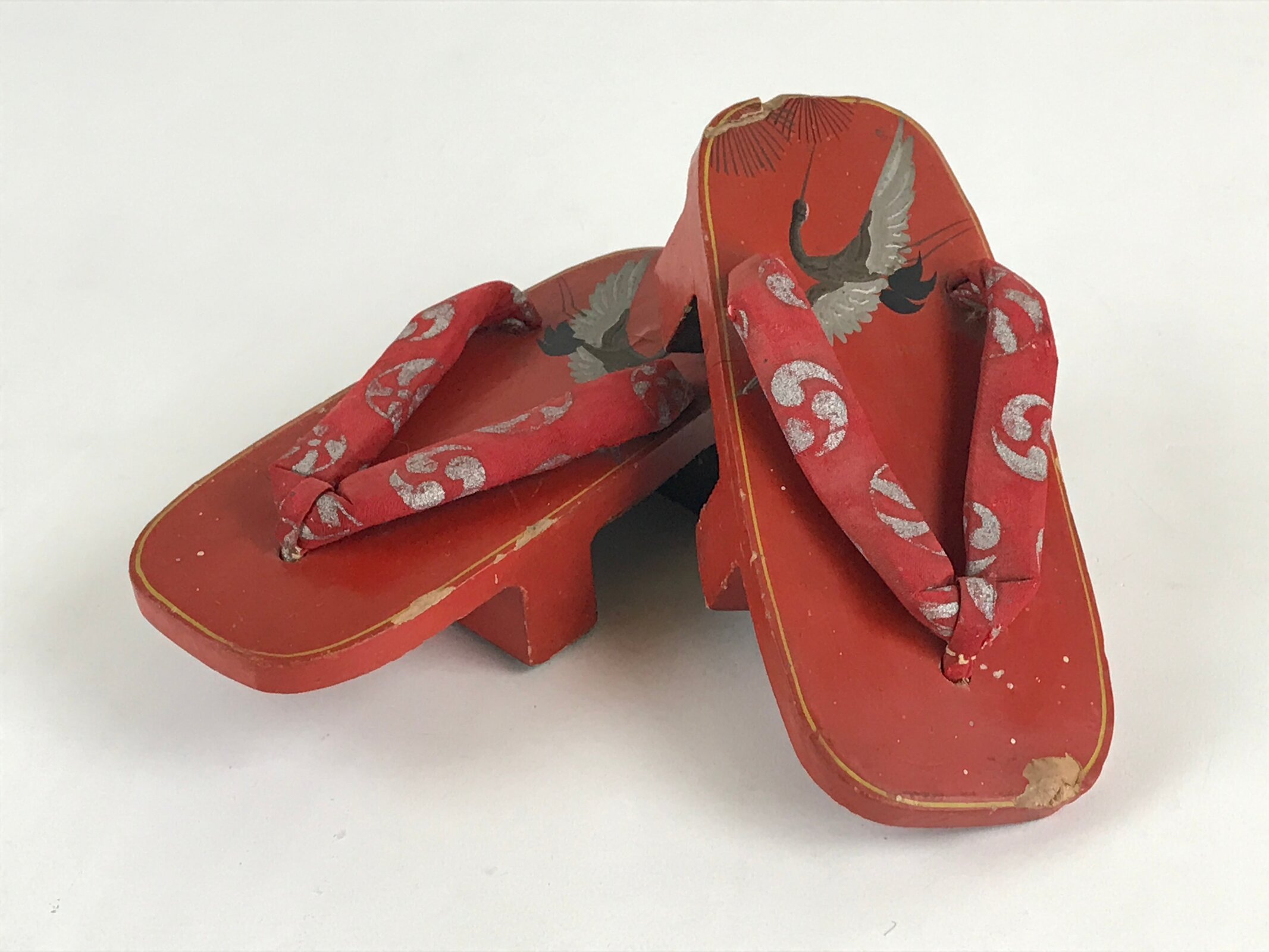 These are Japanese vintage wooden lacquered clogs Geta. These are red lacquered with fabric thongs and silver crane painted. Geta are traditional Japanese footwear with strings and teeth (wooden spikes) on the bottom. These were daily-use footwear. Nowadays, it is worn as part of fashion or with a yukata.