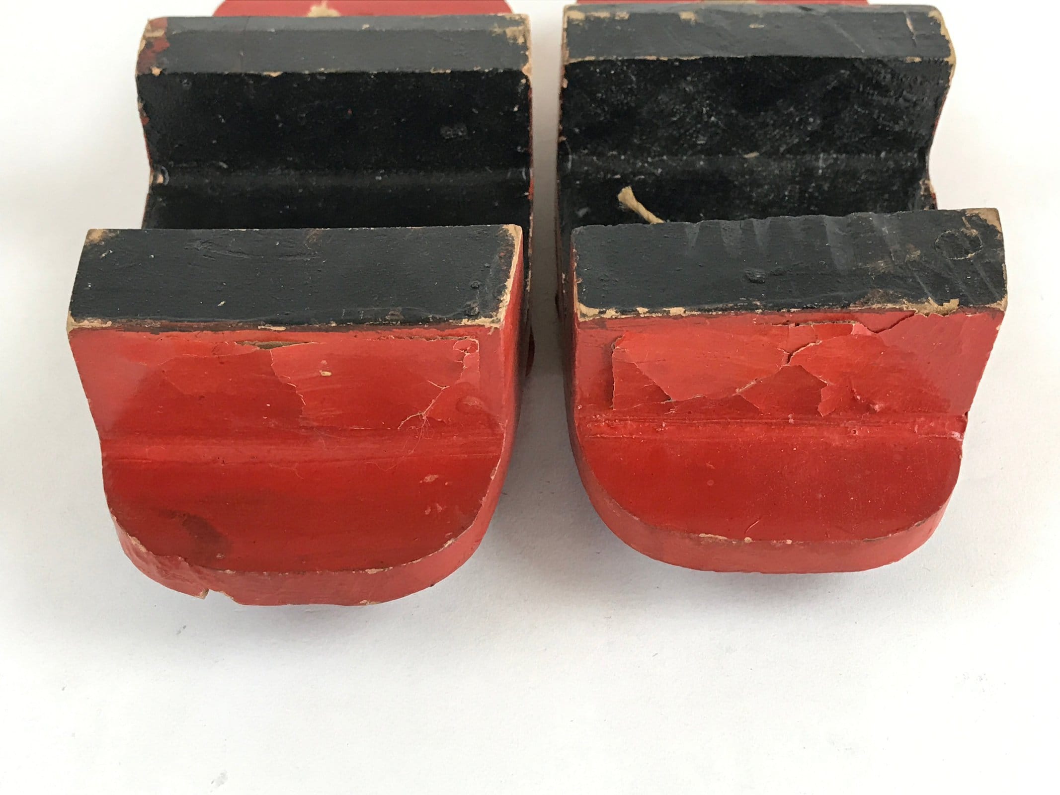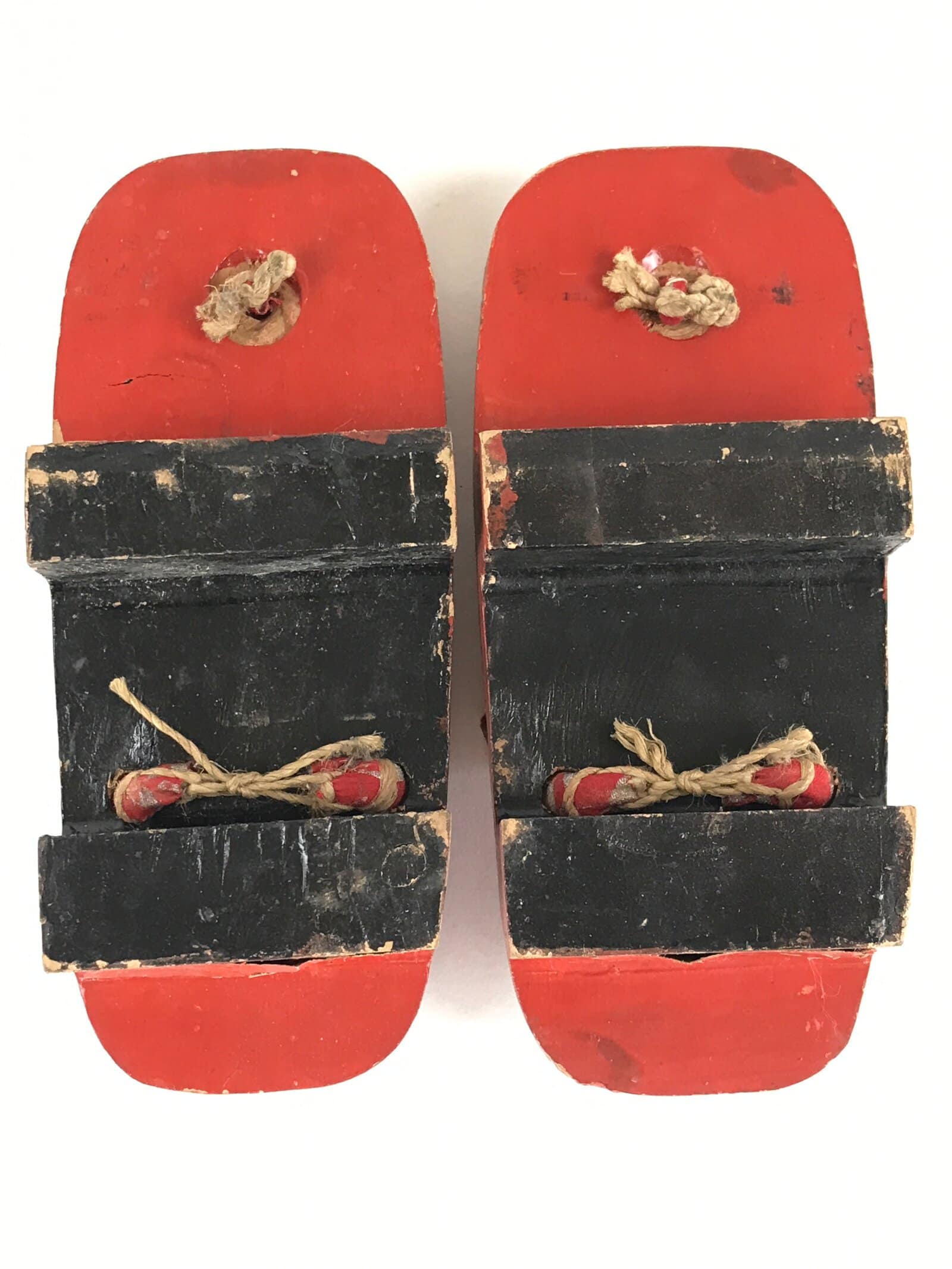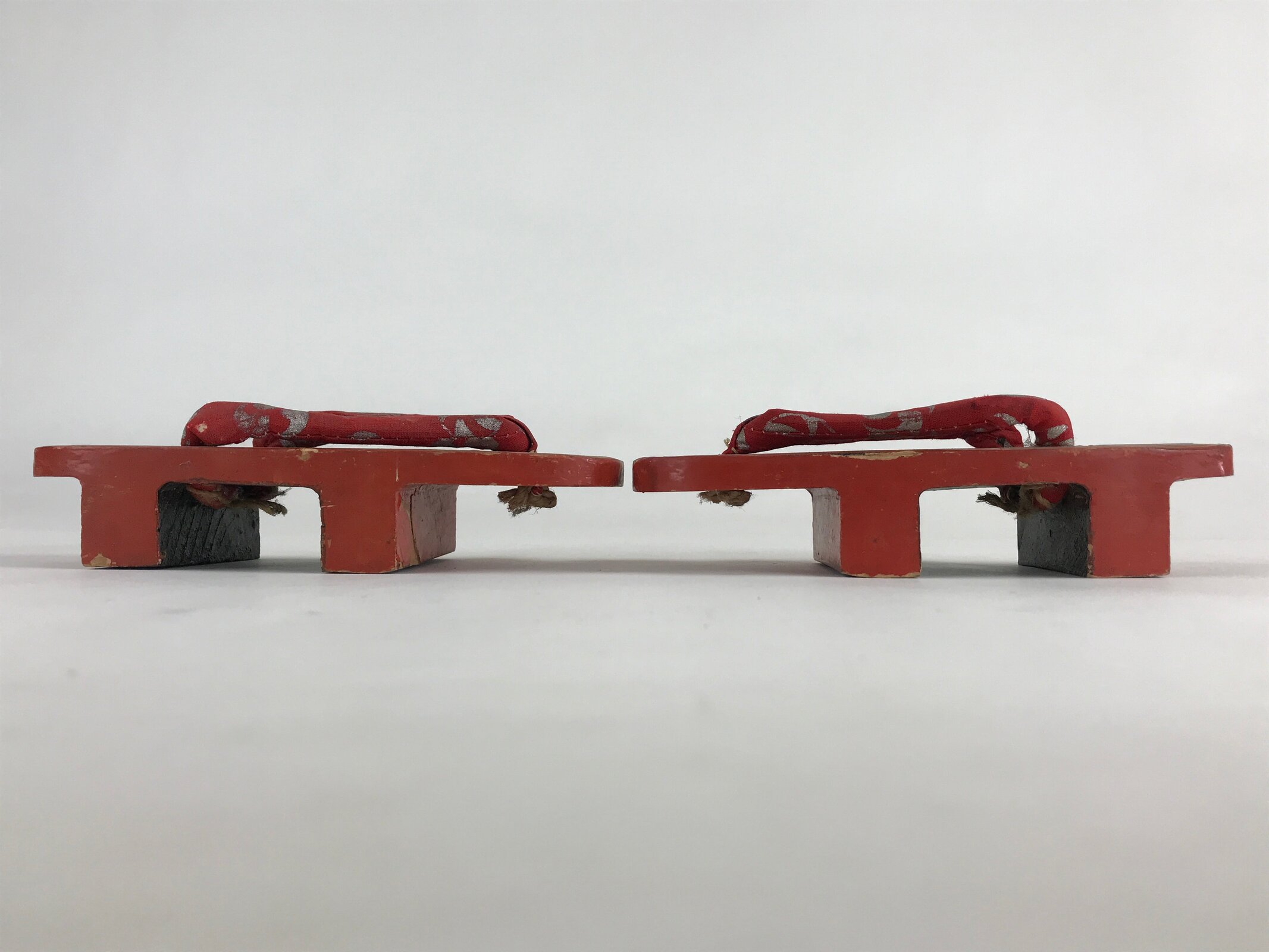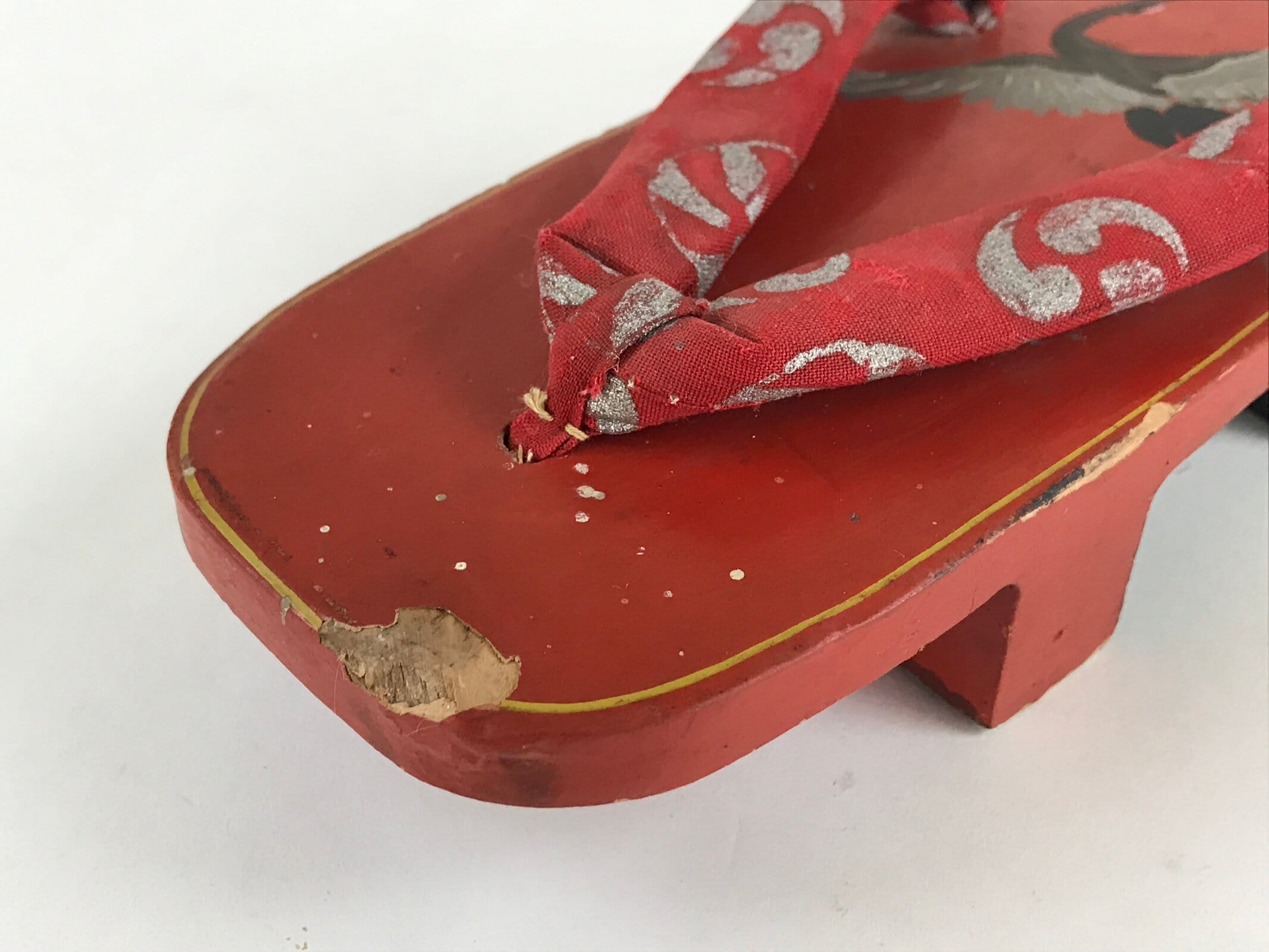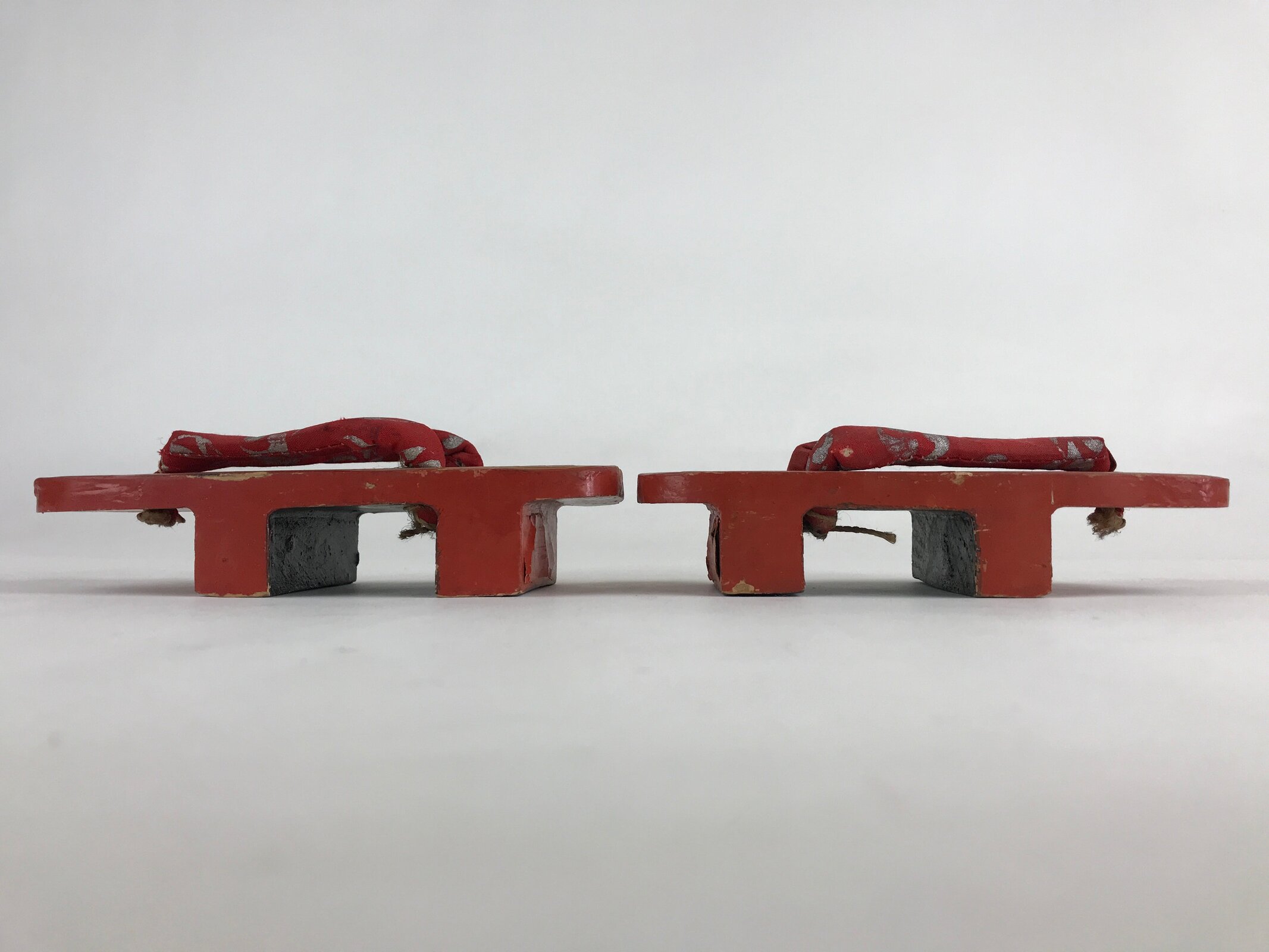 These are Japanese vintage wooden lacquered clogs Geta. These are red lacquered with fabric thongs and silver crane painted. Geta are traditional Japanese footwear with strings and teeth (wooden spikes) on the bottom. These were daily-use footwear. Nowadays, it is worn as part of fashion or with a yukata.