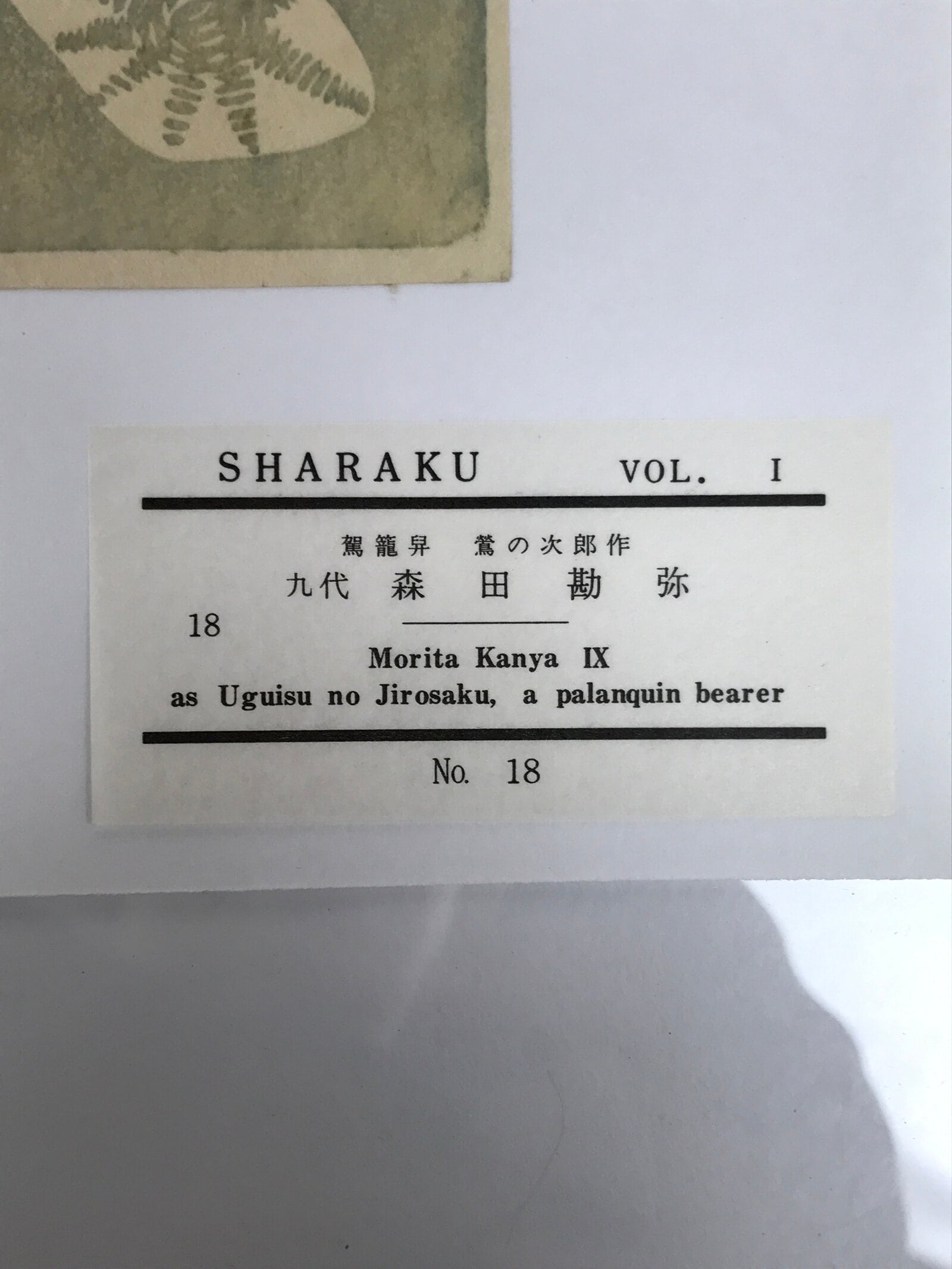 This Japanese ukiyo-e is a woodblock print by Toshusai Sharaku featuring a kabuki actor in character. The character is a man wearing a light blue and white kimono with geometrical patterns. This piece is titled ‘Morita Kanya IX as Uguisu no Jirosaku, a palanquin bearer’. The print is placed on a thick paper that folds in two with an opening on the top. There is a label with explanations in English on the inside. This piece is an authentic woodblock print, but it is a reprint, not a first edition.