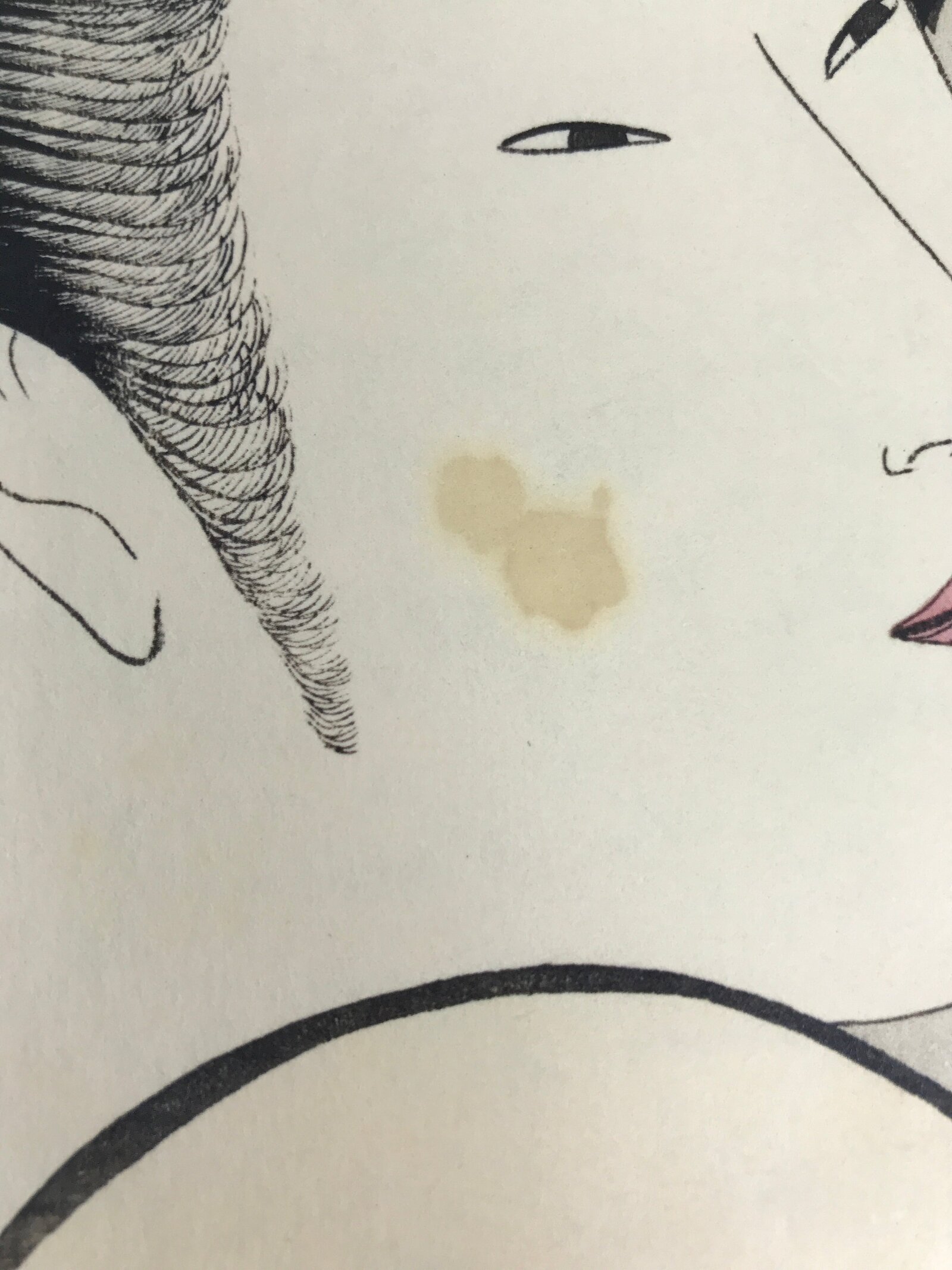 - Good condition considering age. Stains (face, hairpin). Corners slightly bent. Wear and tear due to age. Please see the photos.