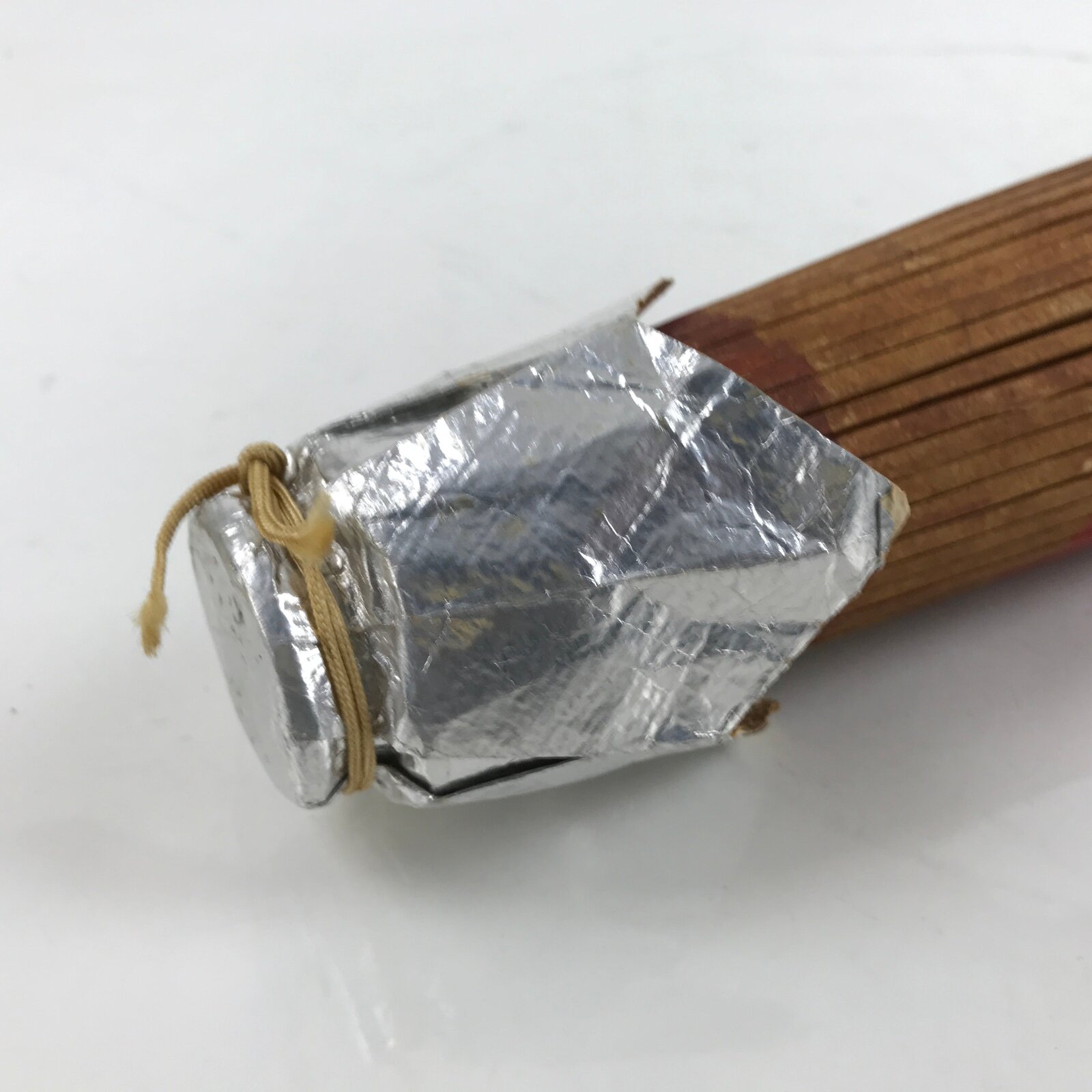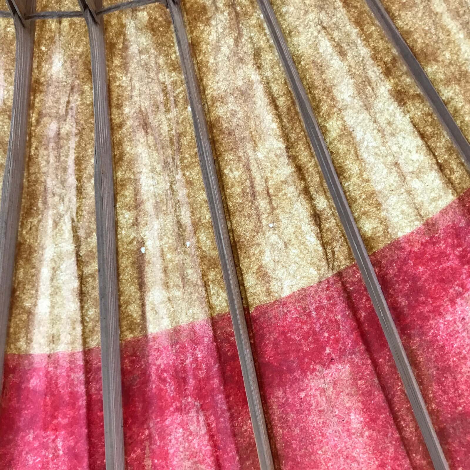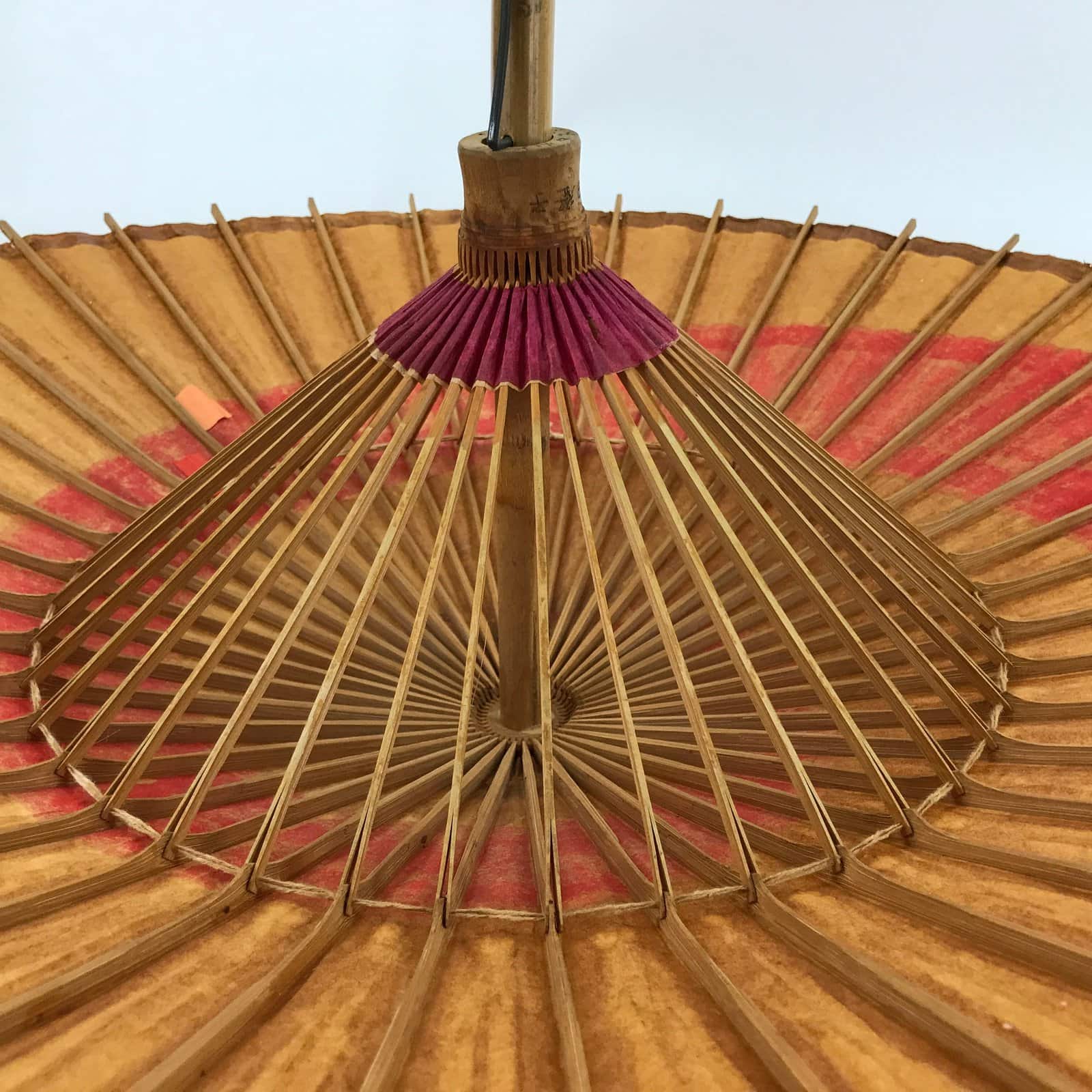 This vintage Japanese umbrella is covered in thick washi paper in a spiral red and gold pattern (perfect for spinning). The headpiece at the very top is made of silver foil paper tied with a beige string. The inside frame is stained a natural bamboo. The handle is a solid piece of bamboo in its natural state with a clear coat of lacquer.