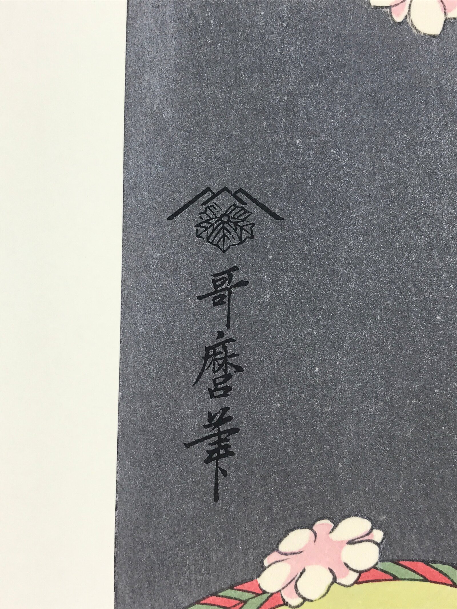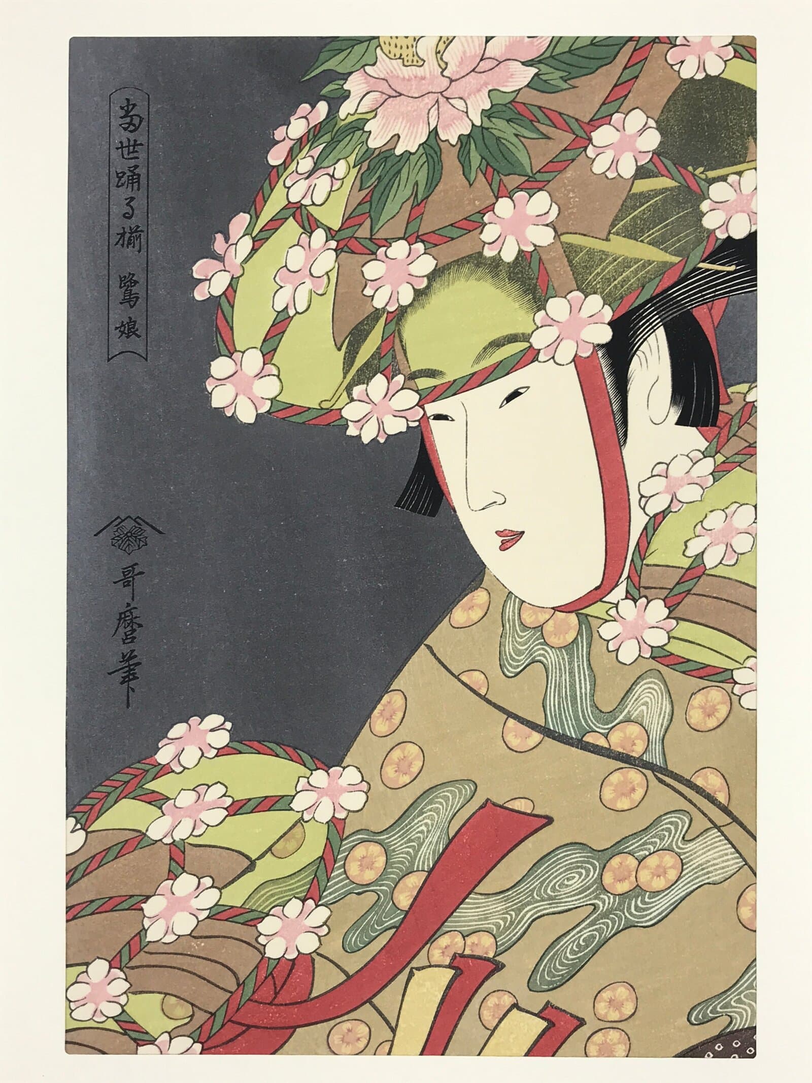 This is one of the 30 selections of vintage Utamaro Ukiyo-e woodblock printing published by Yuyudo. The title of the print is “当世踊子揃 鷲娘” dancing woman. Kitagawa Utamaro was a Japanese artist. He is one of the most highly regarded designers of ukiyo-e woodblock prints and paintings and is best known for his “Bijin ōkubi-e, large-headed pictures of beautiful women” of the 1790s. He also produced illustrated books on insects.