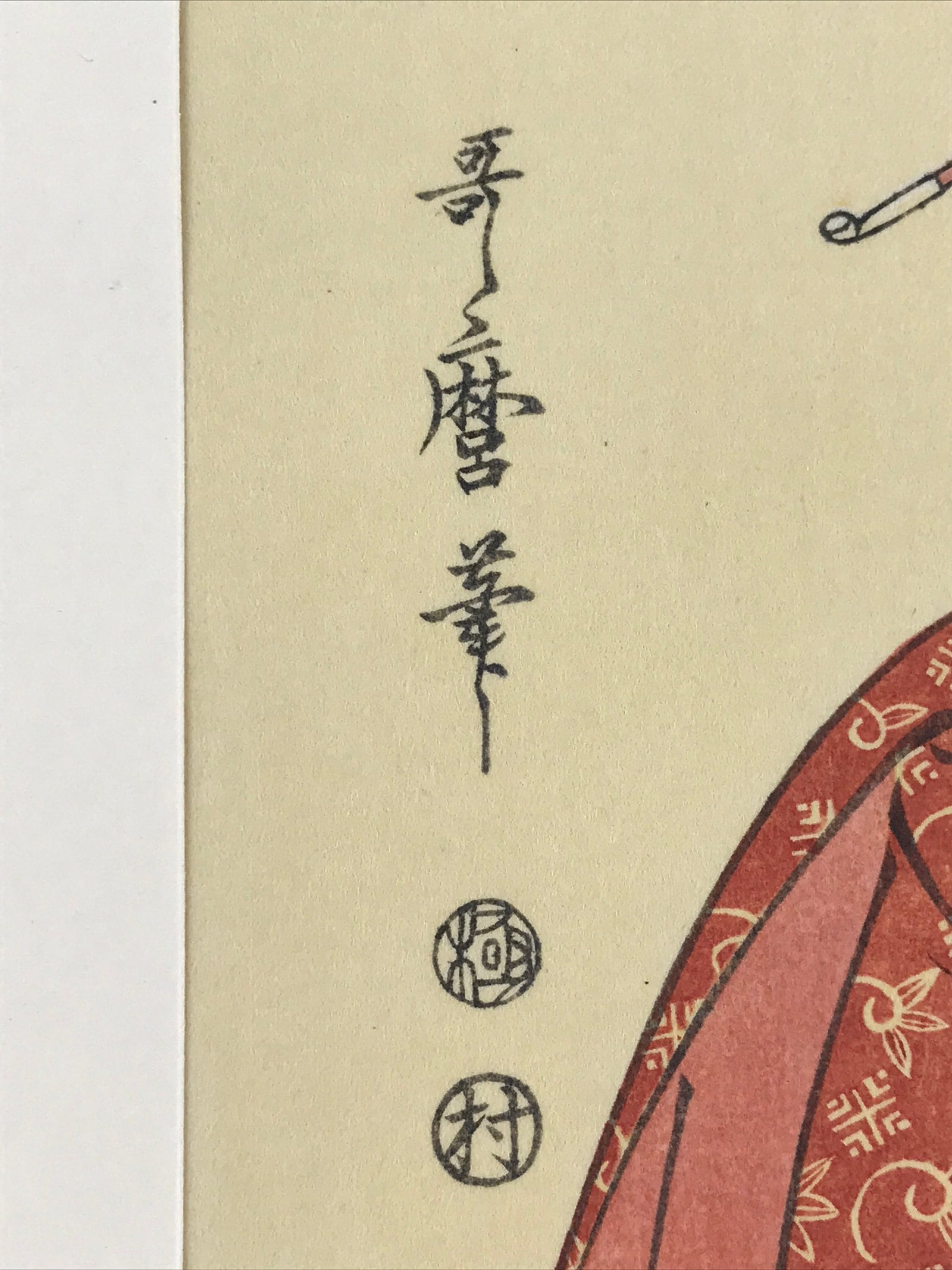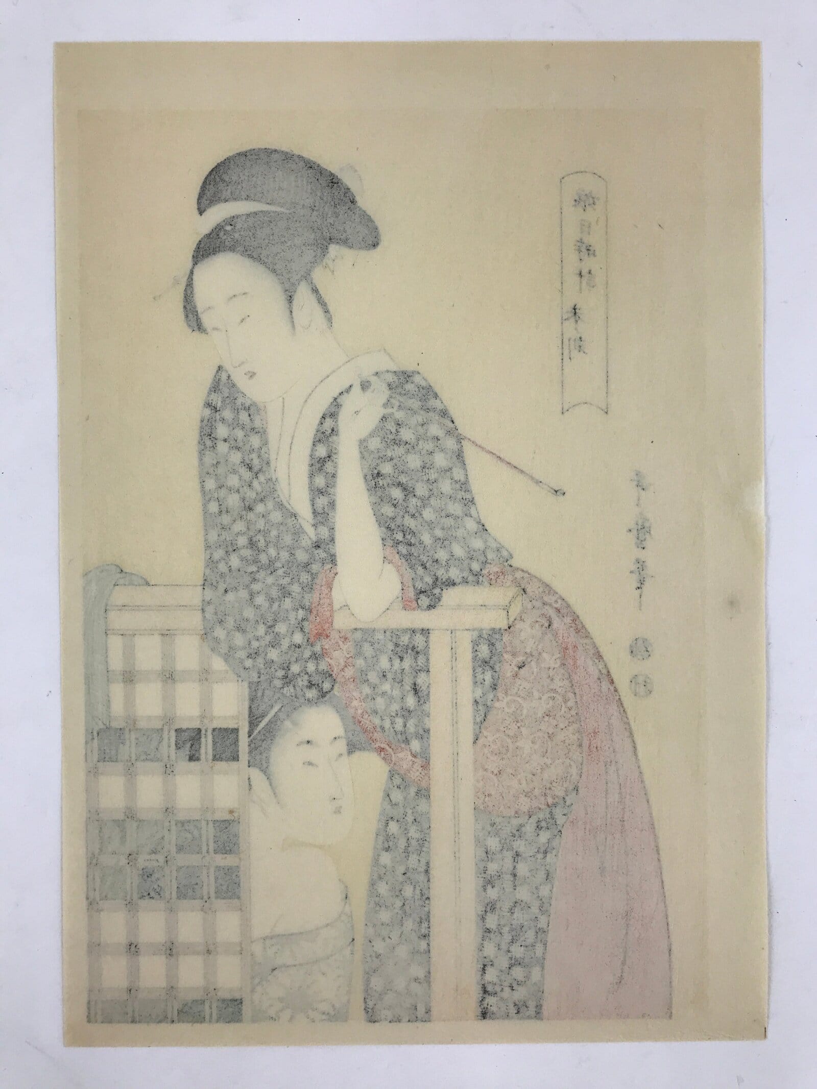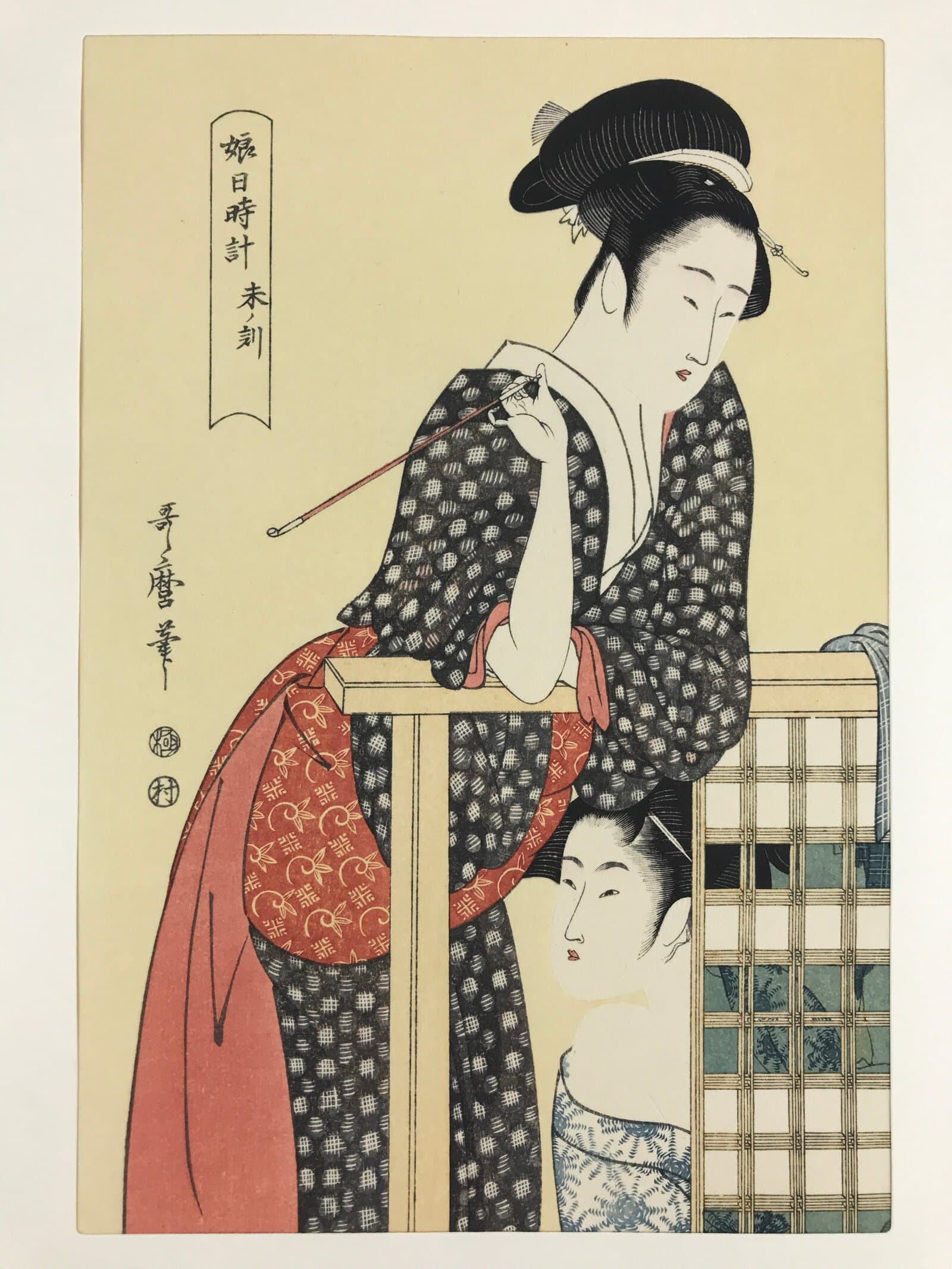 This is one of the 30 selections of vintage Utamaro Ukiyo-e woodblock printing published by Yuyudo. The title of the print is “娘日時計 未ノ刻” lady’s daily life. Kitagawa Utamaro was a Japanese artist. He is one of the most highly regarded designers of ukiyo-e woodblock prints and paintings and is best known for his “Bijin ōkubi-e, large-headed pictures of beautiful women” of the 1790s. He also produced illustrated books on insects.