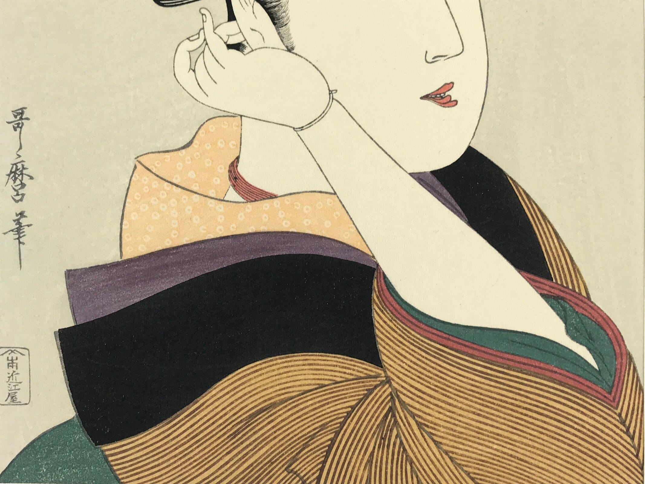 This is one of the 30 selections of vintage Utamaro Ukiyo-e woodblock printing published by Yuyudo. The title of the print is “高名美人六家撰 辰巳路考” beautiful Tatsumi geisha. Kitagawa Utamaro was a Japanese artist. He is one of the most highly regarded designers of ukiyo-e woodblock prints and paintings and is best known for his “Bijin ōkubi-e, large-headed pictures of beautiful women” of the 1790s. He also produced illustrated books on insects.