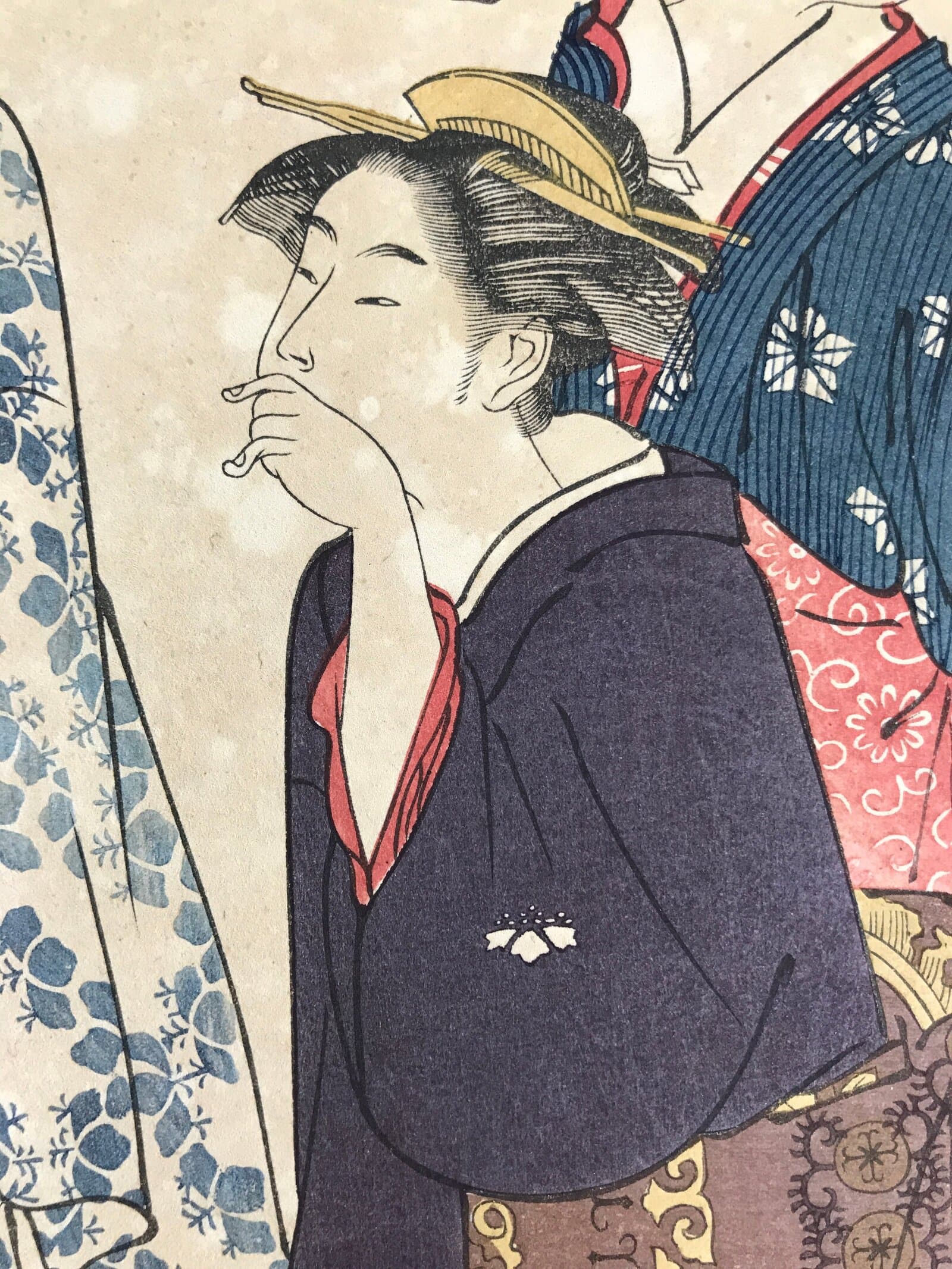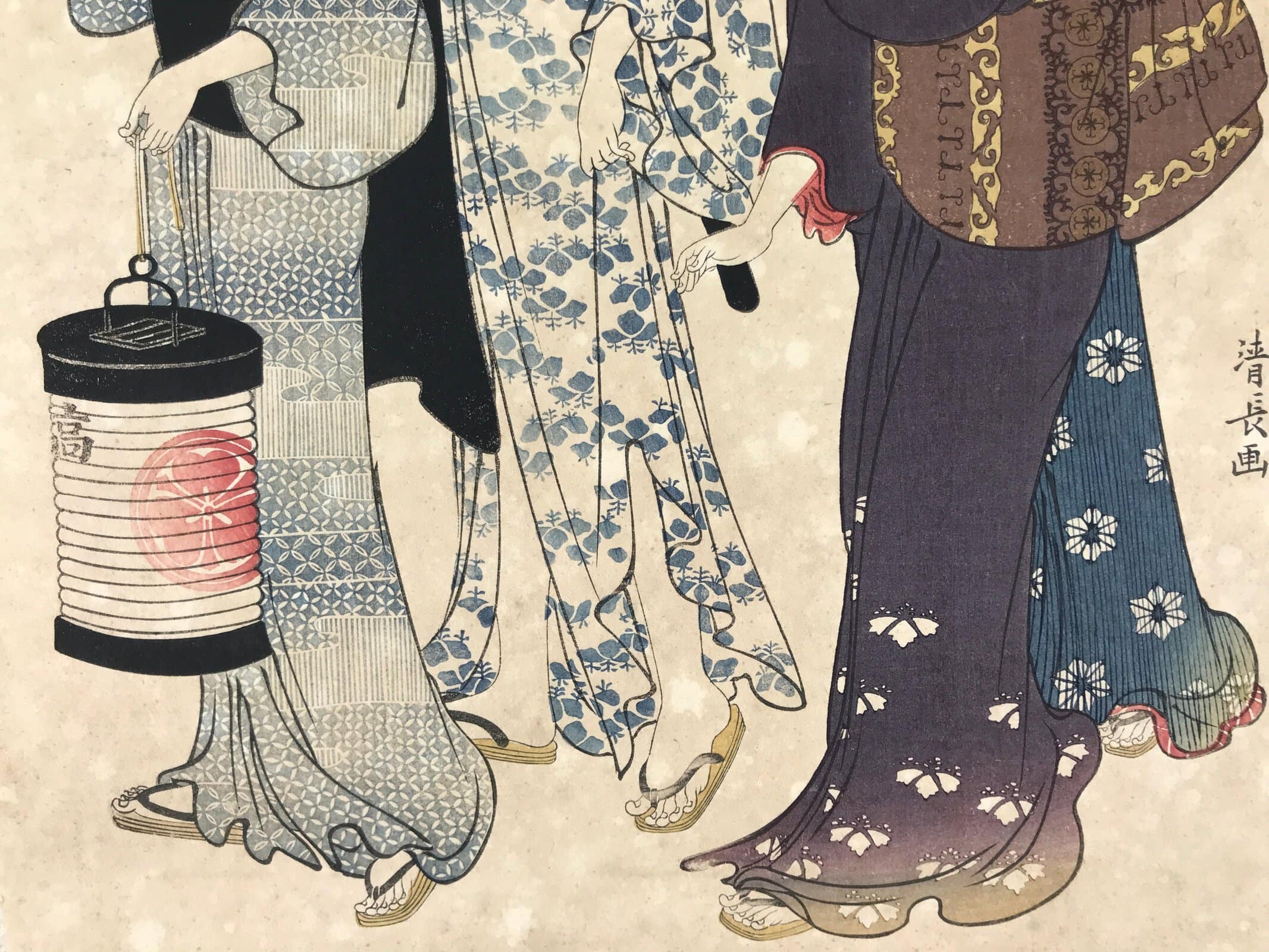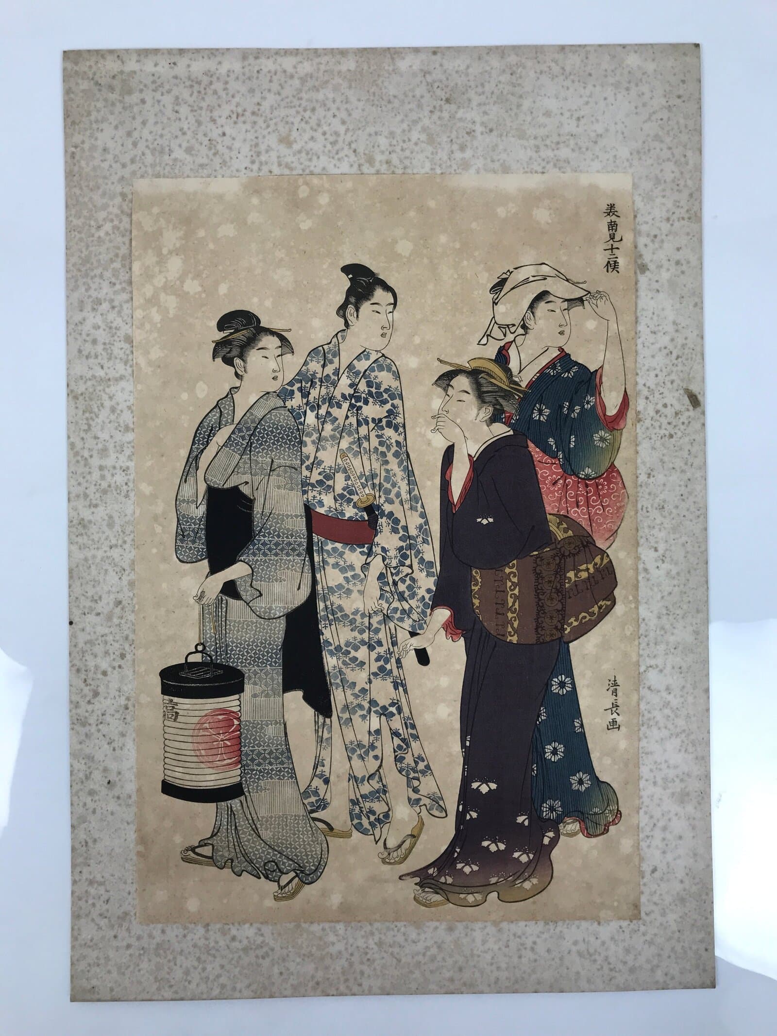 This Japanese ukiyo-e woodblock print by Torii Kiyonaga is called ‘Night Send Off in July’ from the series ‘Twelve Months of the Southern Quarter’. It 3 women, geisha or oiran courtesans, walking outdoors at night. A man is walking with the woman, and the first woman is holding a chochin paper lantern. This piece is an authentic woodblock print, but it is a reprint from the Showa period, not a first edition. The print is placed on a piece of cardboard.