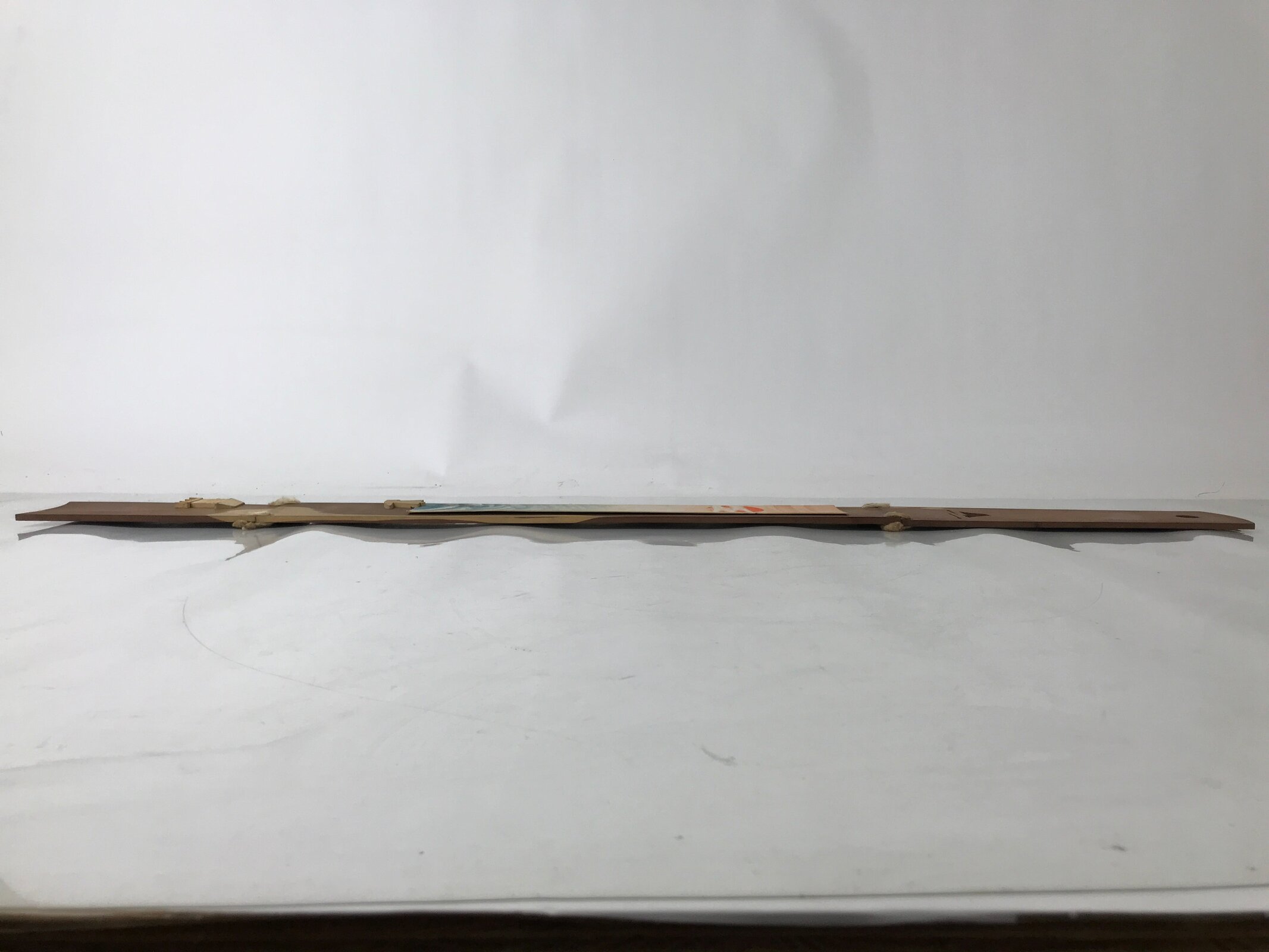 This is a vintage Japanese wooden wall hanging frame, Tanzaku-kake, with a Tanzaku. A Tanzaku is a long and narrow Shikishi used for painting and writing Japanese poems such as Haiku or Tanka. The Tanzaku features a beautiful painting of a rising sun over an ocean. It has a signature with red seals. The frame is made of three wooden plates and strings. The top plate has an opening shaped like Mt.Fuji. The second plate has a fixture for the paper. The lower plate has a wooden carved decoration of half of a building. It is foldable but can’t be folded completely.