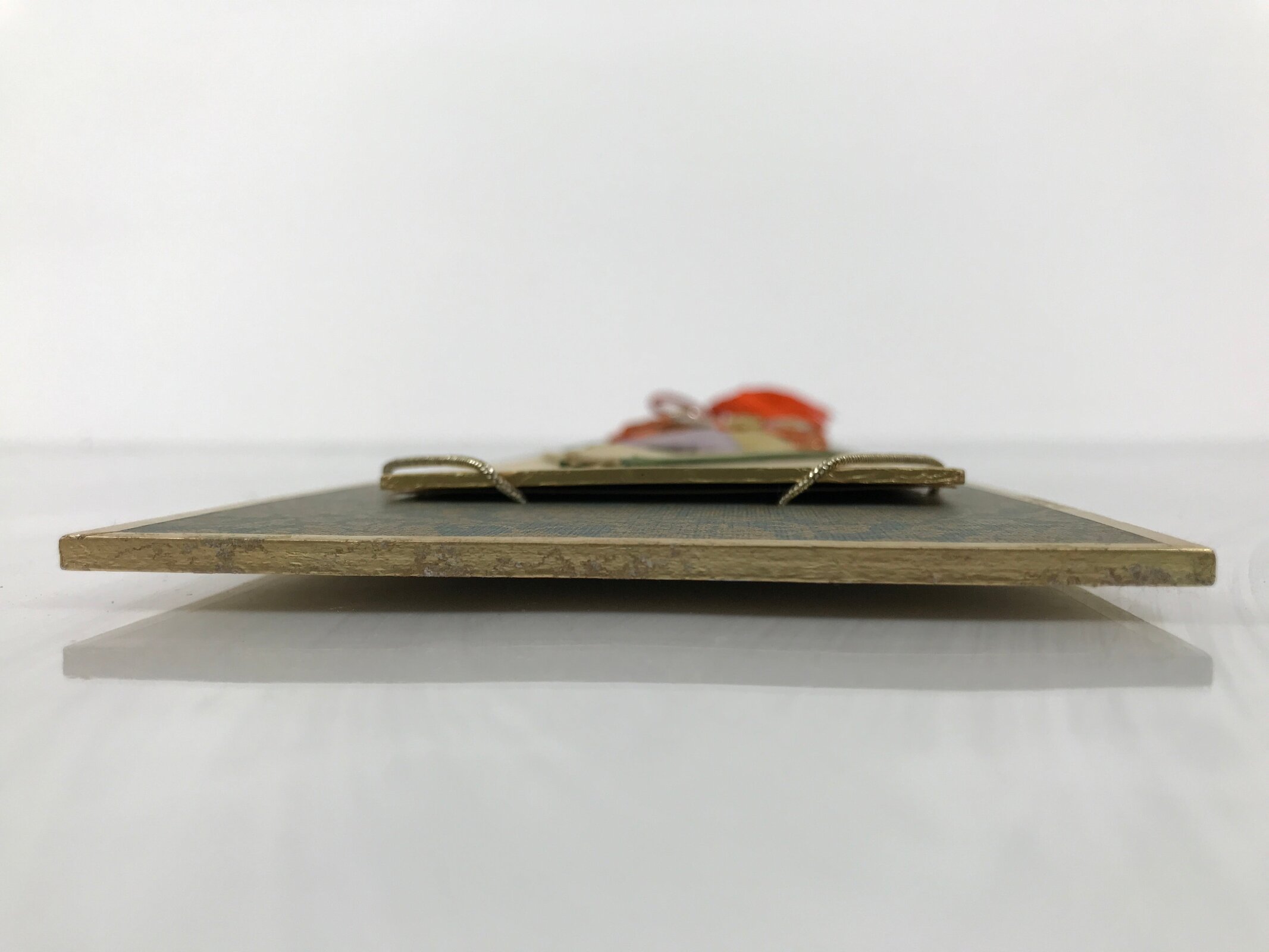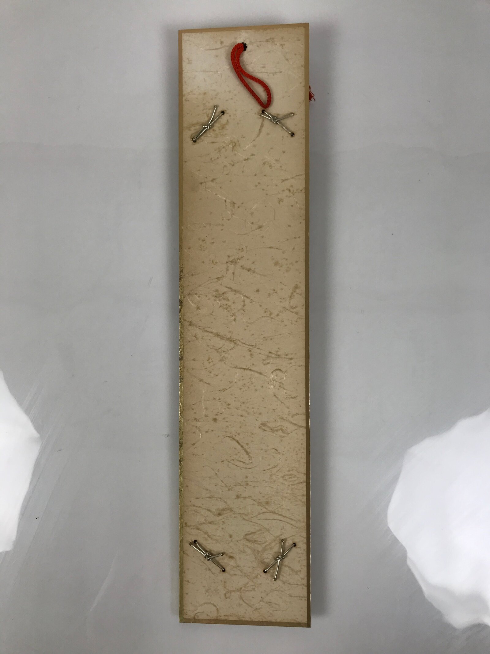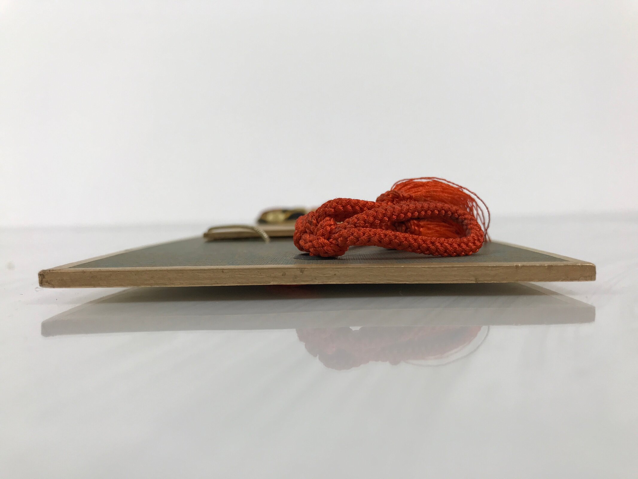This is a vintage Japanese wall hanging frame, Tanzaku-kake, made of wood or thick paper covered with washi paper on the back with a framed Tanzaku. A Tanzaku is a long and narrow Shikishi used for painting and writing Japanese poems such as Haiku or Tanka. The Tanzaku features a oshie pressed textile design with a kabuto helmet, a Japanese katana sword, and an iris flower (hana shoubu in Japanese). This design is perfect for Kodomo No Hi (Children’s Day). There is a orange string with tassels to hang up the Tanzaku-kake. This item comes in a box.