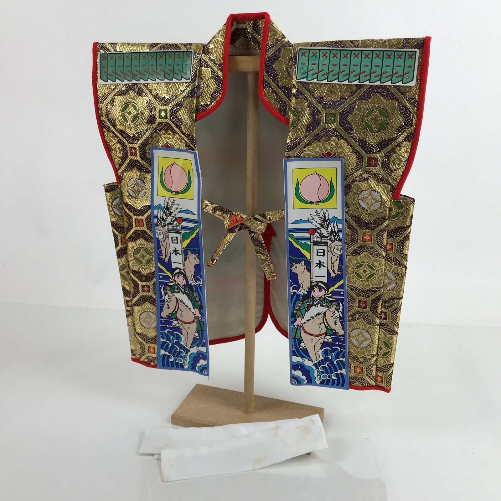 This is a vintage Japanese jinbaori, a sleeveless coat worn by samurai over their armor on the battlefield. This surcoat is navy with a geometrical abstract gold pattern with orange, white and green details. There are pieces on the front with pictures of Momotaro with his 3 animal companions. This piece can be displayed on the stand instead of a Gogatsu-Ningyo but it is designed to be worn by small children. This jinbaori warrior surcoat comes with a storage box.