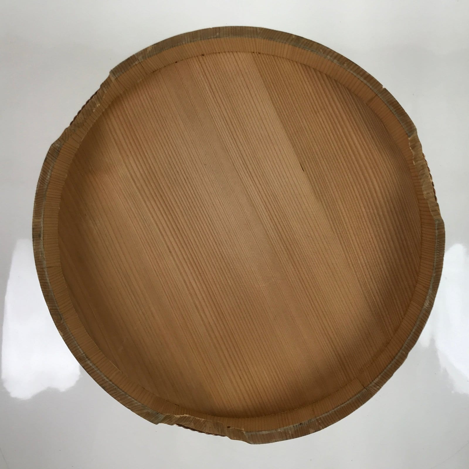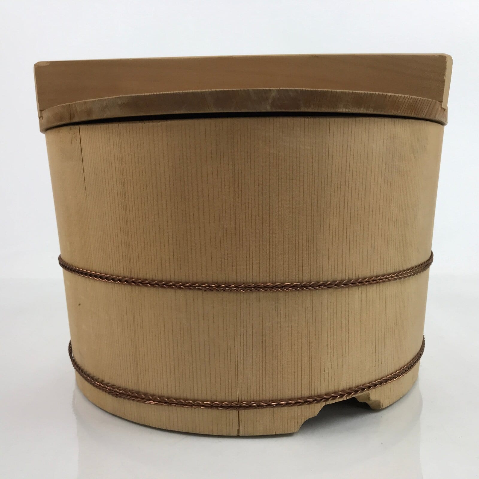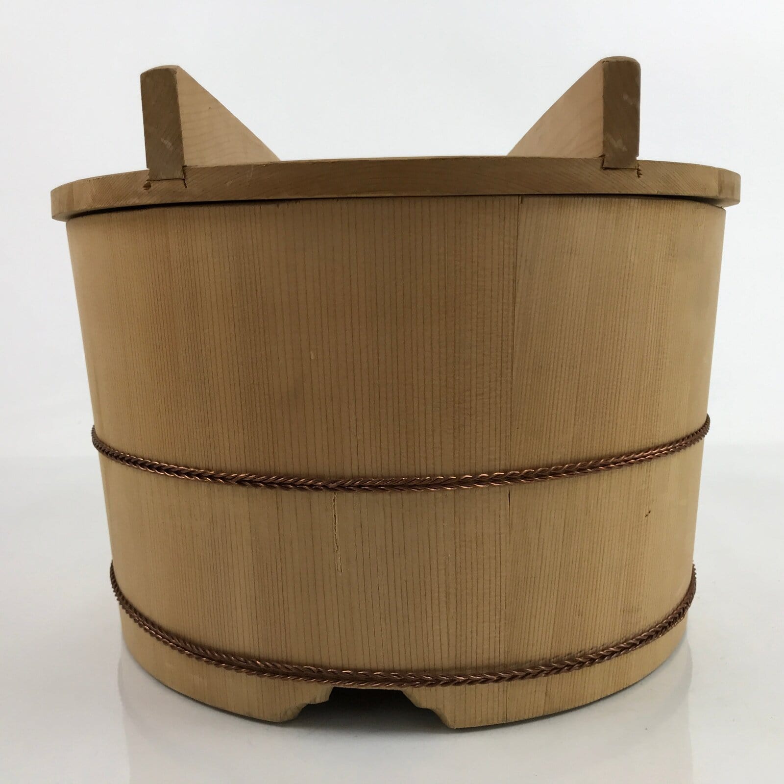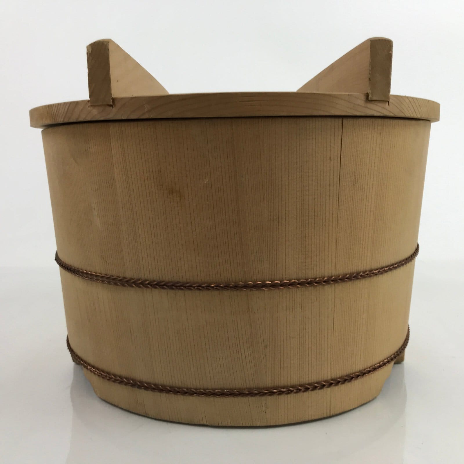 This is a Japanese vintage wooden sushi bucket. It is called Sushioke, Hangiri, or Handai. Sushioke is a bucket used to serve sushi. This is usually made of wood and is firmly held together by two thin metal plates or wires called Taga. This particular sushi bucket has twisted wires. It comes with a lid.