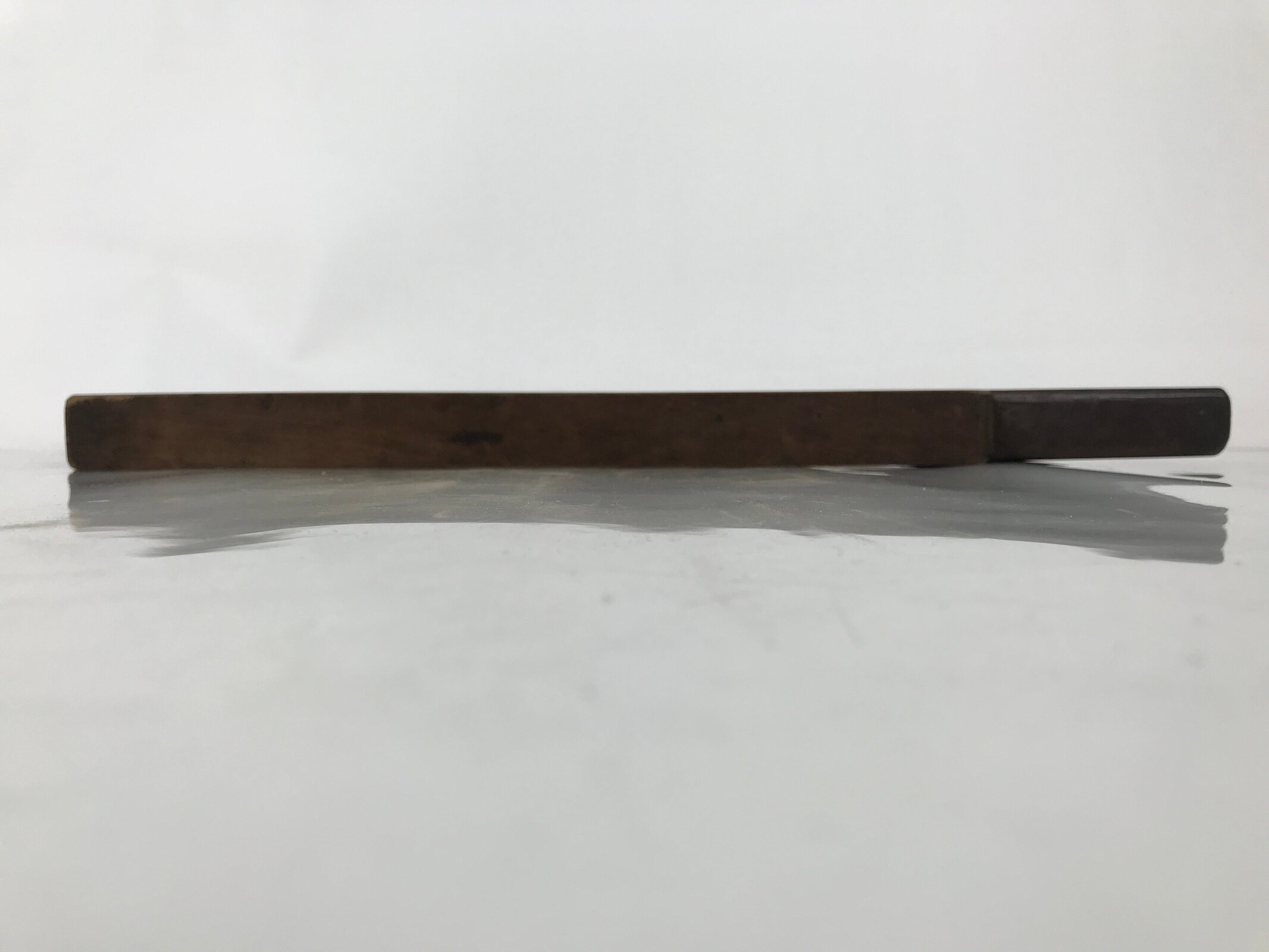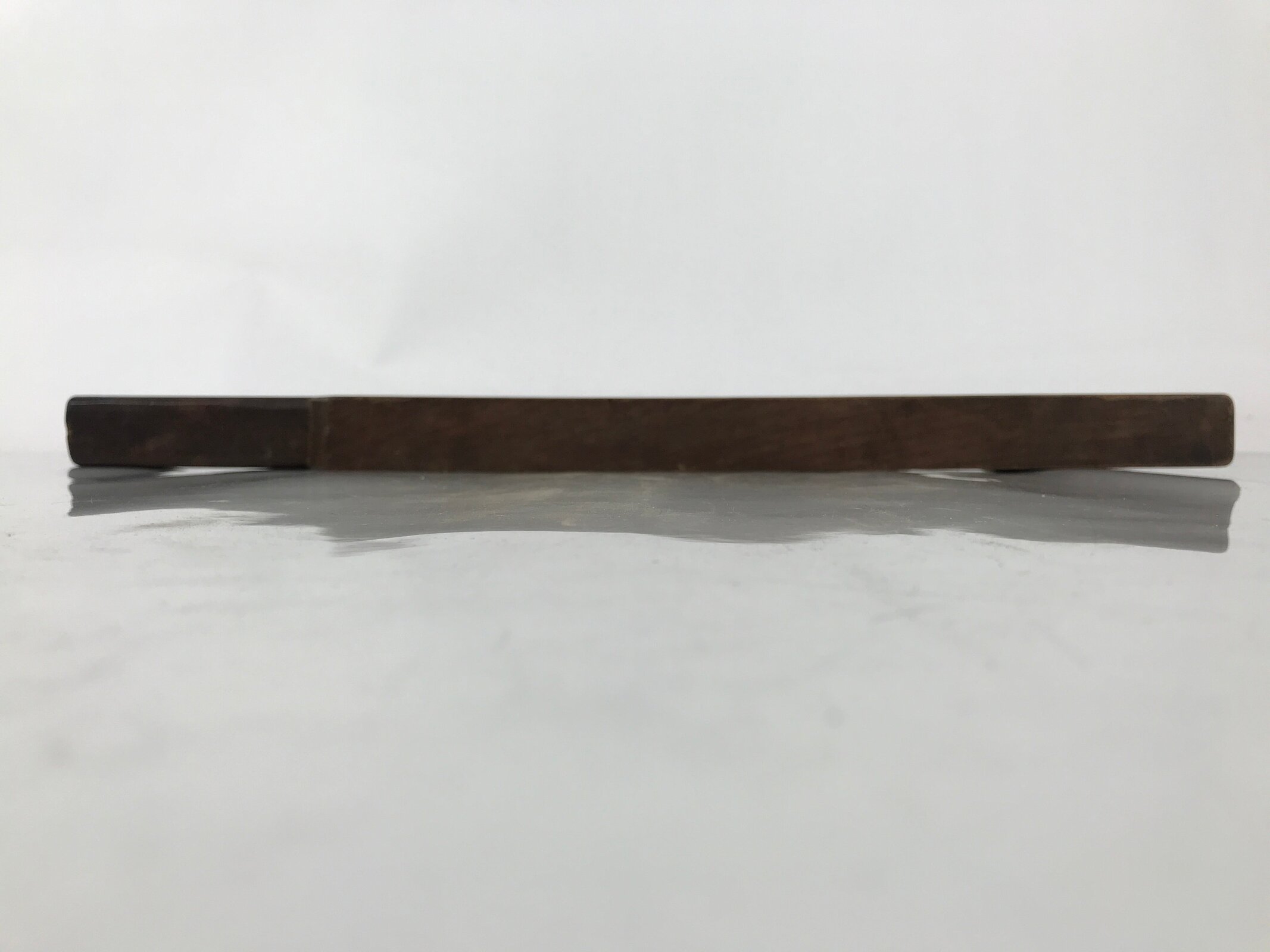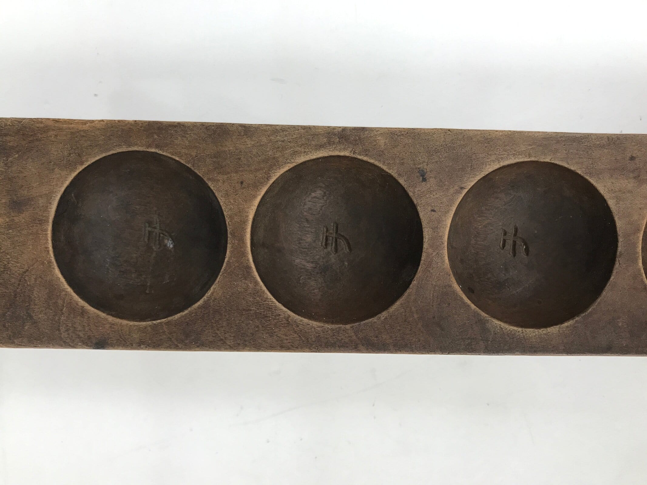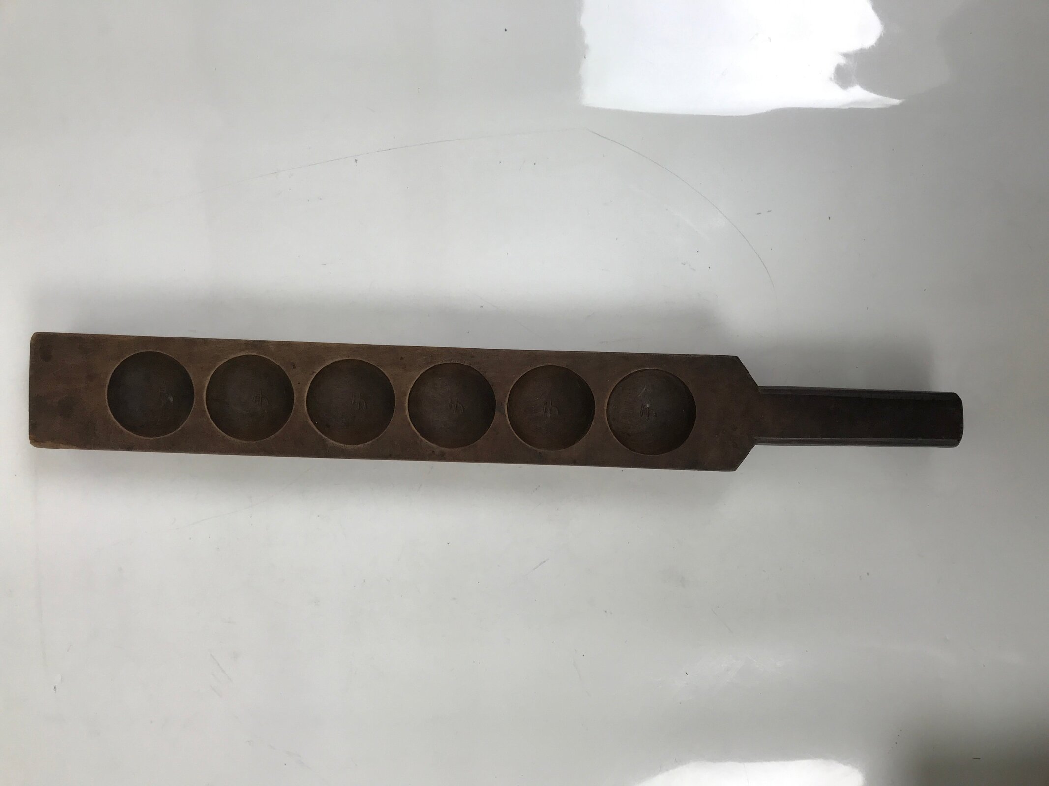 This wooden mold is one panel and in a paddle shape with six round slots that will make a half-sphere shape when used. Each little mold has a モ (mo) katakana character.