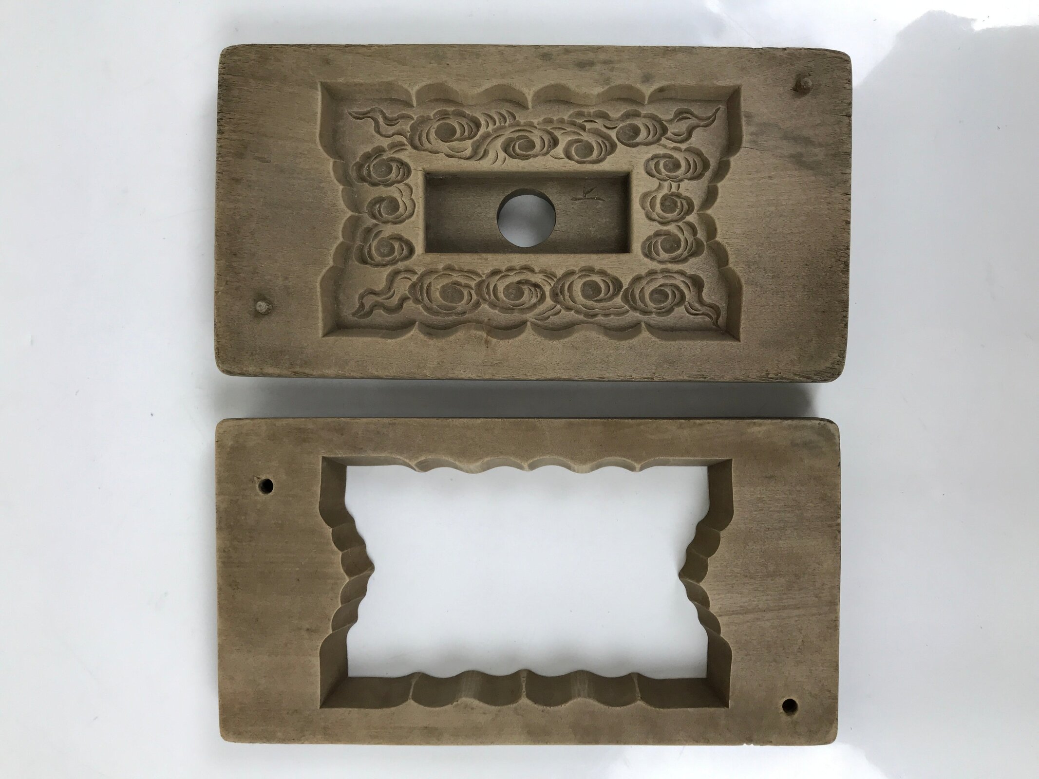 This two-panel kashigata mold is carved with the design of a frame with clouds. There is an empty spot at the center to place a smaller text kashigata piece (not included). This mold can be used to make sweets or as an eye-catching decorative item.