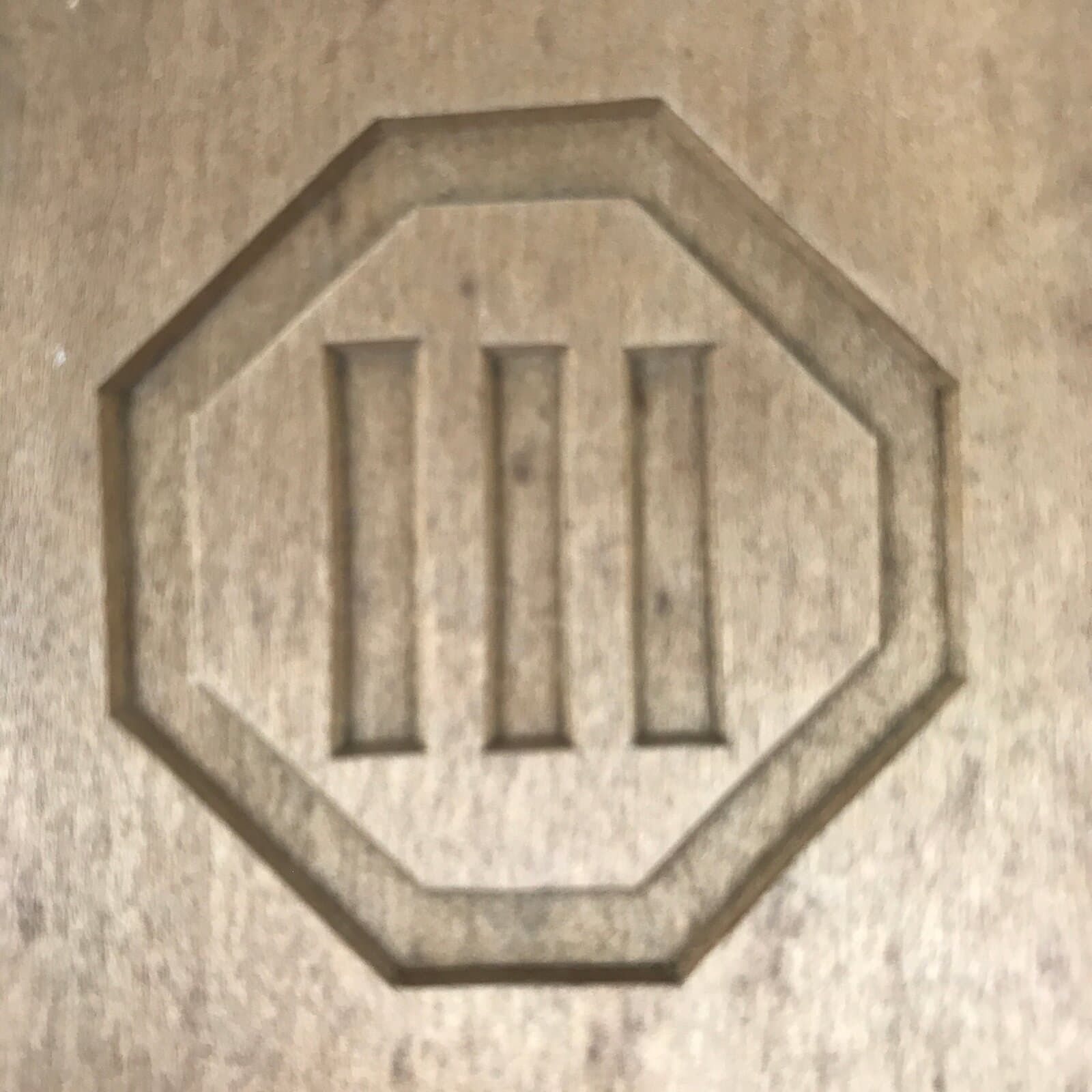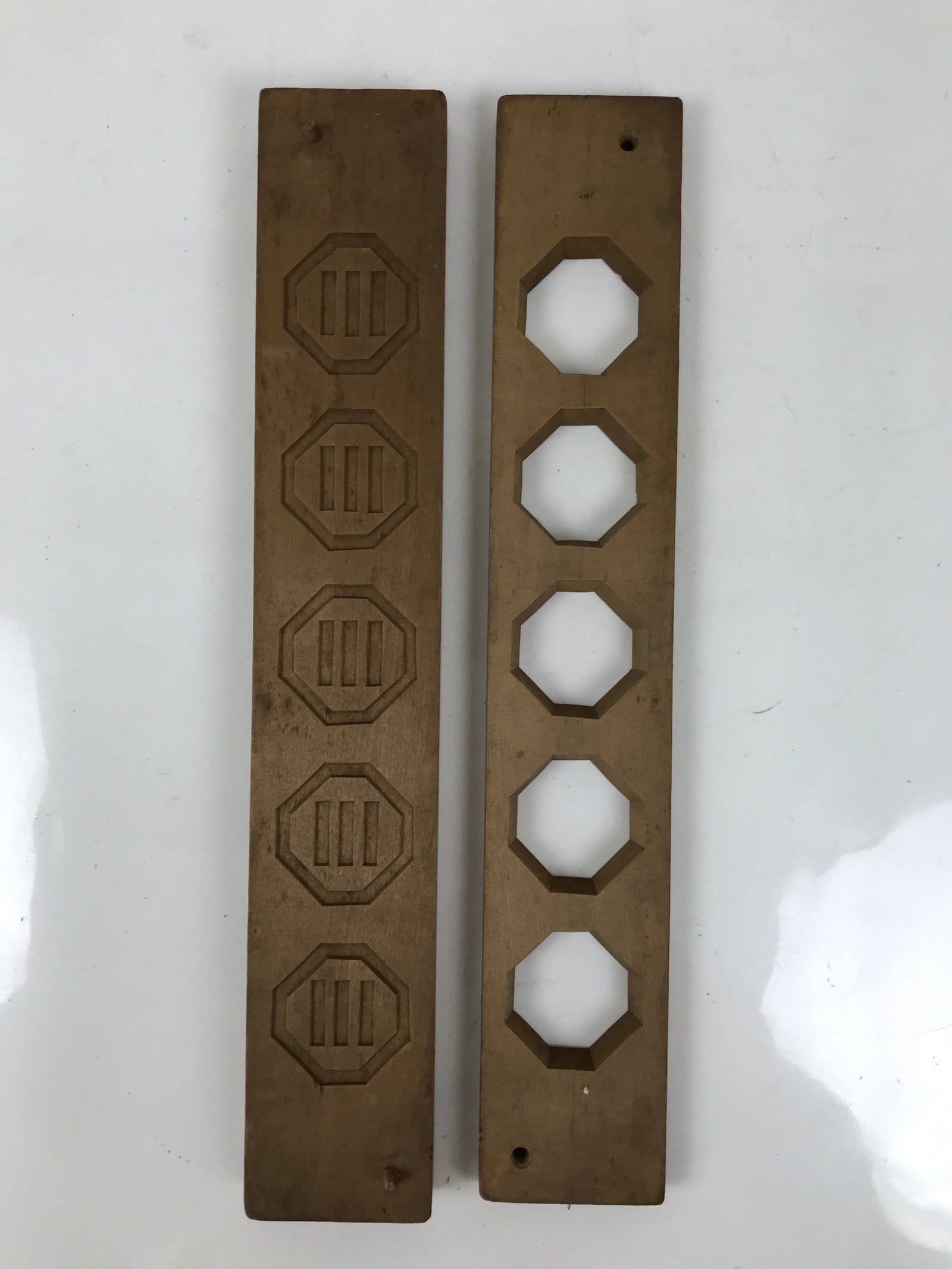 This two-panel kashigata mold is carved with the design of five small hexagonal mon crest symbols. Zuiunji Temple is written on the sides. This mold can be used to make sweets or as an eye-catching decorative item.