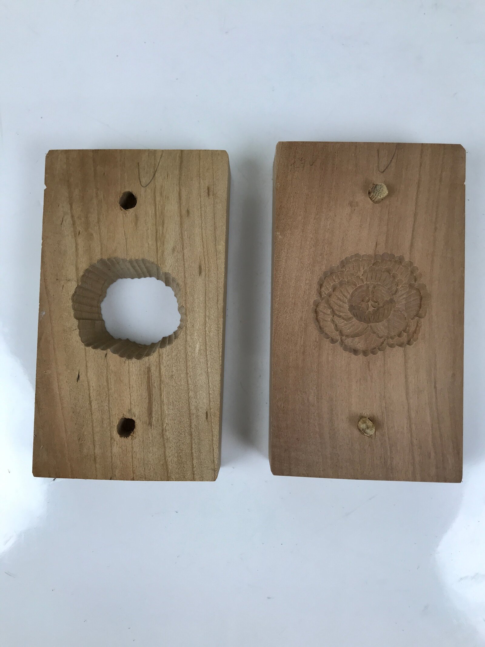 Japanese kashigata are hand-carved wooden molds used to make higashi since the Edo period. Higashi is a broad category of wagashi (traditional Japanese sweets) and is a low-moisture treat made with soybean flour or rice flour, fine sugar, and other ingredients. These materials are packed tightly into kashigata molds and dried to create beautiful designs and shapes. Many of these sweets can be found in wagashi shops and grocery stores still today.