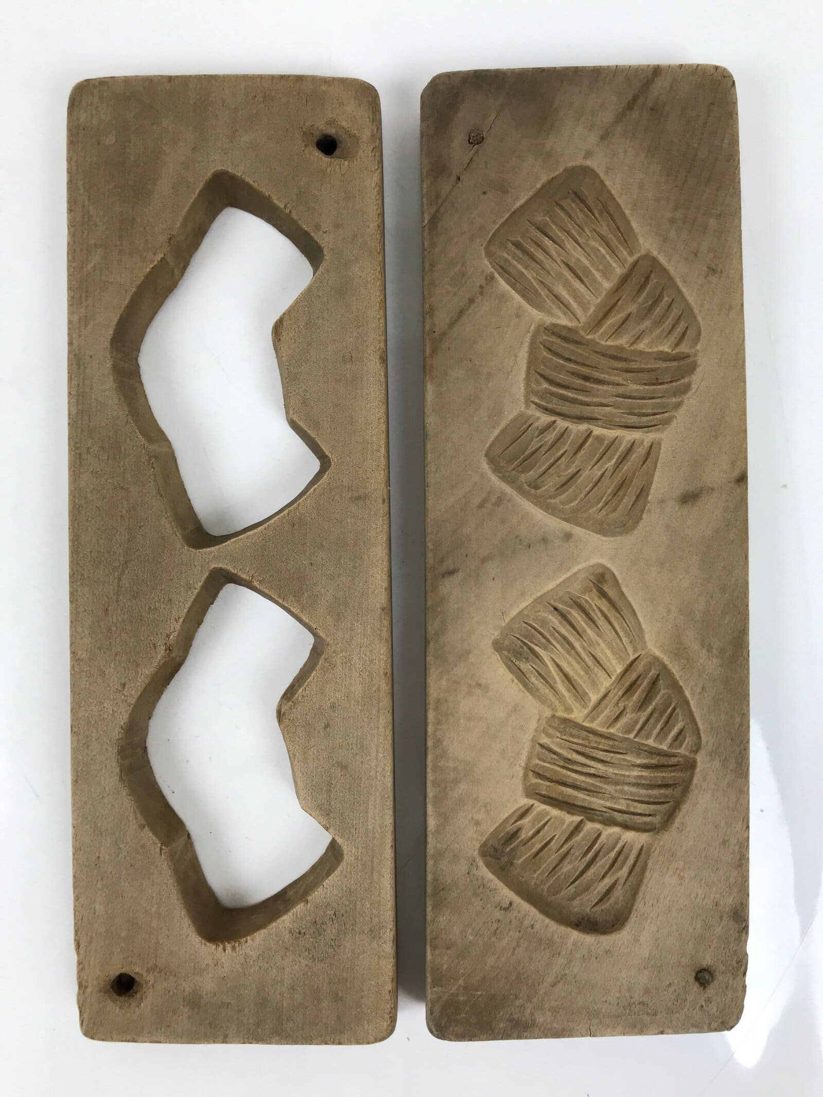 This two-panel kashigata mold is carved with the design of a pair of tied knot of kelp (kombu). Kelp in Japanese cuisine symbolizes good fortune and happiness and its similarity to the word yorokobu which means “happiness” or “celebrate”. As such, kombu is often incorporated into meals of celebratory nature in some manner. This mold can be used to make sweets or as an eye-catching decorative item.