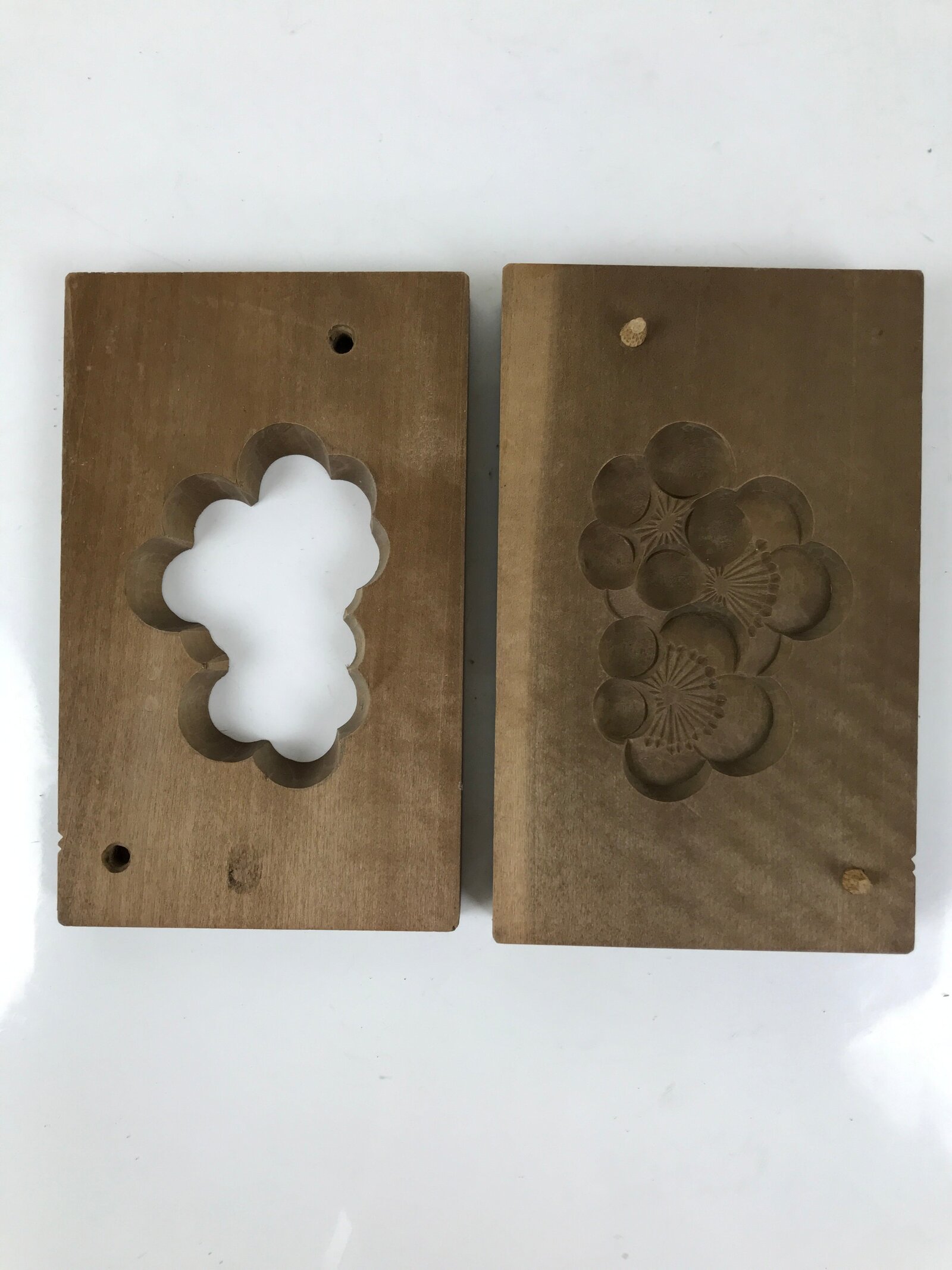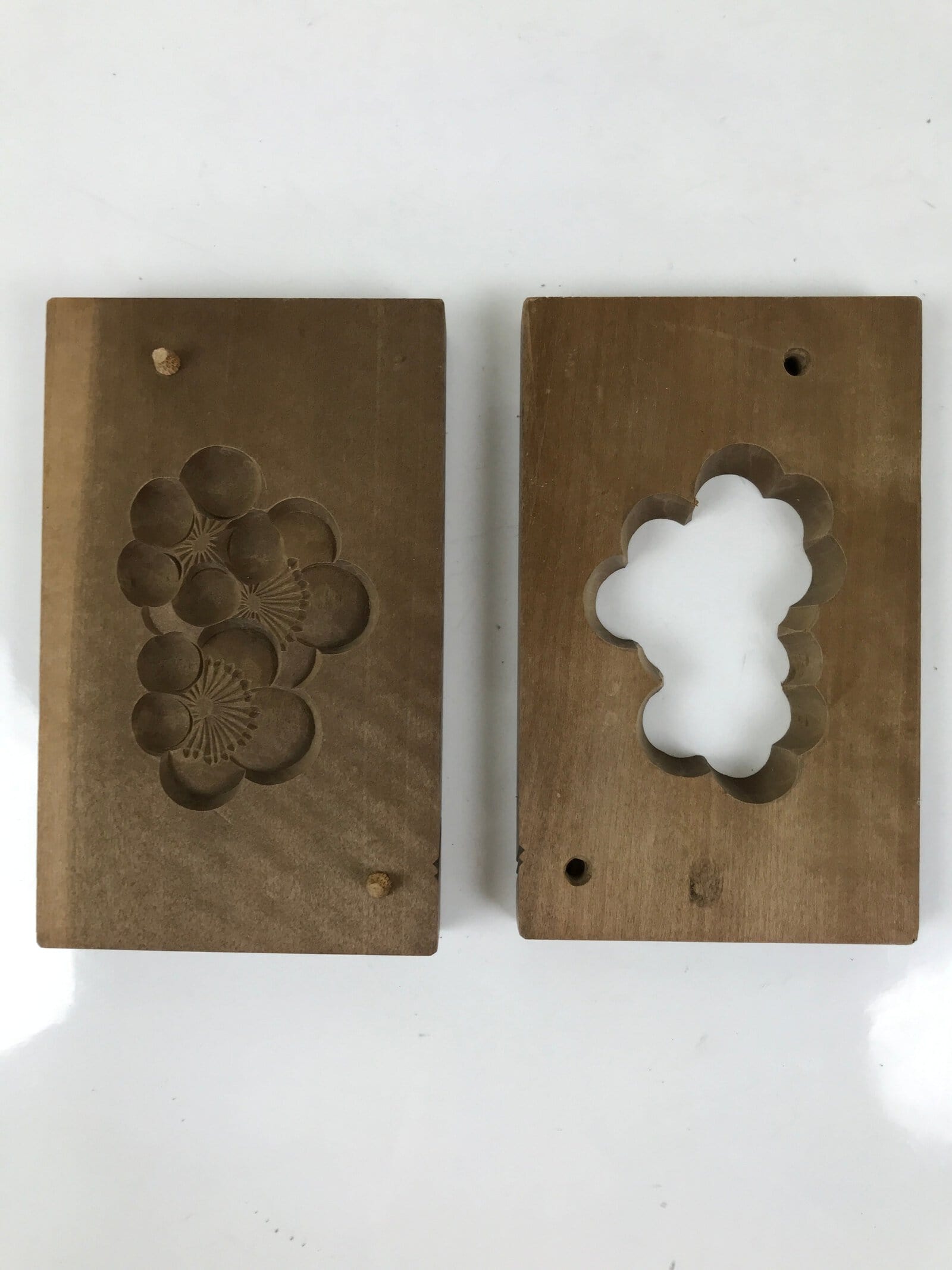 This two-panel kashigata mold is carved with the design of a cluster of plum blossoms (ume). Plum blossoms are a late winter flower that symbolizes renewal, vigor, and beauty. This mold can be used to make sweets or as an eye-catching decorative item.