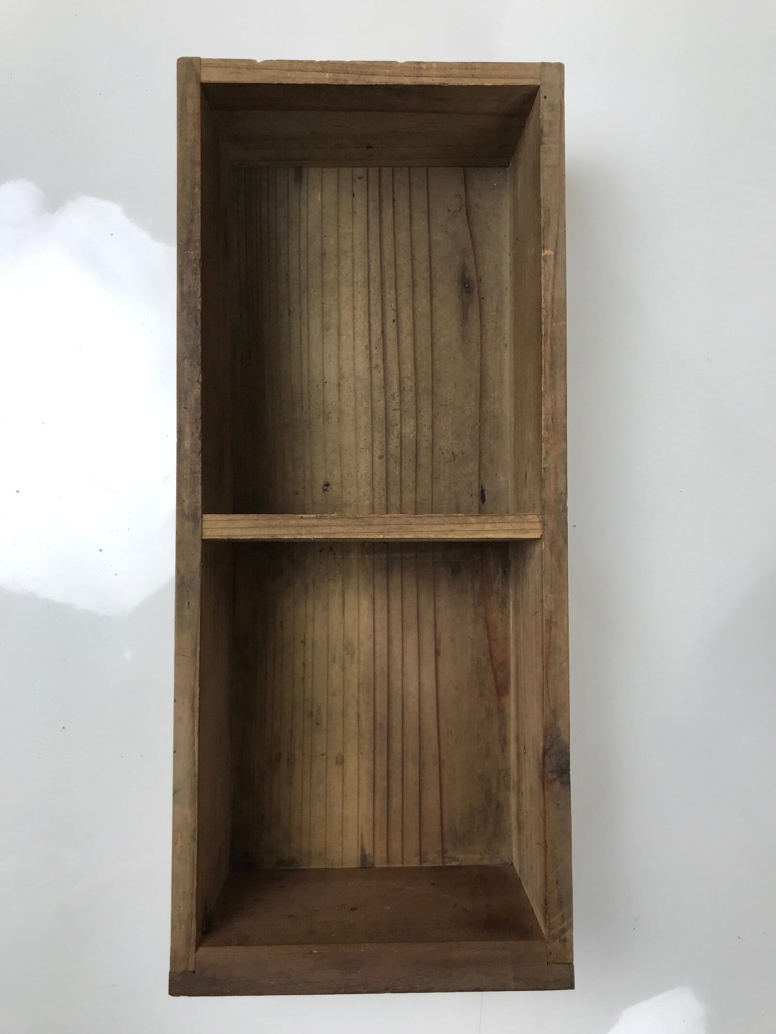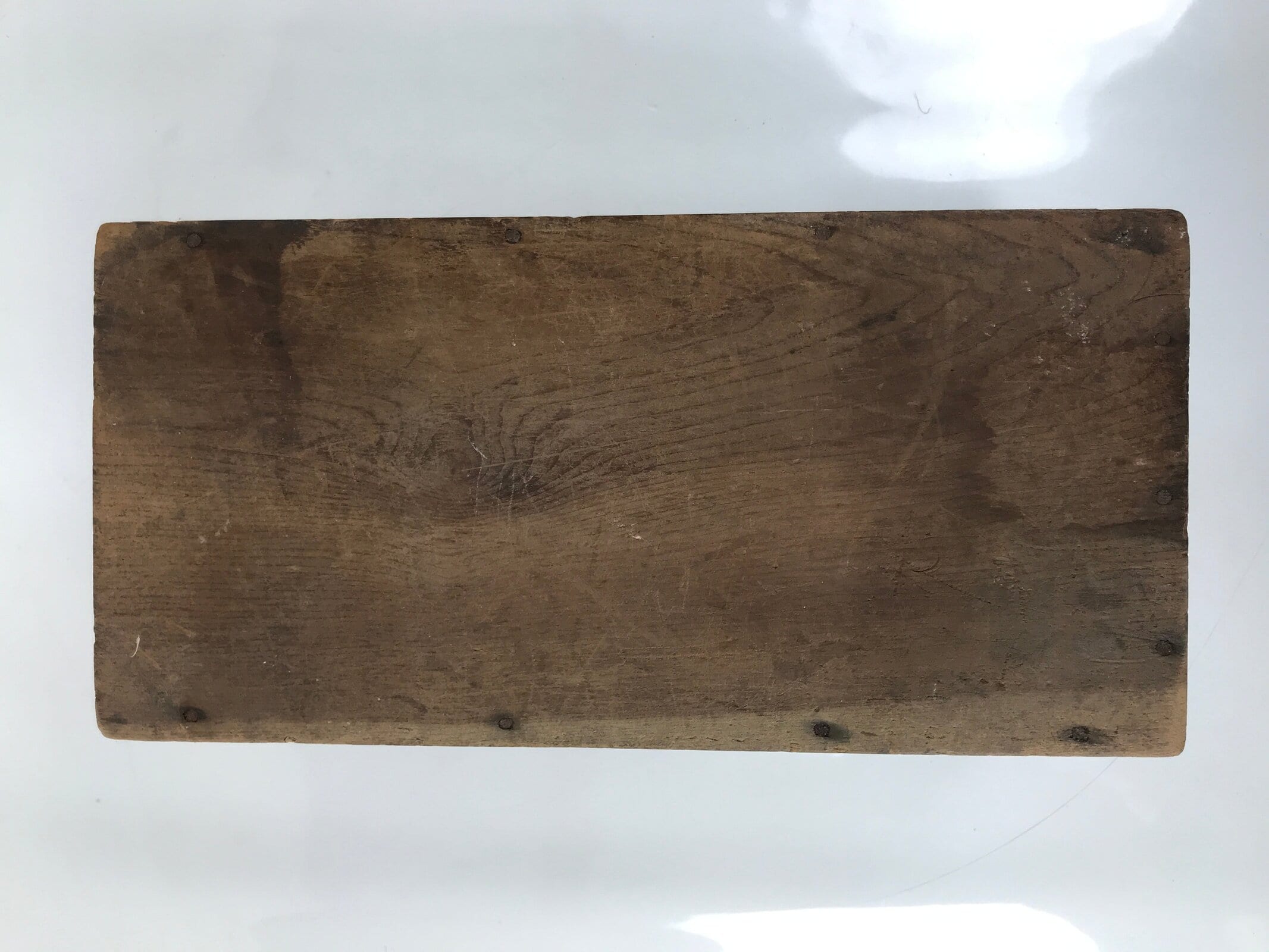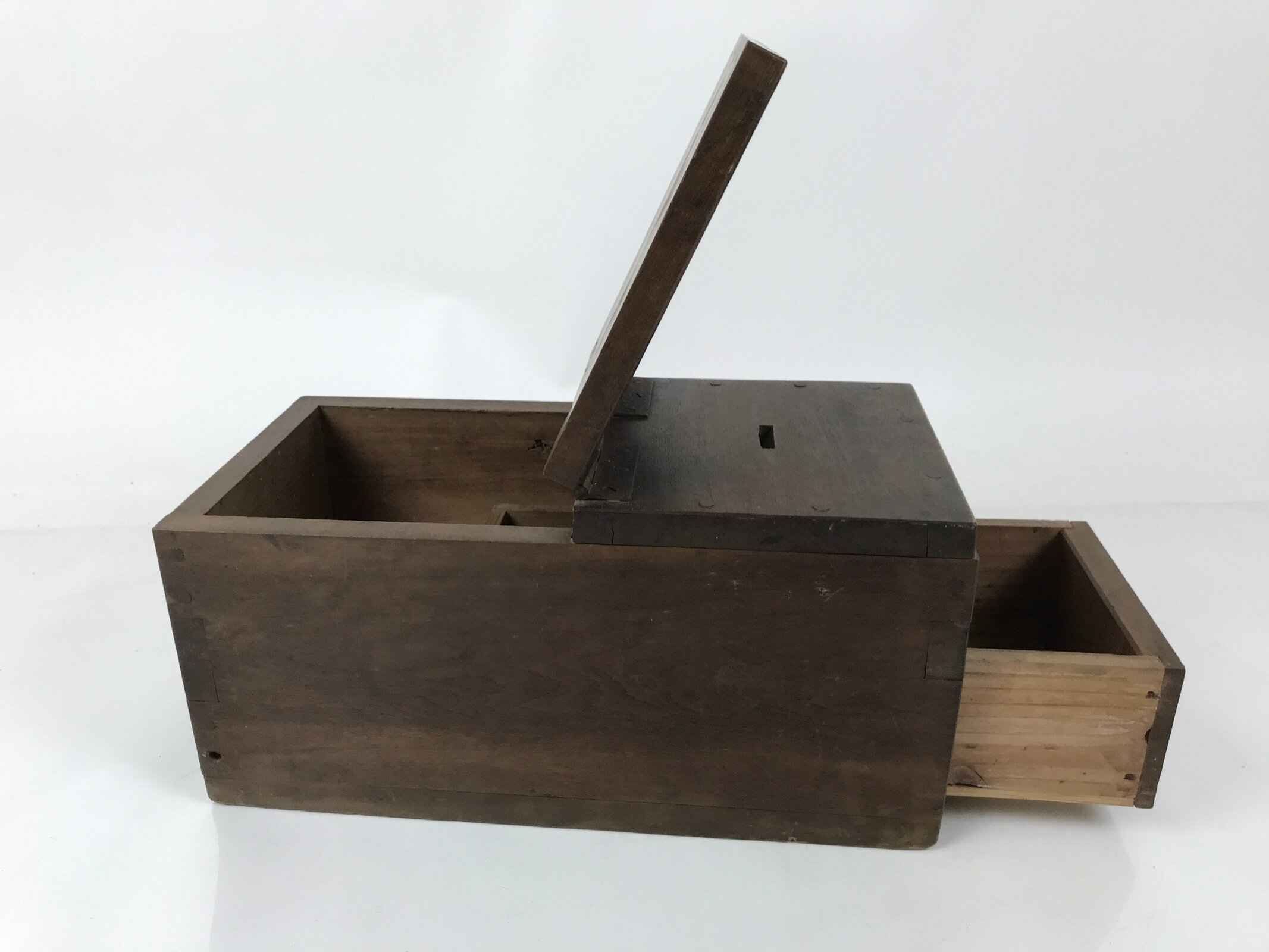 This is an antique Japanese zenibako cash box made of wood. With an angled hole cut out through the top, it is used at places such as temples and shrines, vendor stalls, businesses, etc. It contains one long narrow drawer with two compartments. It uses simple iron metal hinges on the top with one panel that opens to access inside. There is no handle or knob on the drawer for safety and can be pulled out by prying the drawer forward from the inside.