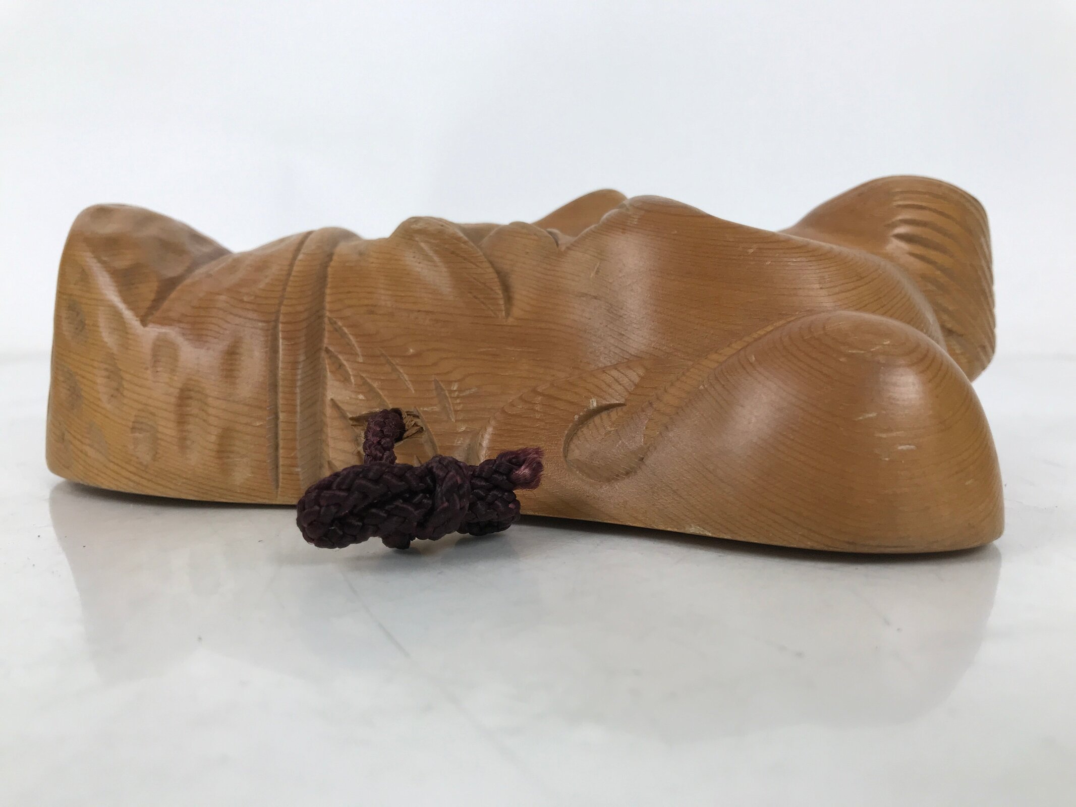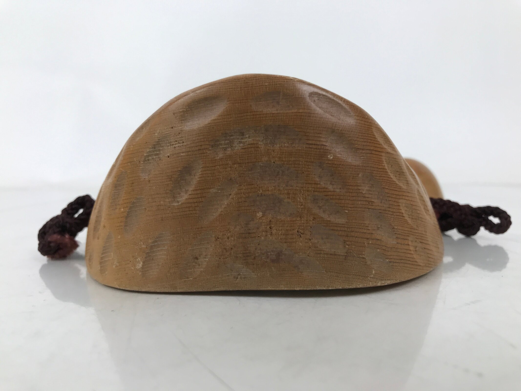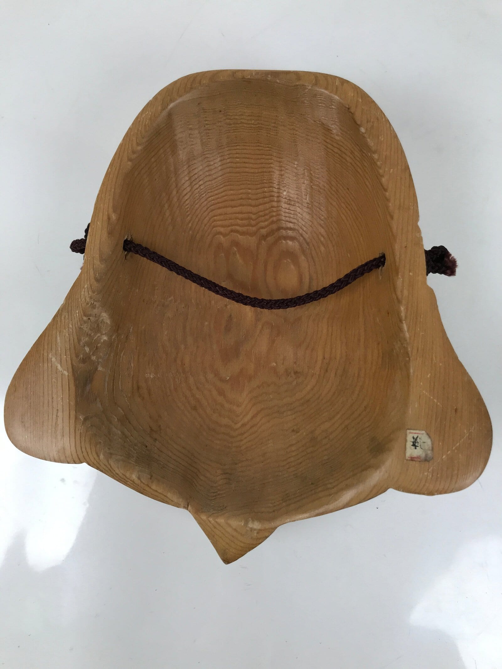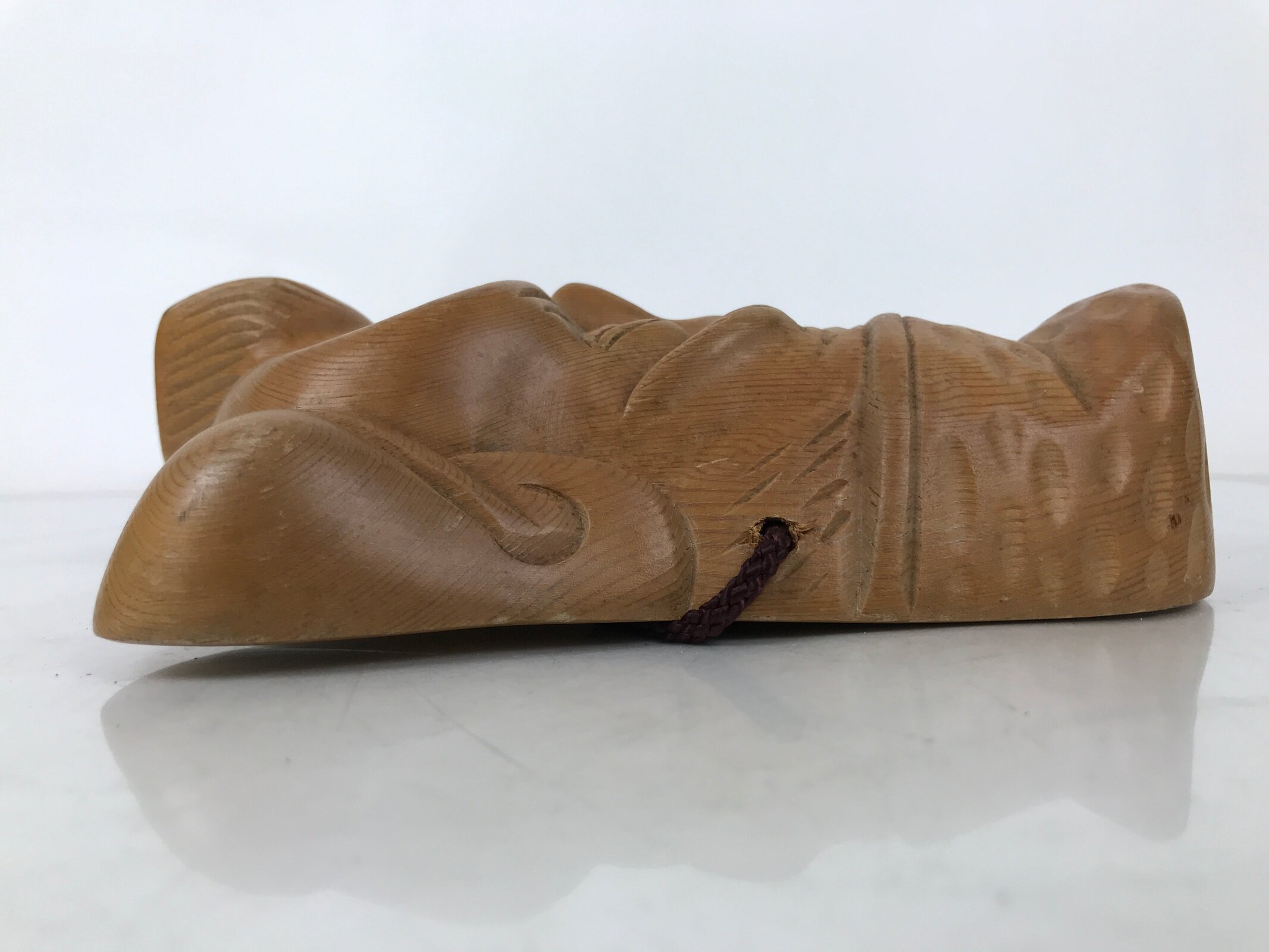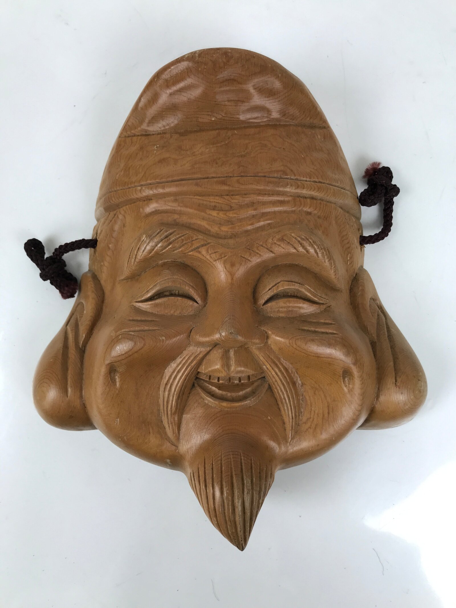 This is a vintage Japanese carved wooden mask (omen) of Ebisu, one of the Seven Lucky Gods. It is brushed with a medium brown with a clear lacquer finish. There is a purple braided corn tied to the back for easy hanging.
