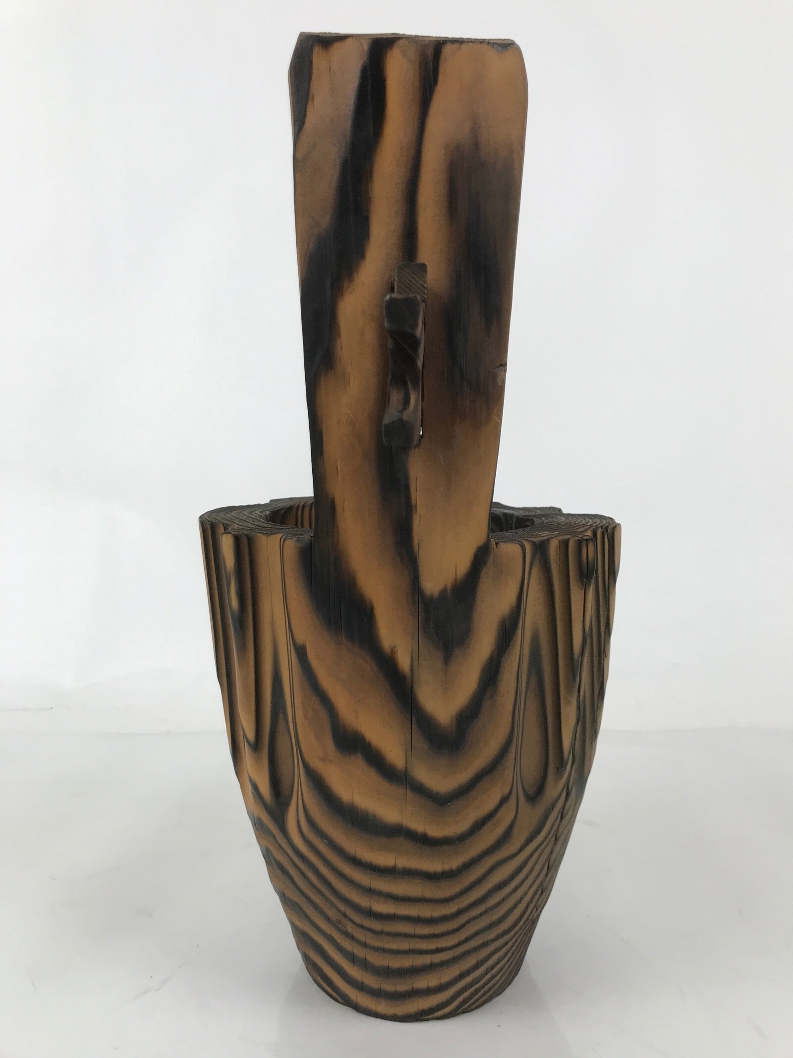This is a vintage Japanese wooden flower vase, or kabin. It is cup-shaped with what appears to be a handle, but it’s been purposefully abstracted for visual appeal. The wood grain has been scorched It has a copper insert to keep the inside of the vase safe from moisture. It can be used for all types of flower arrangements both ikebana and casual bouquet.