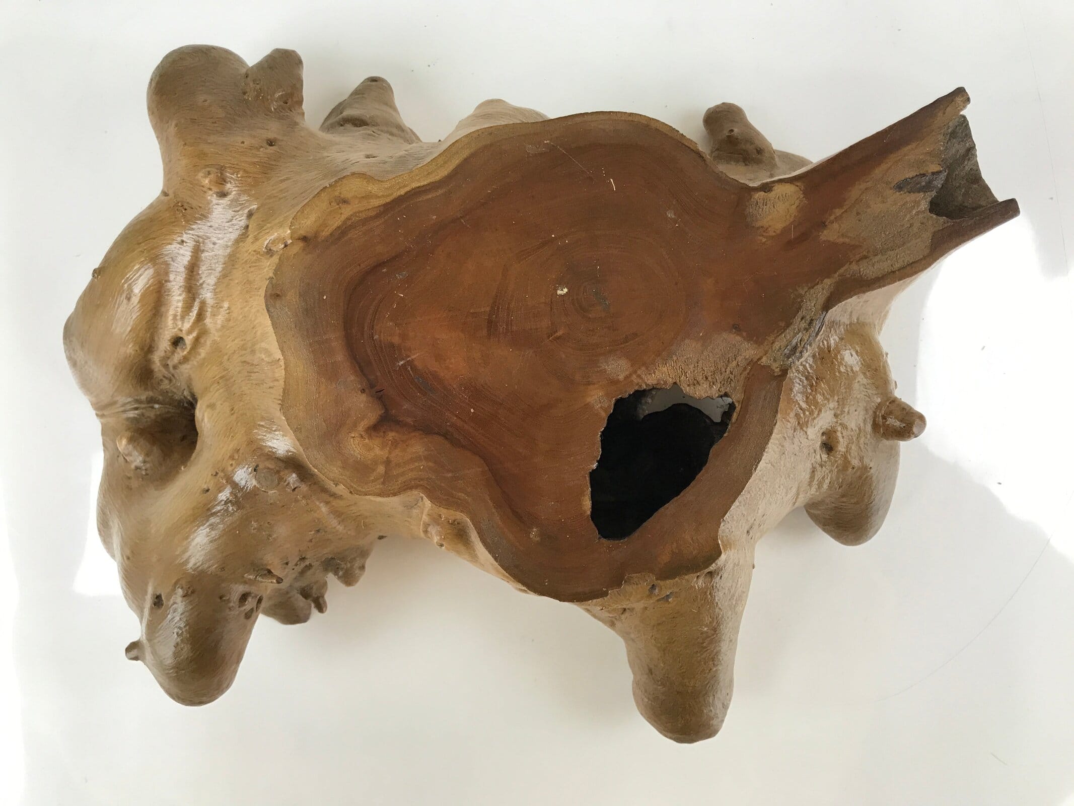Used for the display of flower vases, ikebana arrangements, bonsai, and more, this classic, uniquely shaped kadai is one-of-a-kind, handcrafted from a piece of solid wood (cross-section of a tree trunk). It is stained with a natural brown color with a little bit of shine. The stand has many different grooves and textures on all sides to create visual interest from any angle.