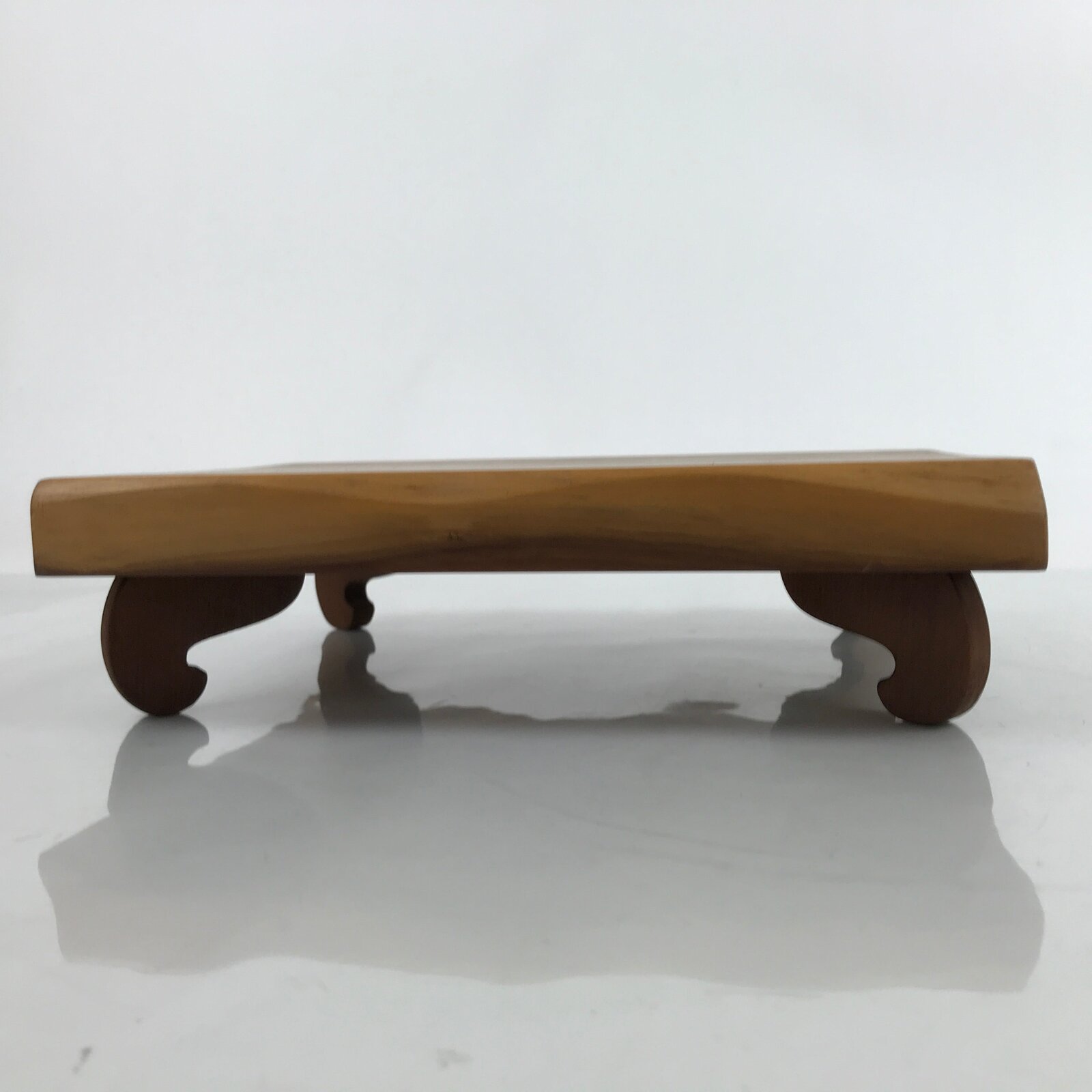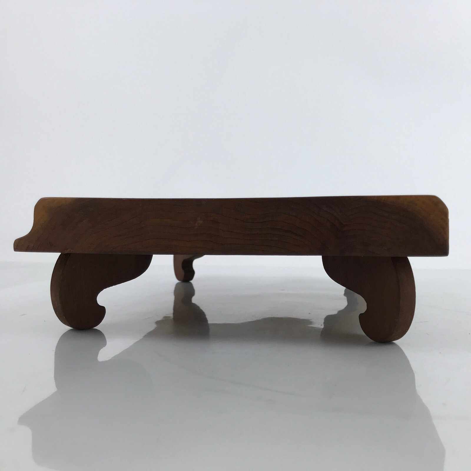 This classic, uniquely shaped kadai is handcrafted from solid wood and is used for displaying flower vases, ikebana arrangements, bonsai, and more. It is one-of-a-kind and handcrafted from a piece of solid wood. It is stained medium brown with a clear brushed lacquer coating. Four small curved legs elevate it. The long sides have a subtle curved shape. This was a congratulatory gift for a business opening, but it was given after the date, wishing the business success and prosperity.