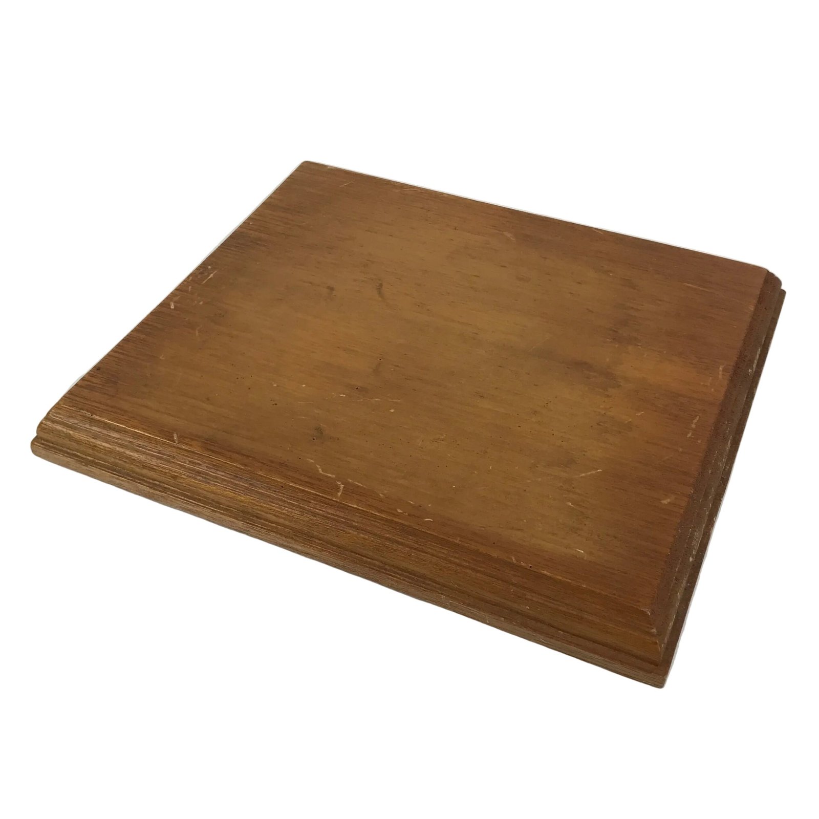 Used for the display of flower vases, ikebana arrangements, bonsai, and more, this rectangular display stand is handcrafted from a piece of solid wood. It is stained a light brown with a clear brushed lacquer coating. It has a modern-style carved edge and is perfect to give a homey look to any ikebana arrangement.