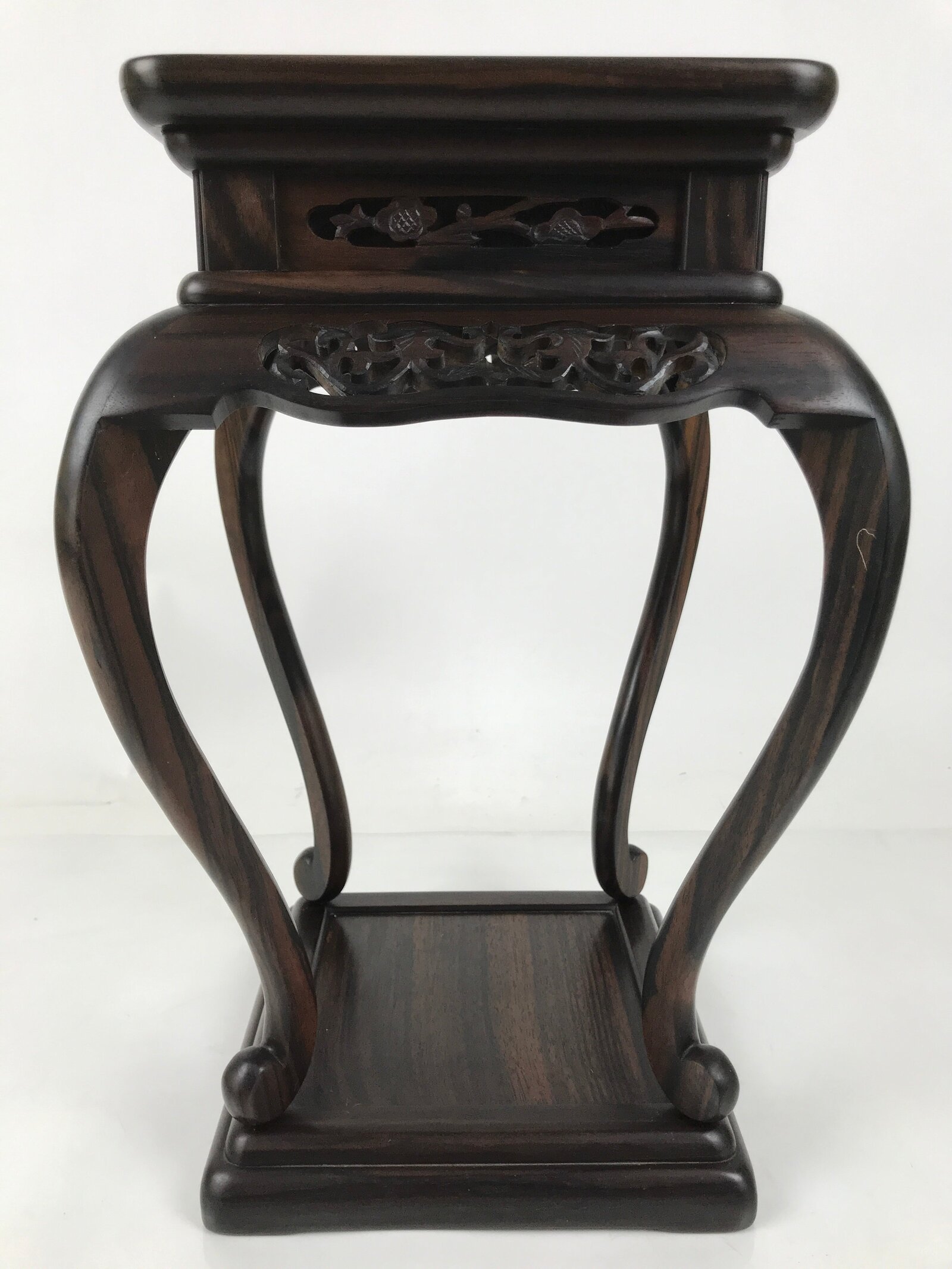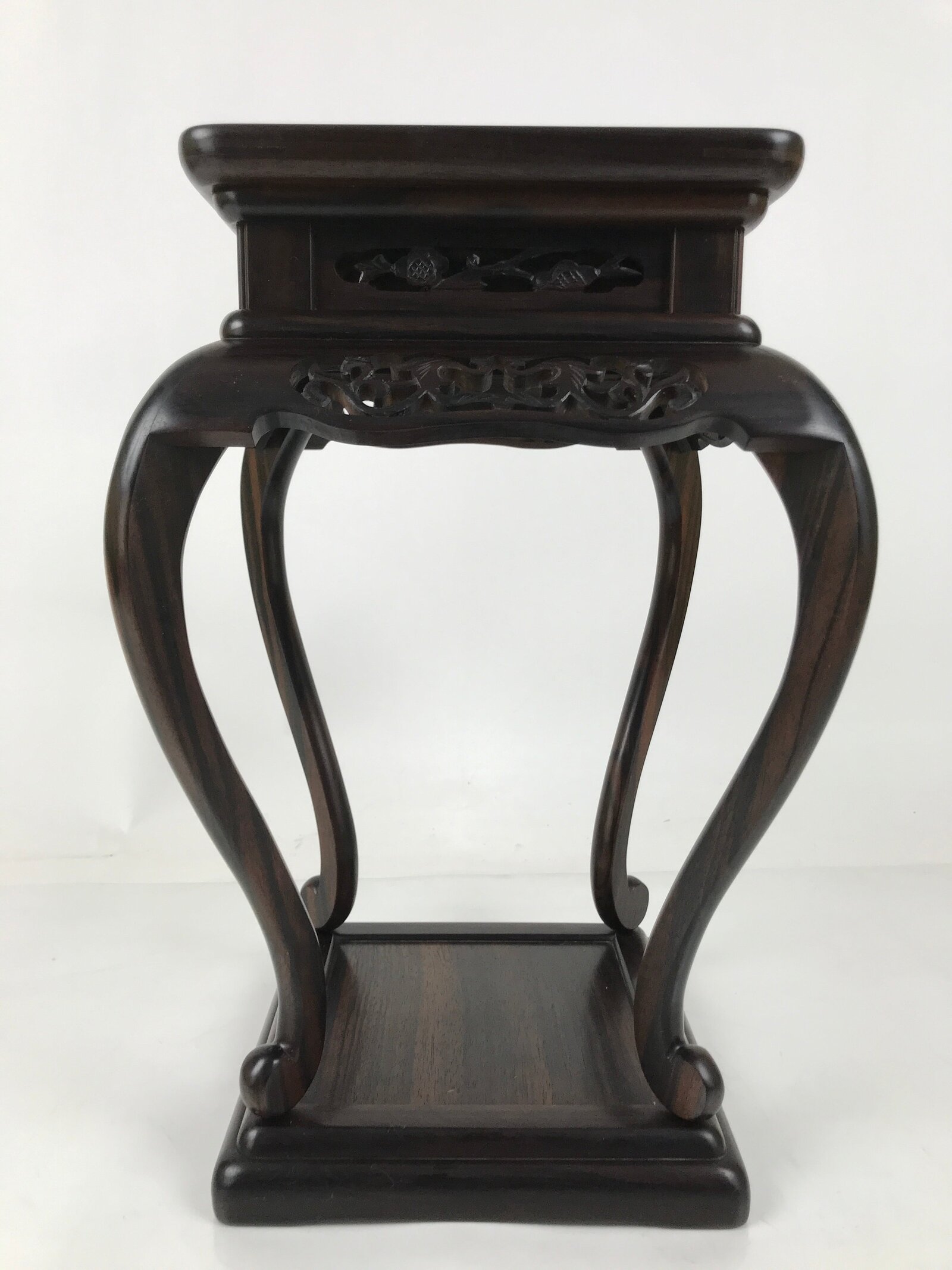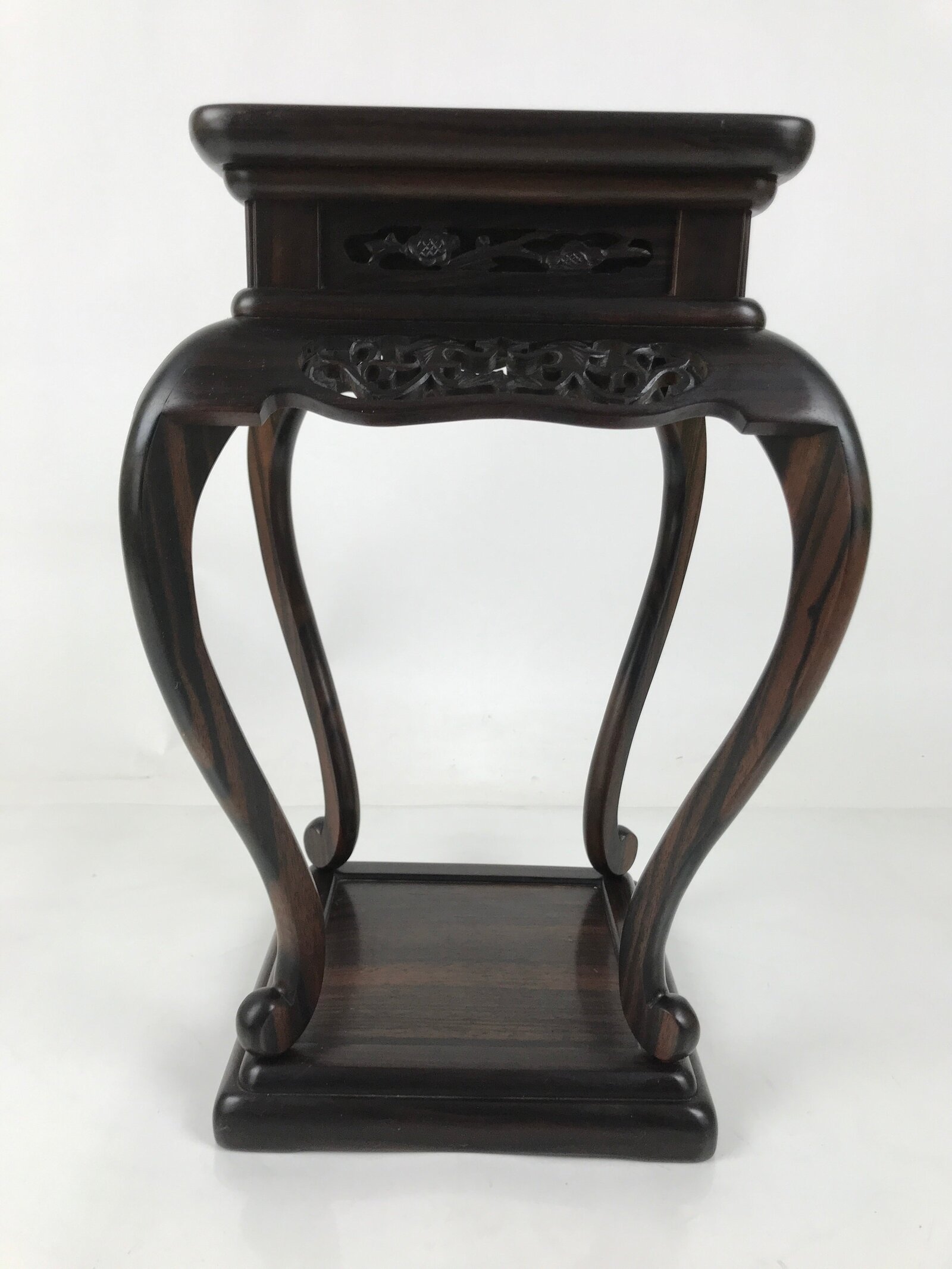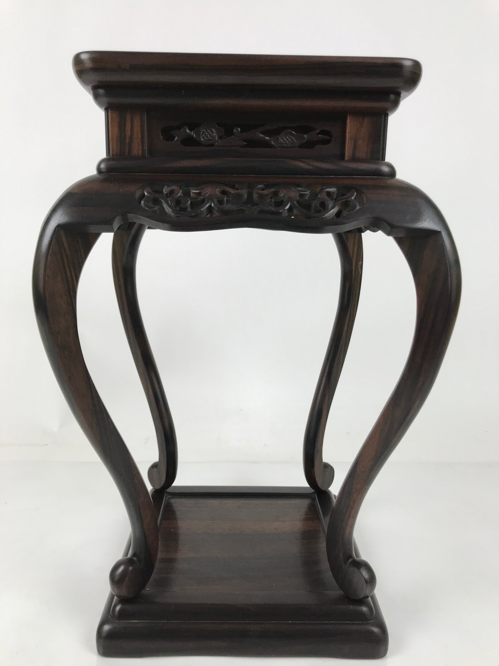 Used for the display of flower vases, ikebana arrangements, bonsai, and more, this beautifully detailed kadai table has a beautiful dark brown brushed lacquer matte finish. A few notable details include long, elegantly curved legs and a carved floral openwork design on all sides. It is very steady on a flat surface despite its height and shape. The bottom base also has a space roughly the same size as the top surface for another small vase or other decorative item.