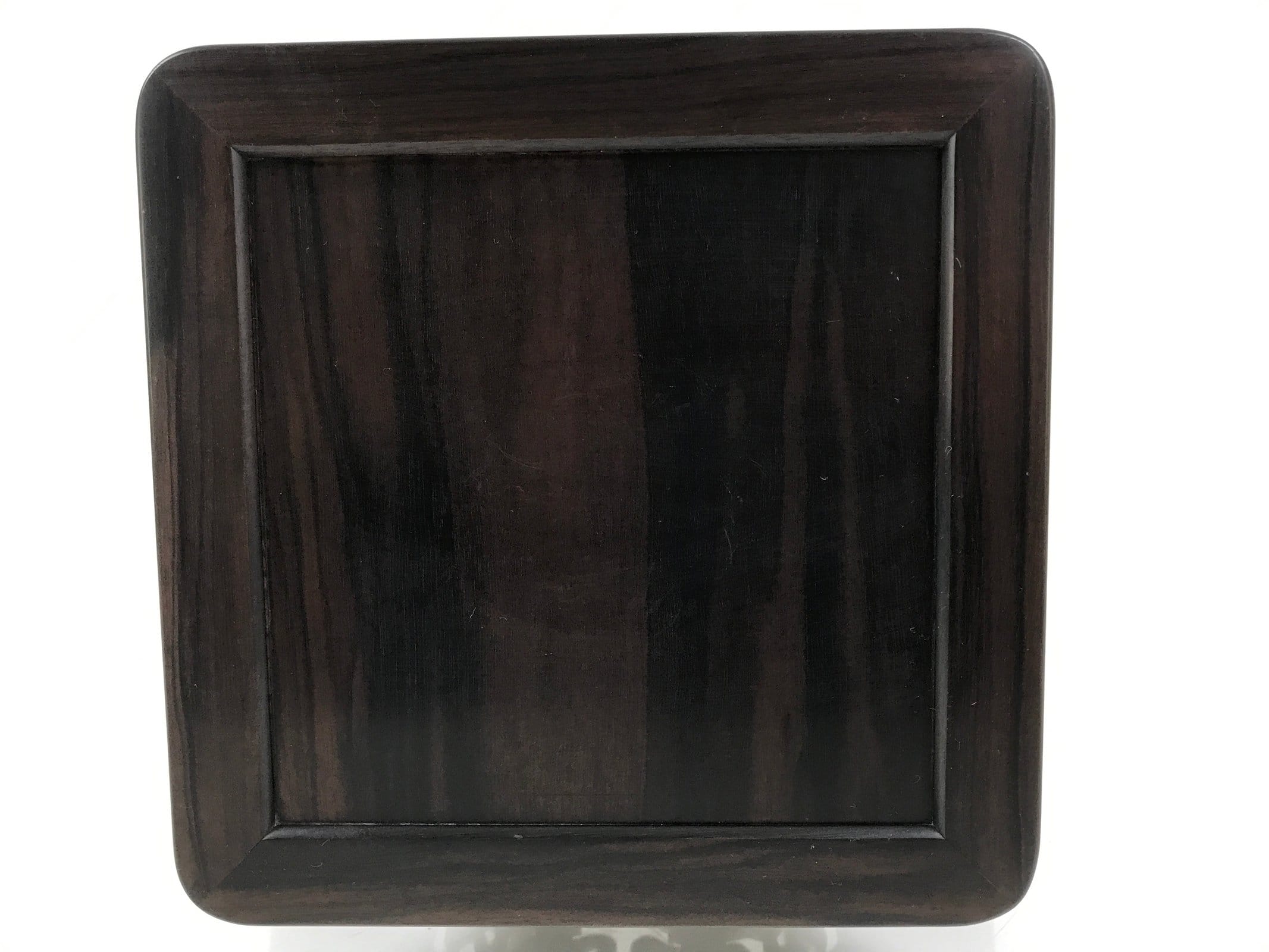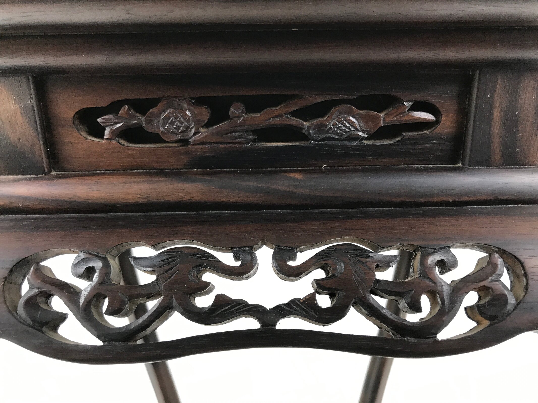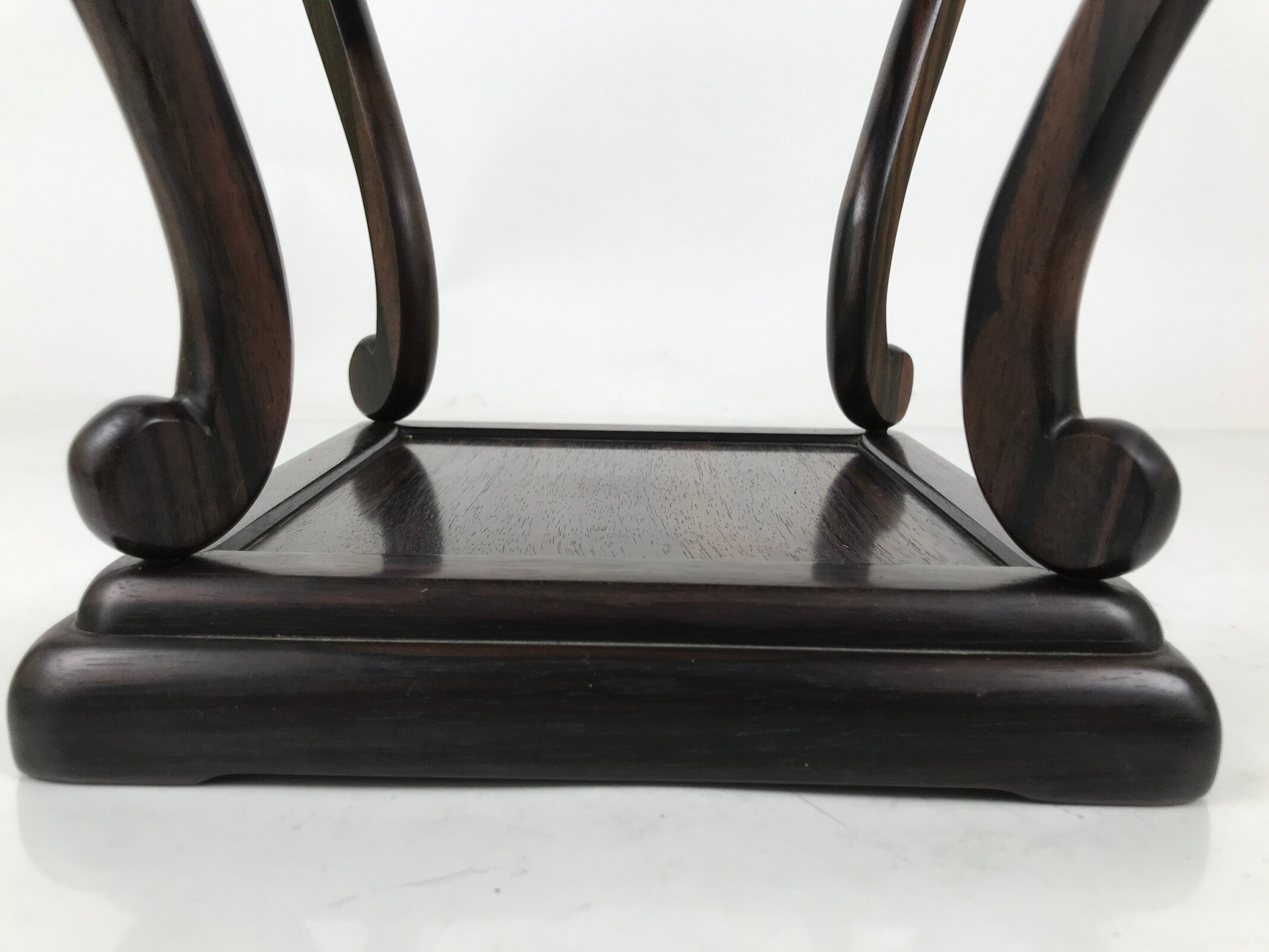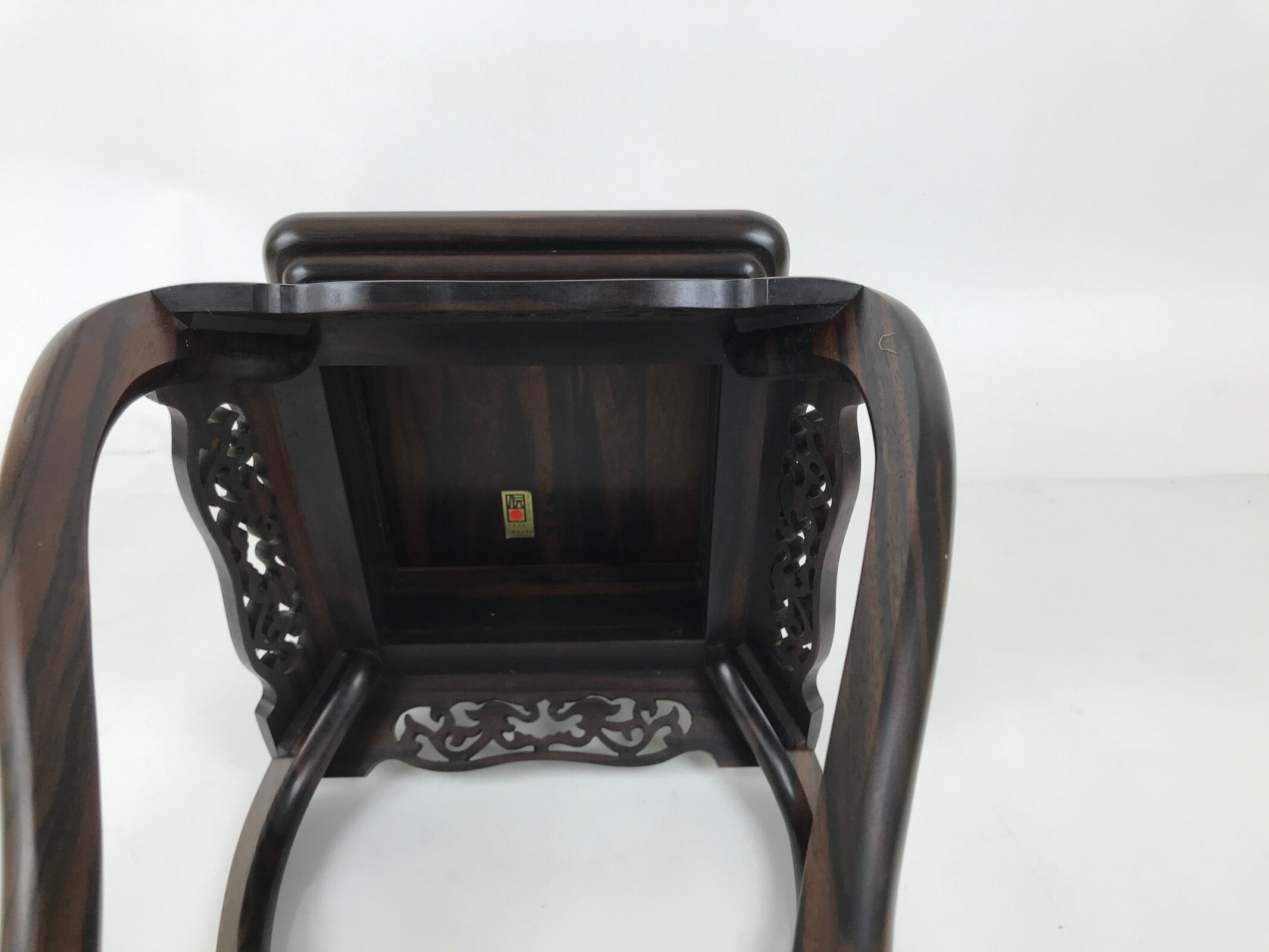 Used for the display of flower vases, ikebana arrangements, bonsai, and more, this beautifully detailed kadai table has a beautiful dark brown brushed lacquer matte finish. A few notable details include long, elegantly curved legs and a carved floral openwork design on all sides. It is very steady on a flat surface despite its height and shape. The bottom base also has a space roughly the same size as the top surface for another small vase or other decorative item.