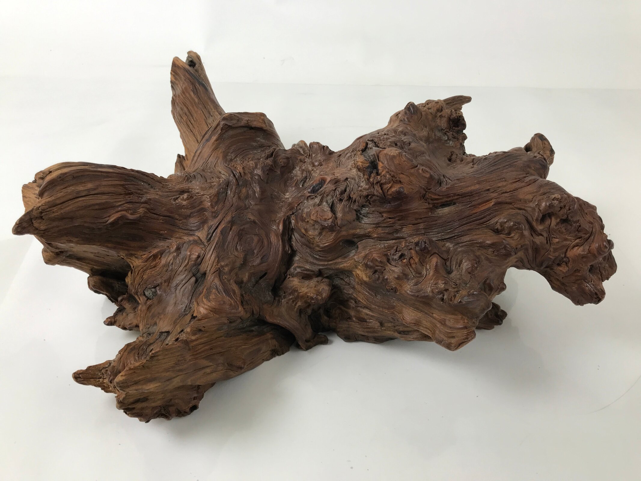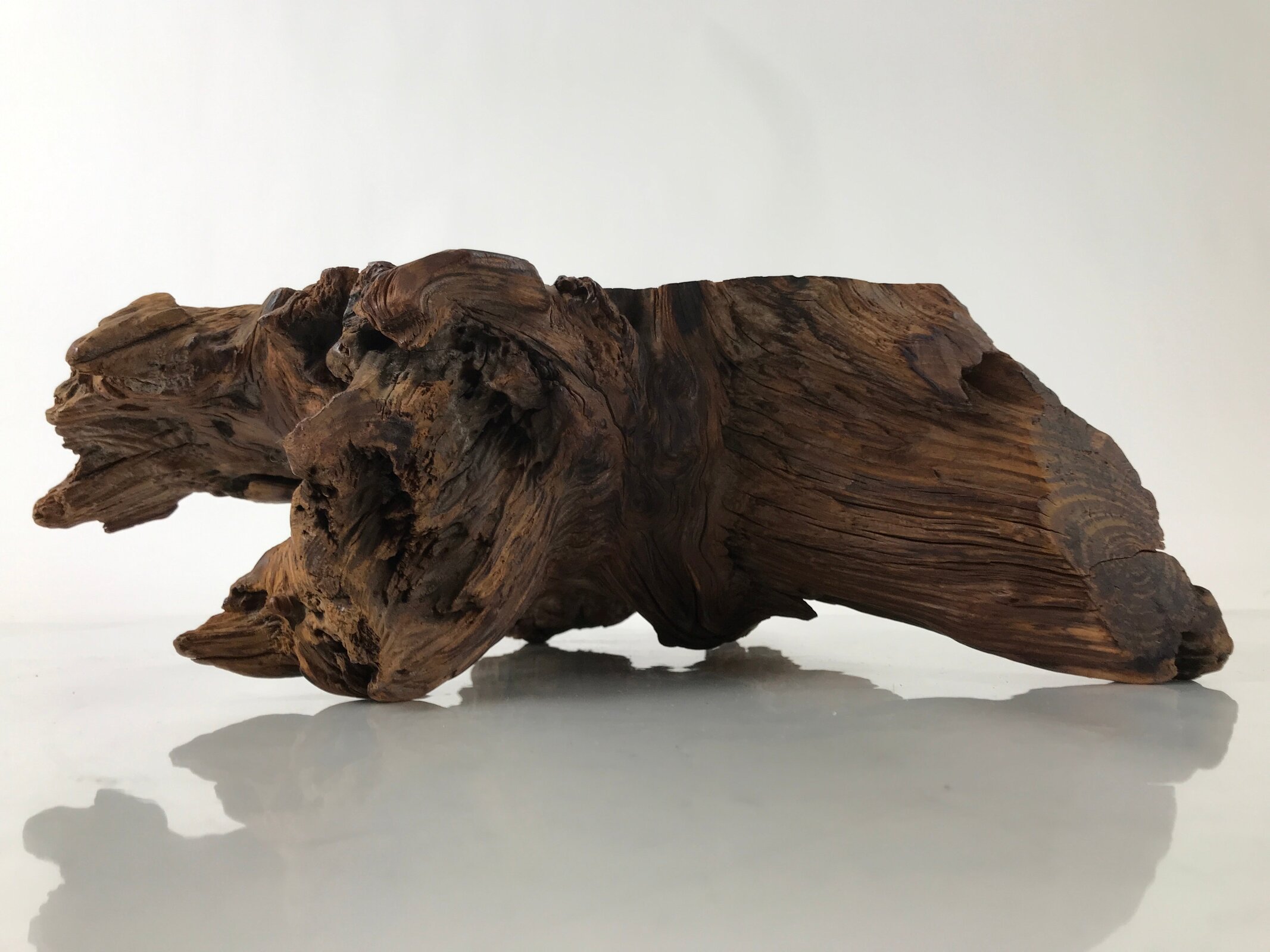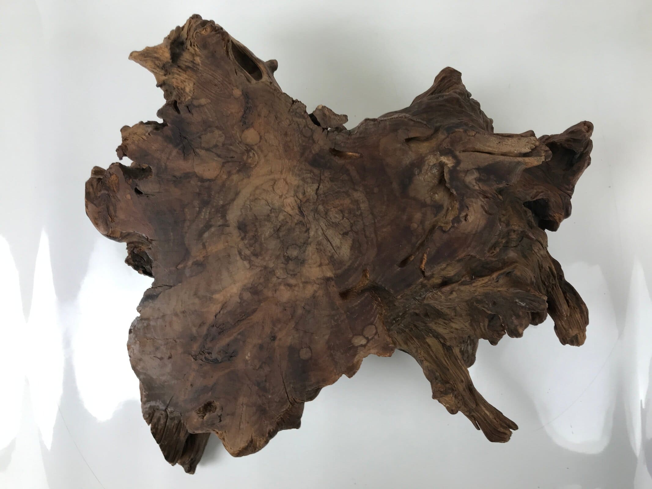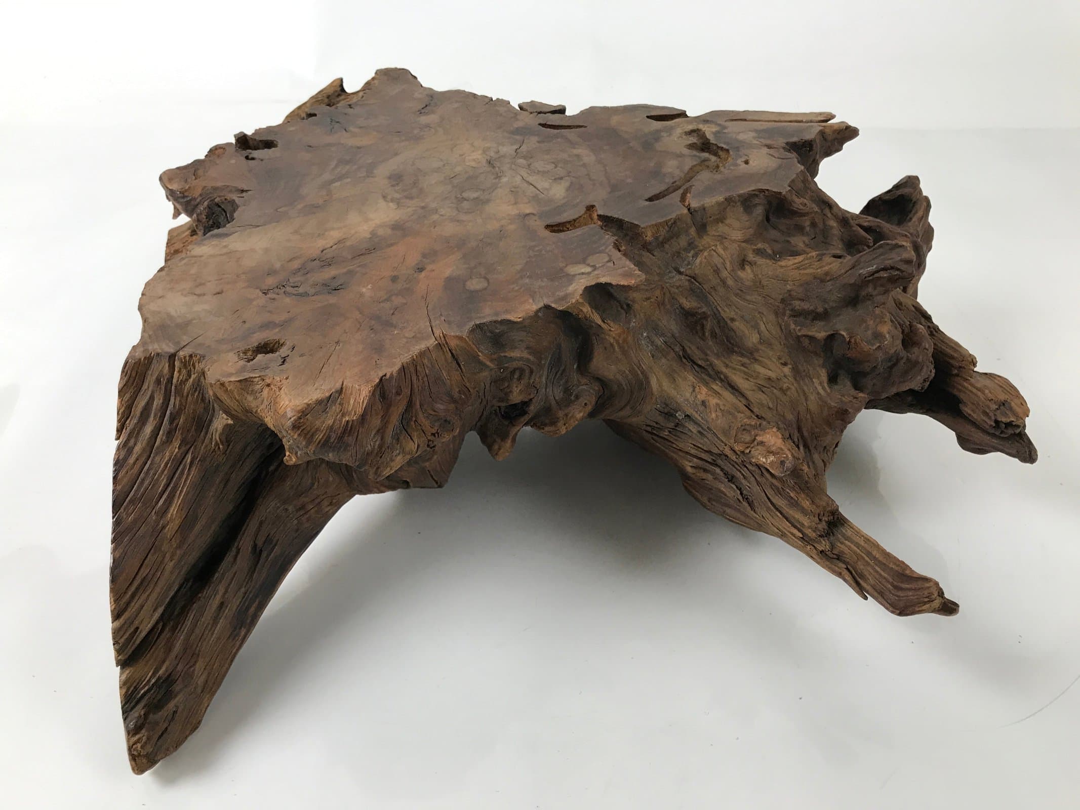 Used for the display of flower vases, ikebana arrangements, bonsai, and more, this uniquely shaped sculptural kadai is one-of-a-kind, handcrafted from a piece of solid wood (cross-section of a tree trunk/roots). It is stained with a dark brown color that accentuates the natural wood grain. The stand has many different grooves and textures on all sides to create visual interest from any angle.