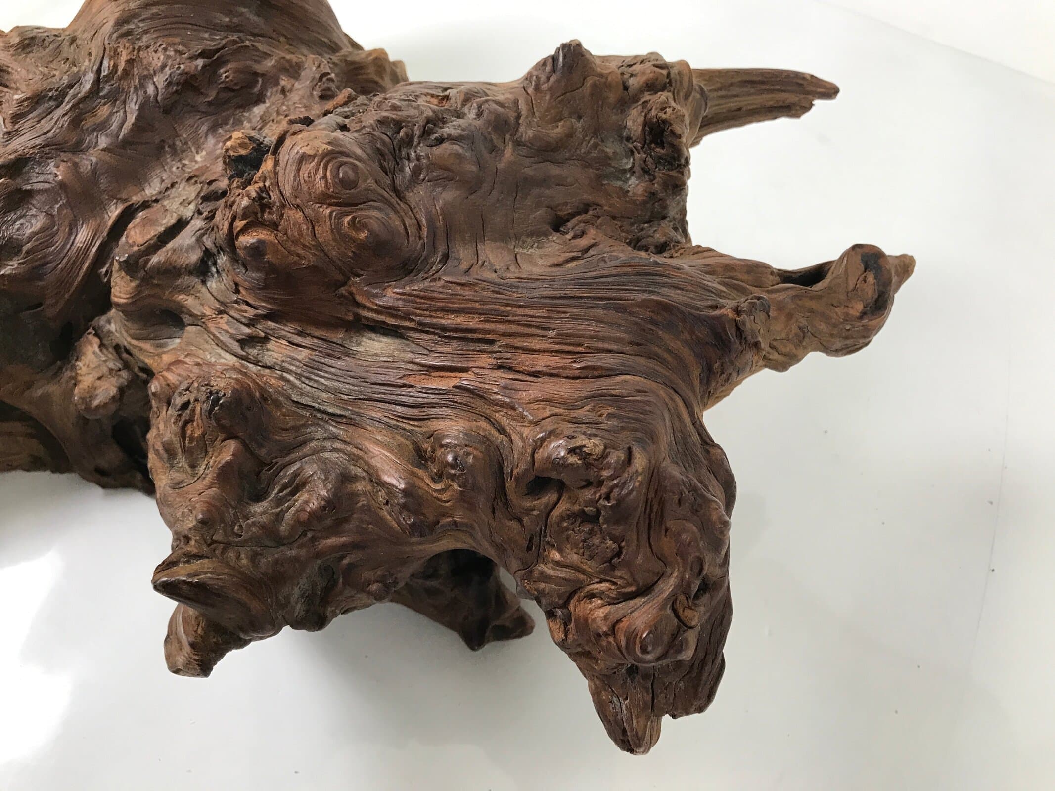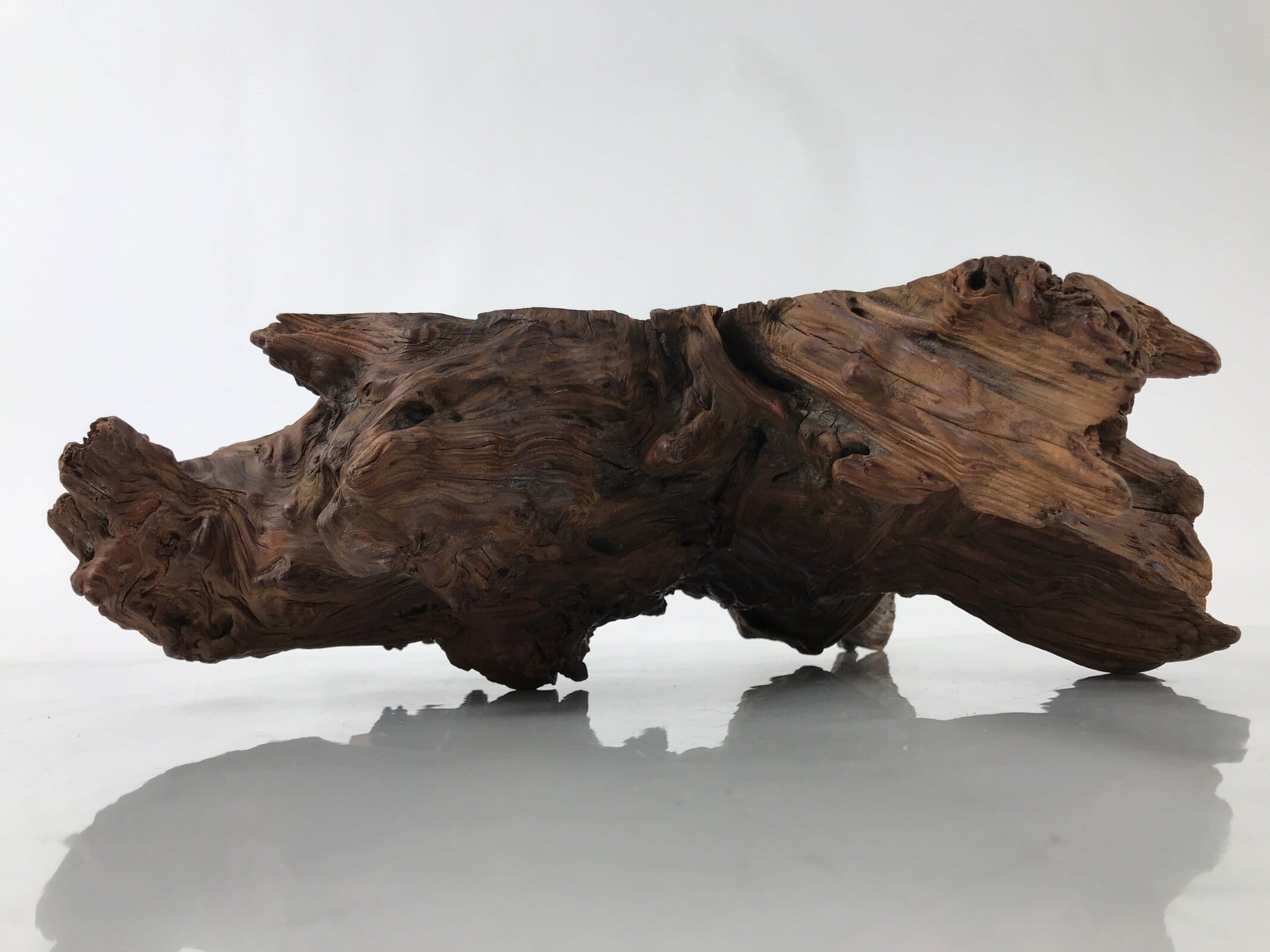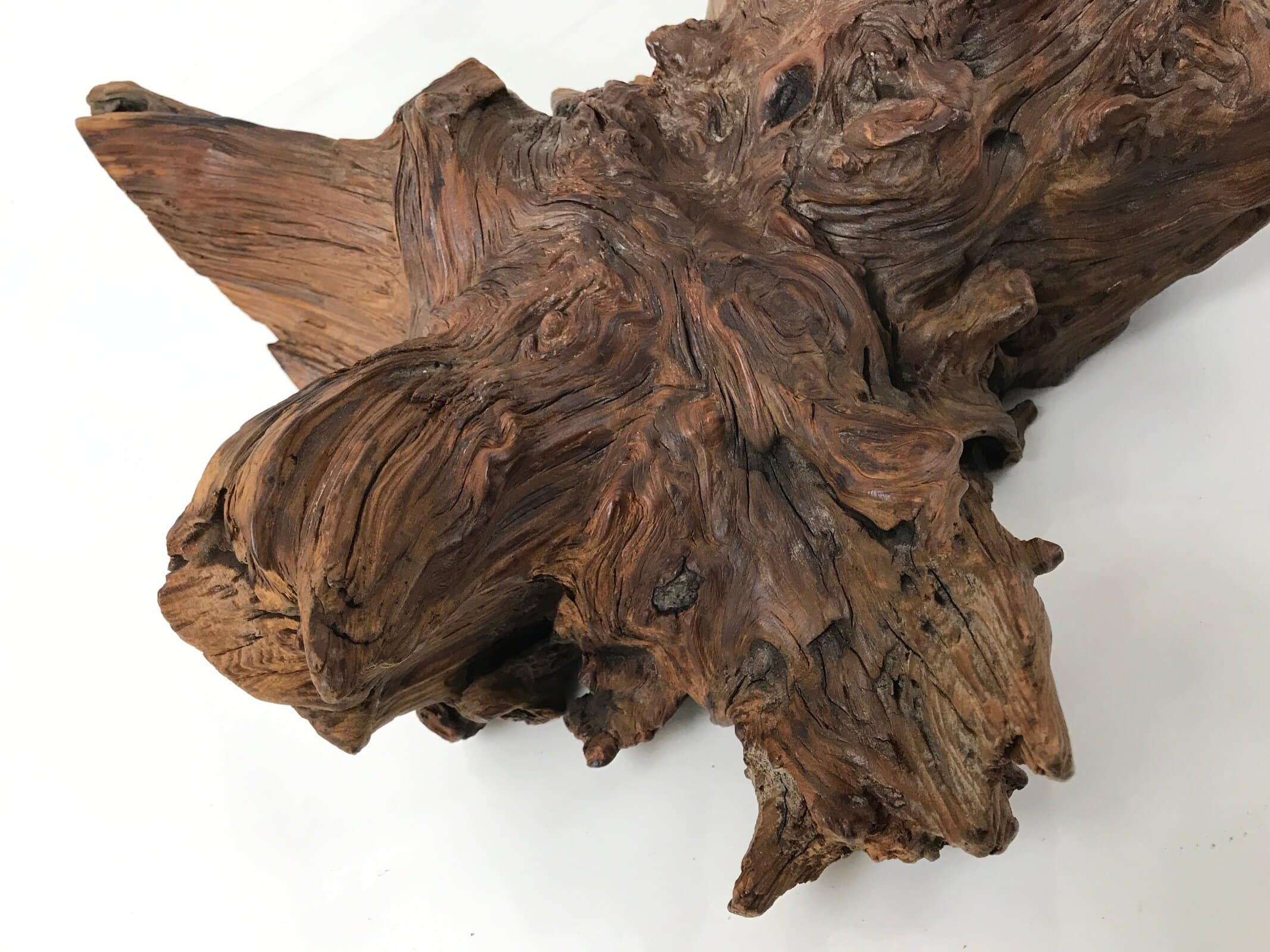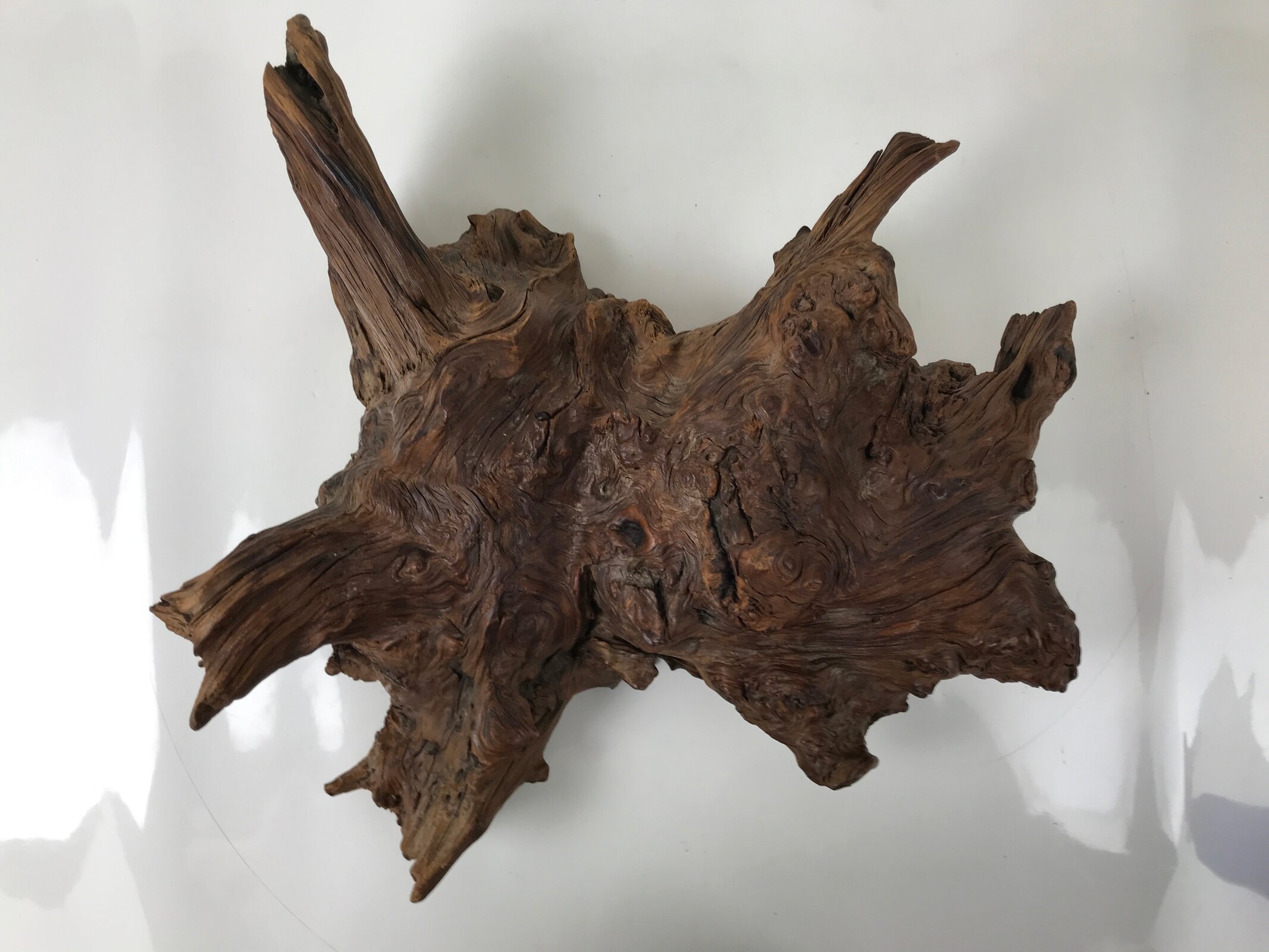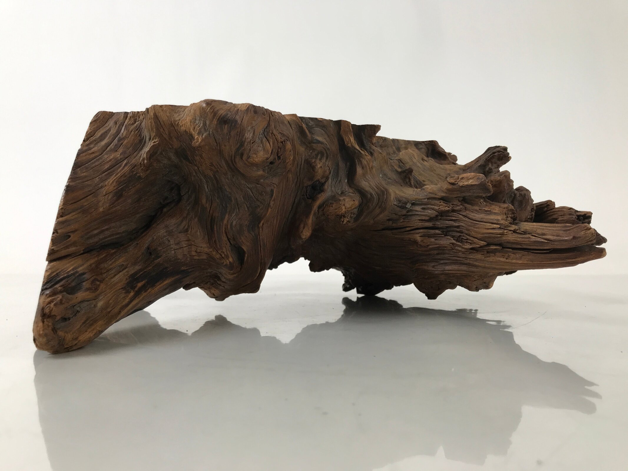 Used for the display of flower vases, ikebana arrangements, bonsai, and more, this uniquely shaped sculptural kadai is one-of-a-kind, handcrafted from a piece of solid wood (cross-section of a tree trunk/roots). It is stained with a dark brown color that accentuates the natural wood grain. The stand has many different grooves and textures on all sides to create visual interest from any angle.